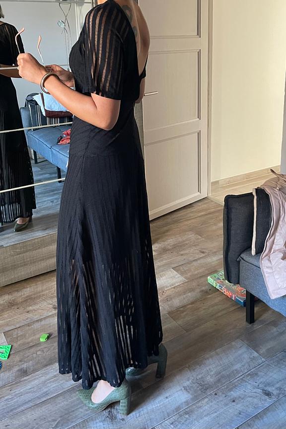 Pensez à associer cette robe avec des sandales dorées pour une allure estivale éblouissante. Parfaite pour les soirées d'été. • Robe longue • Manches courtes • Décolleté plongeant dans le dos • Tissu ajouré • Rayures
