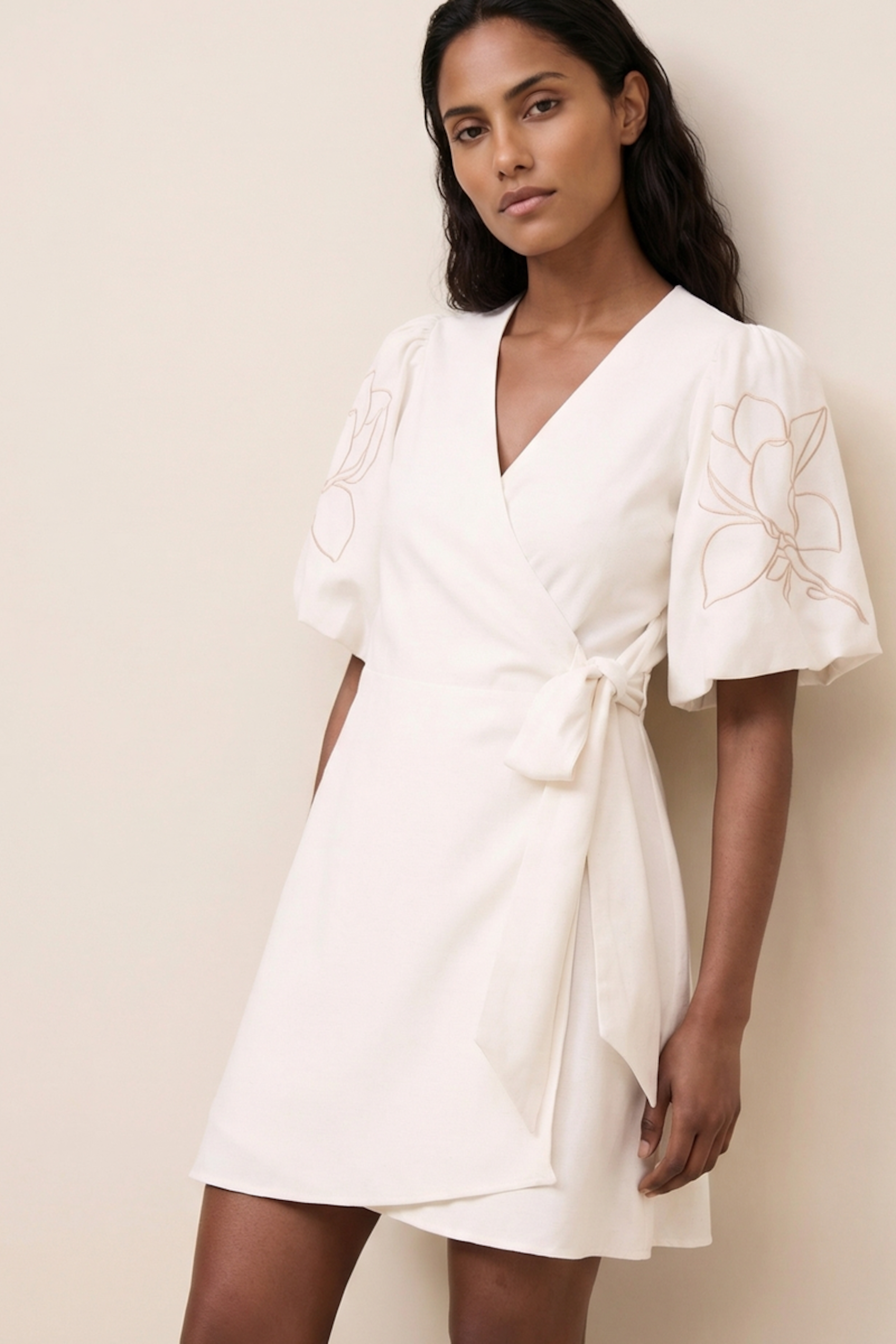 Associez cette robe à des sandales dorées pour un look estival chic. Parfait pour les pique-niques et les sorties décontractées. • Robe portefeuille • Col en V • Manches volumineuses • Longueur mi-cuisse • Motif floral