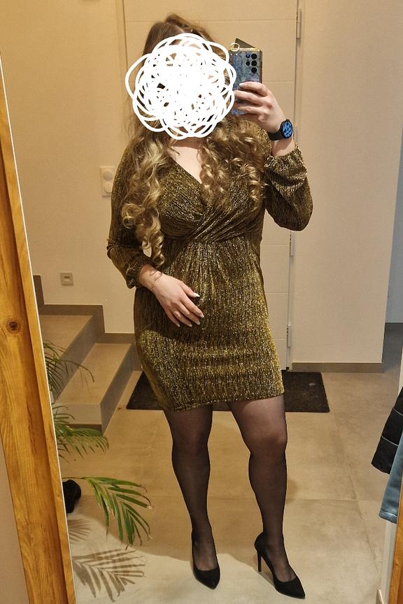 Ajoutez une touche d'éclat à votre hiver avec des escarpins noirs et une pochette chic. Parfait pour les soirées festives. • Robe courte • Décolleté en V • Manches longues • Coupe ajustée • Motif doré luminescent