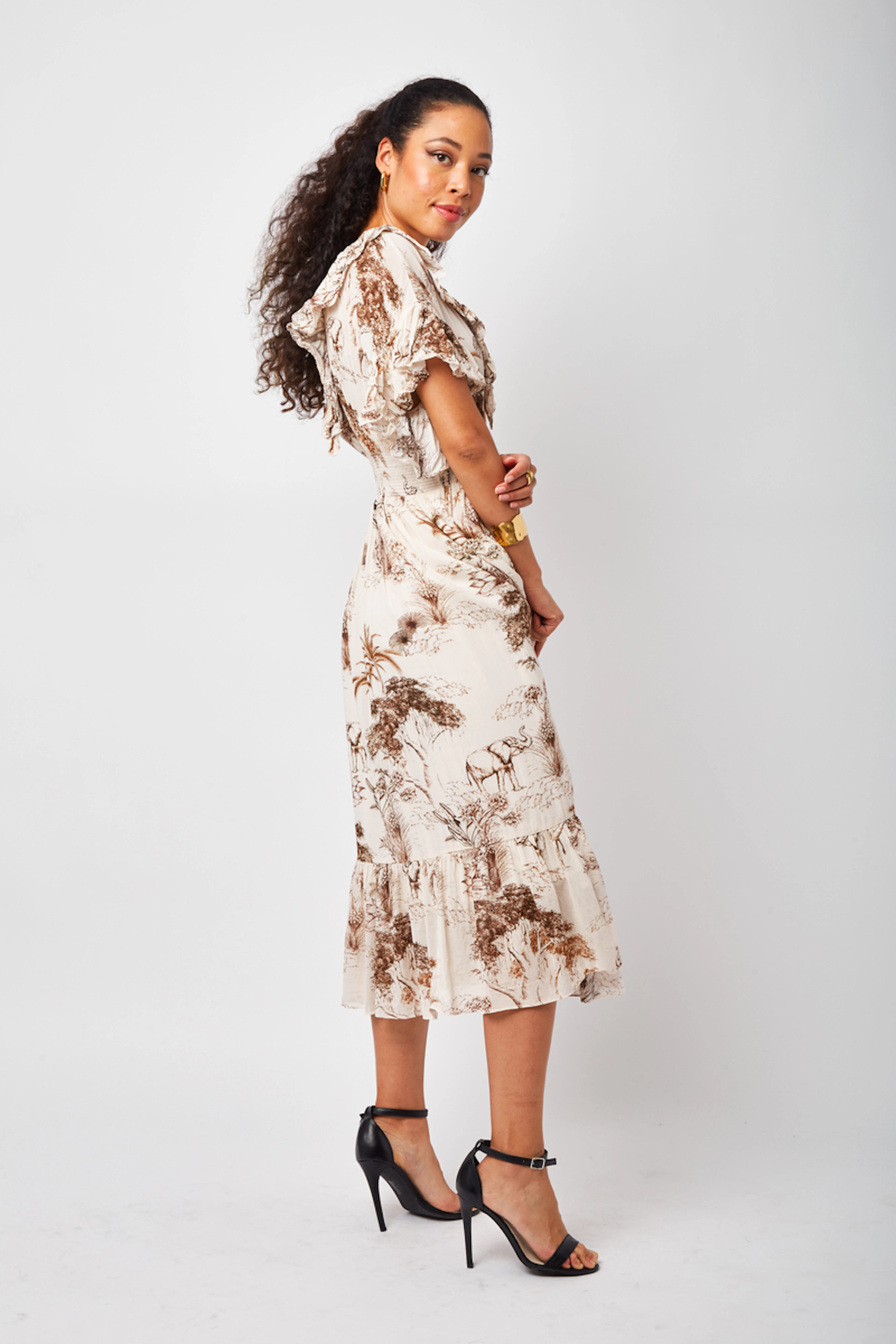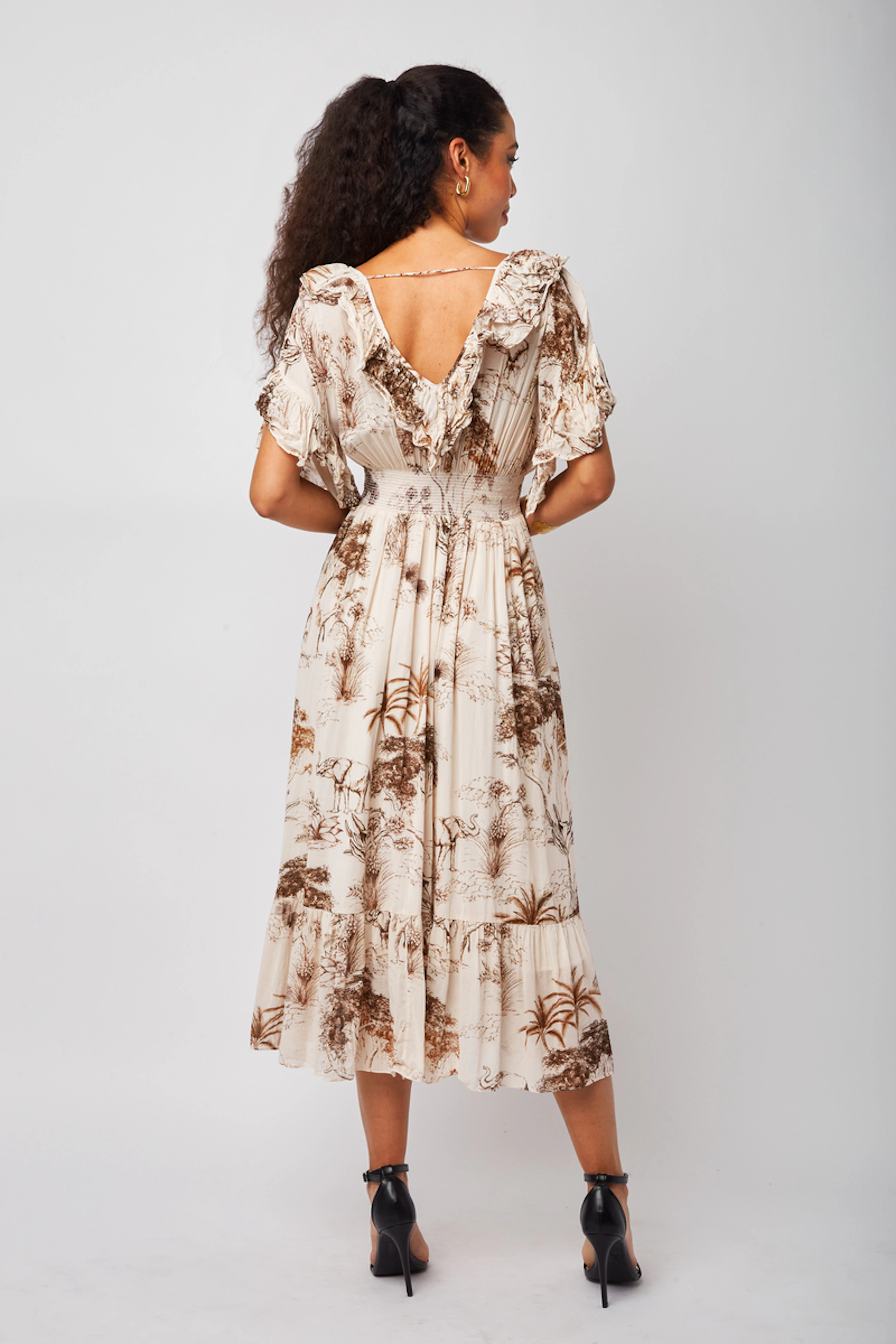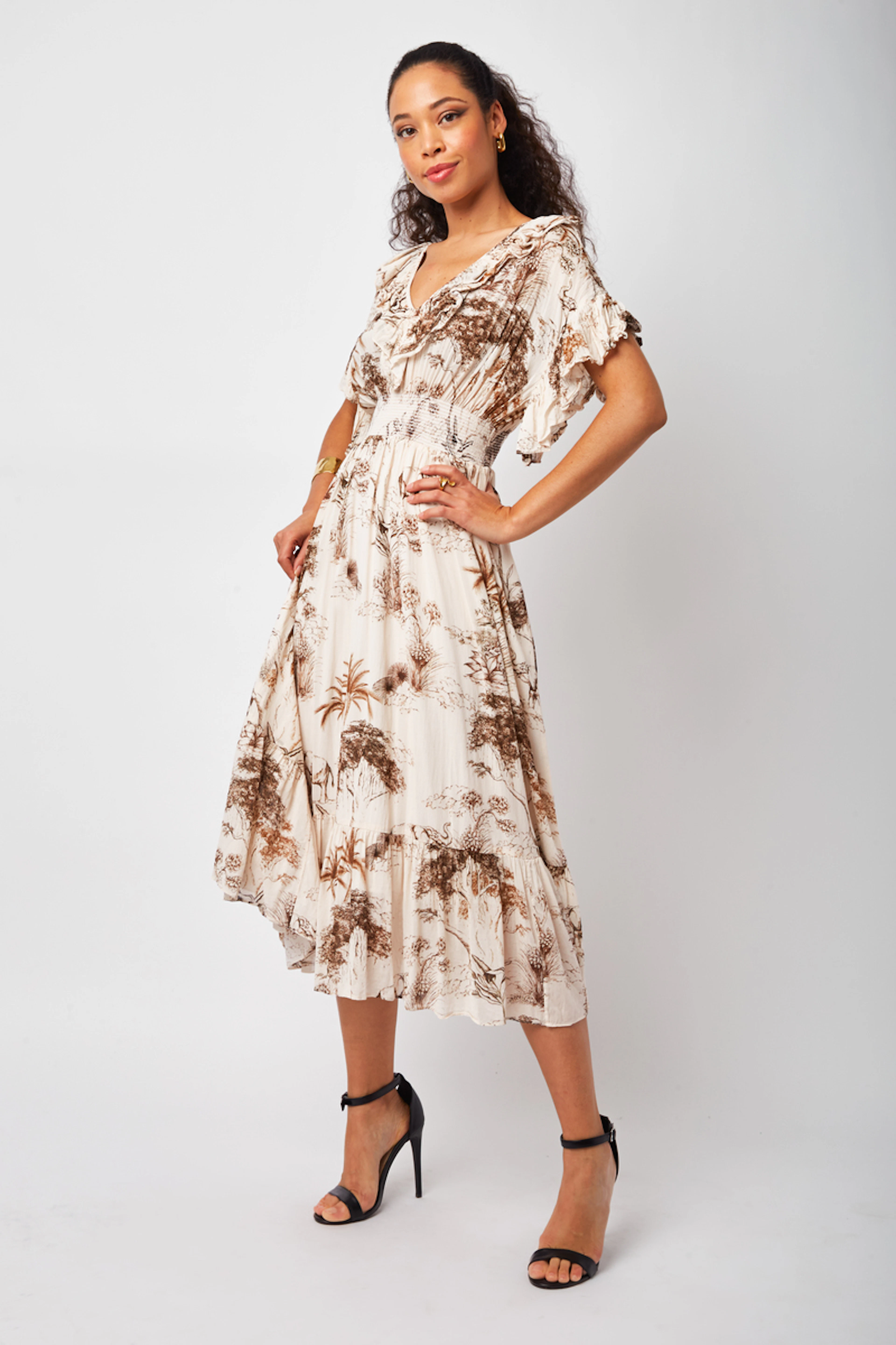 Accordez cette robe Sandro à des sandales minimalistes pour une allure délicate. Parfaite pour toute saison. • Robe empire en viscose et coton • Décolleté col en V • Manches courtes à volants • Elastique à la taille • Jupe évasée avec volant • Fermeture boutonnée sur toute la hauteur • Motif paysage