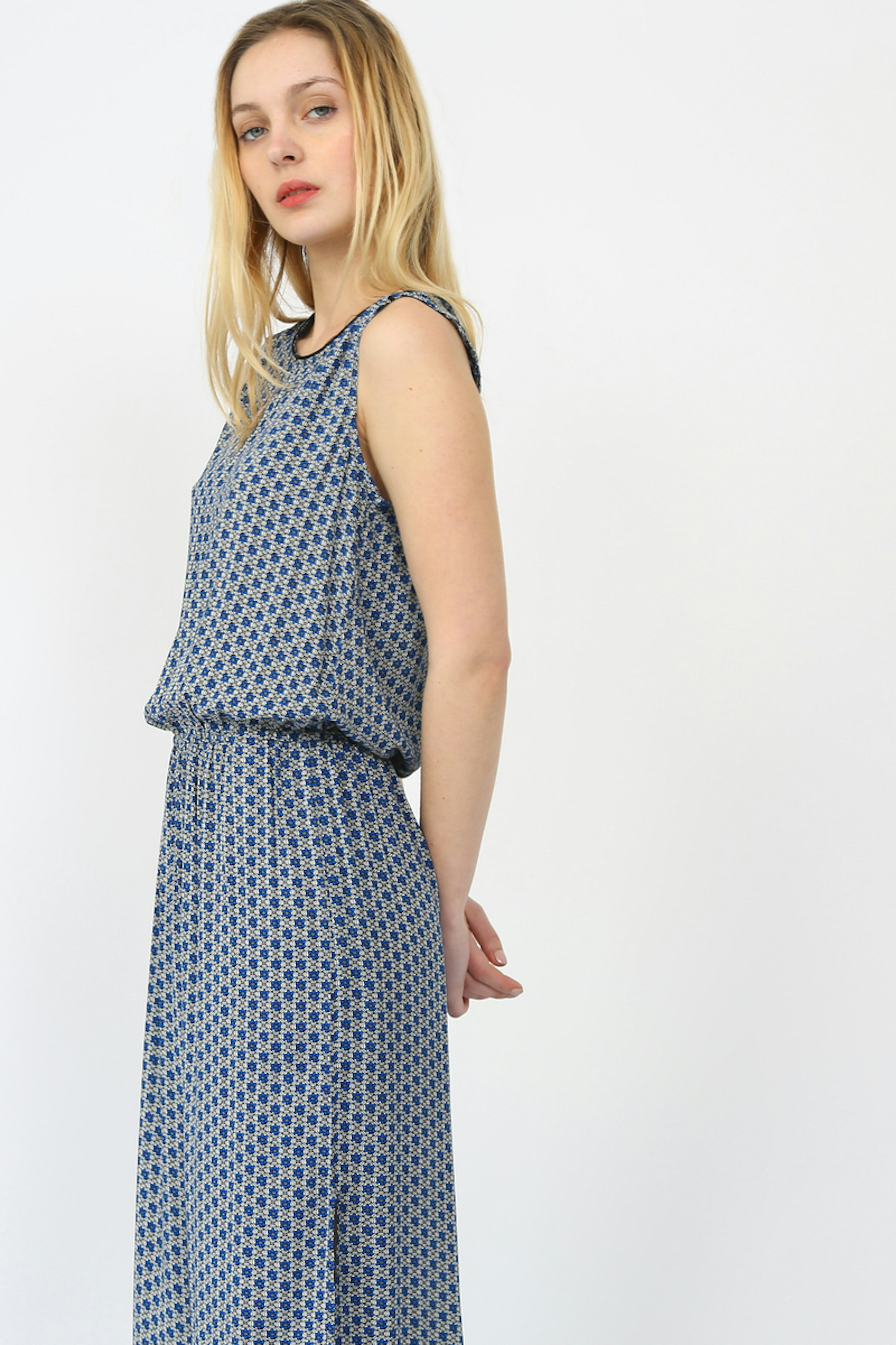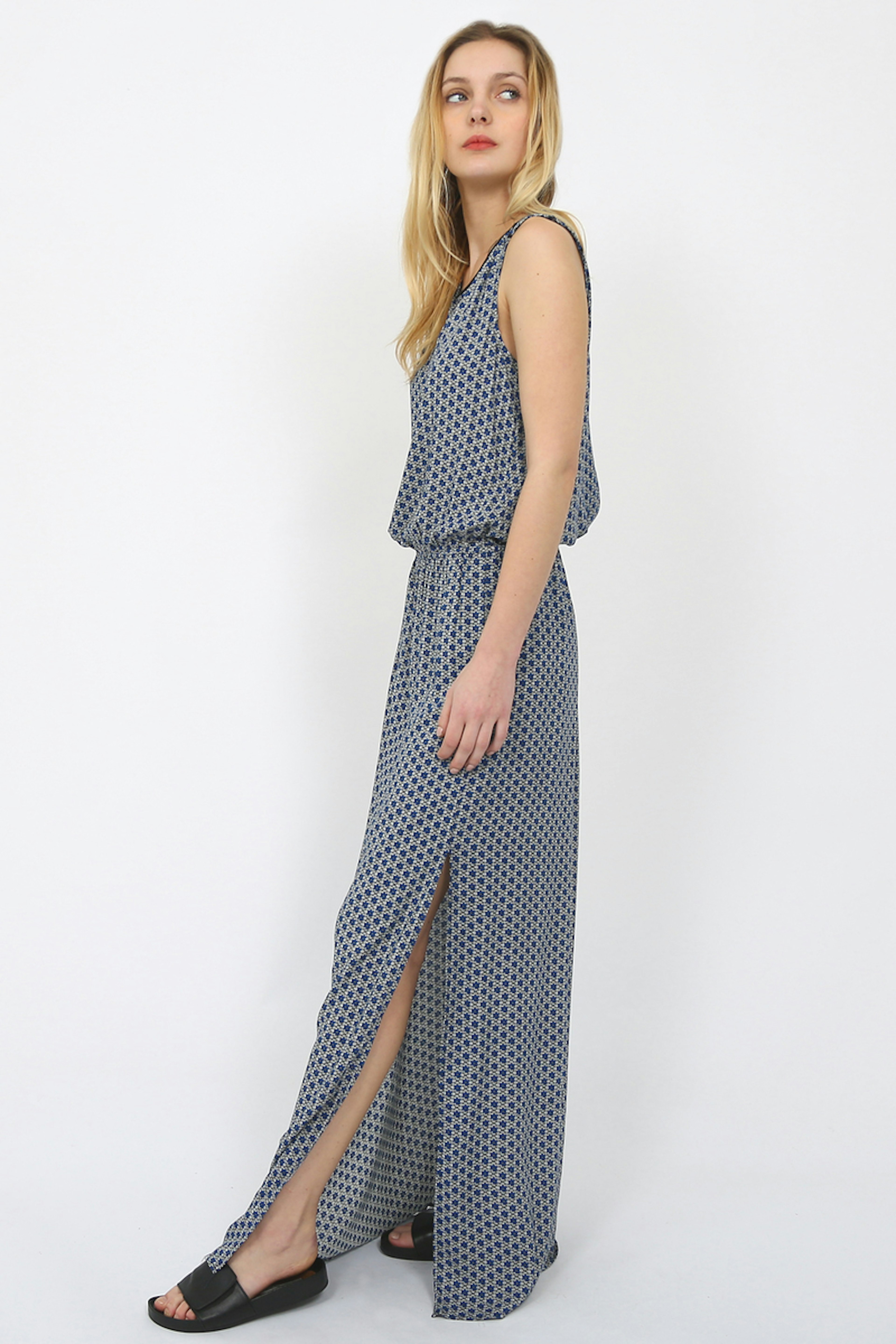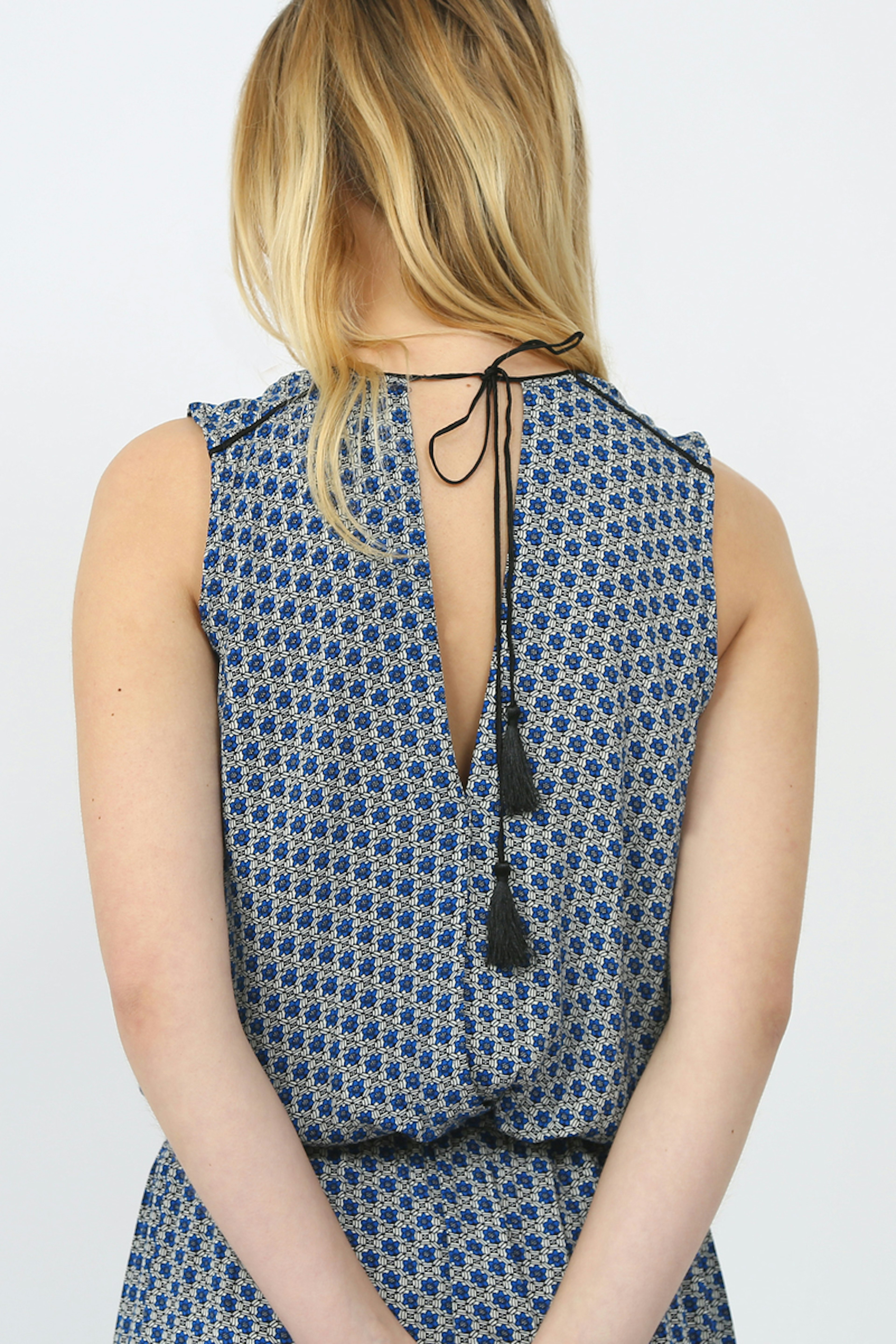 Robe longue ร imprimรฉ fleuri bleu et blanc. Fentes de part et d'autre de la robe, manches courtes et col rond. Dos ouvert reliรฉ grรขce ร une cordelette noire avec pompons aux extrรฉmitรฉs. <br> La mannequin mesure 1,74 mรจtre, son tour de taille est de 62 centimรจtres, son tour de hanche est de 89 centimรจtres et son tour de poitrine est de 86 centimรจtres (85C).