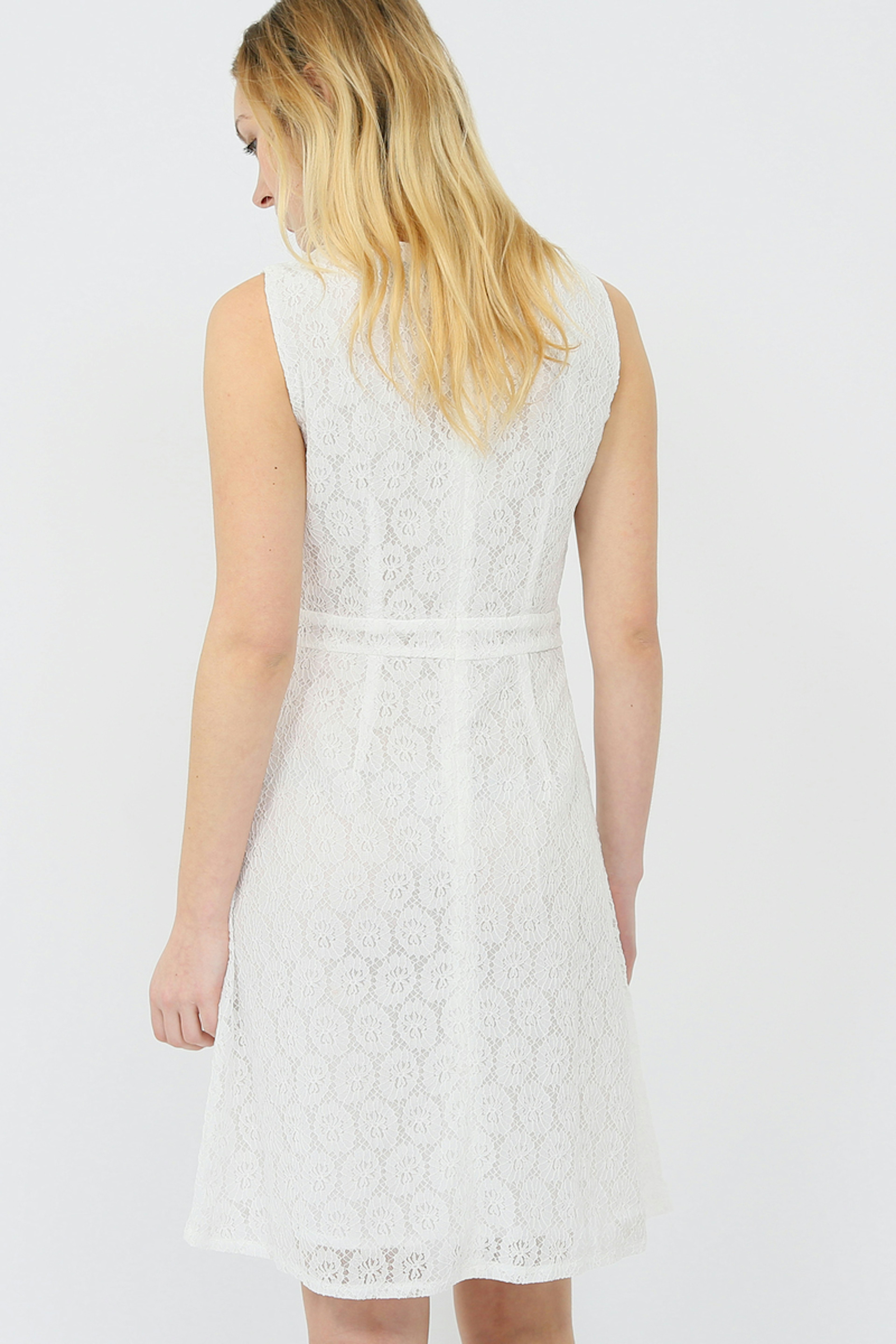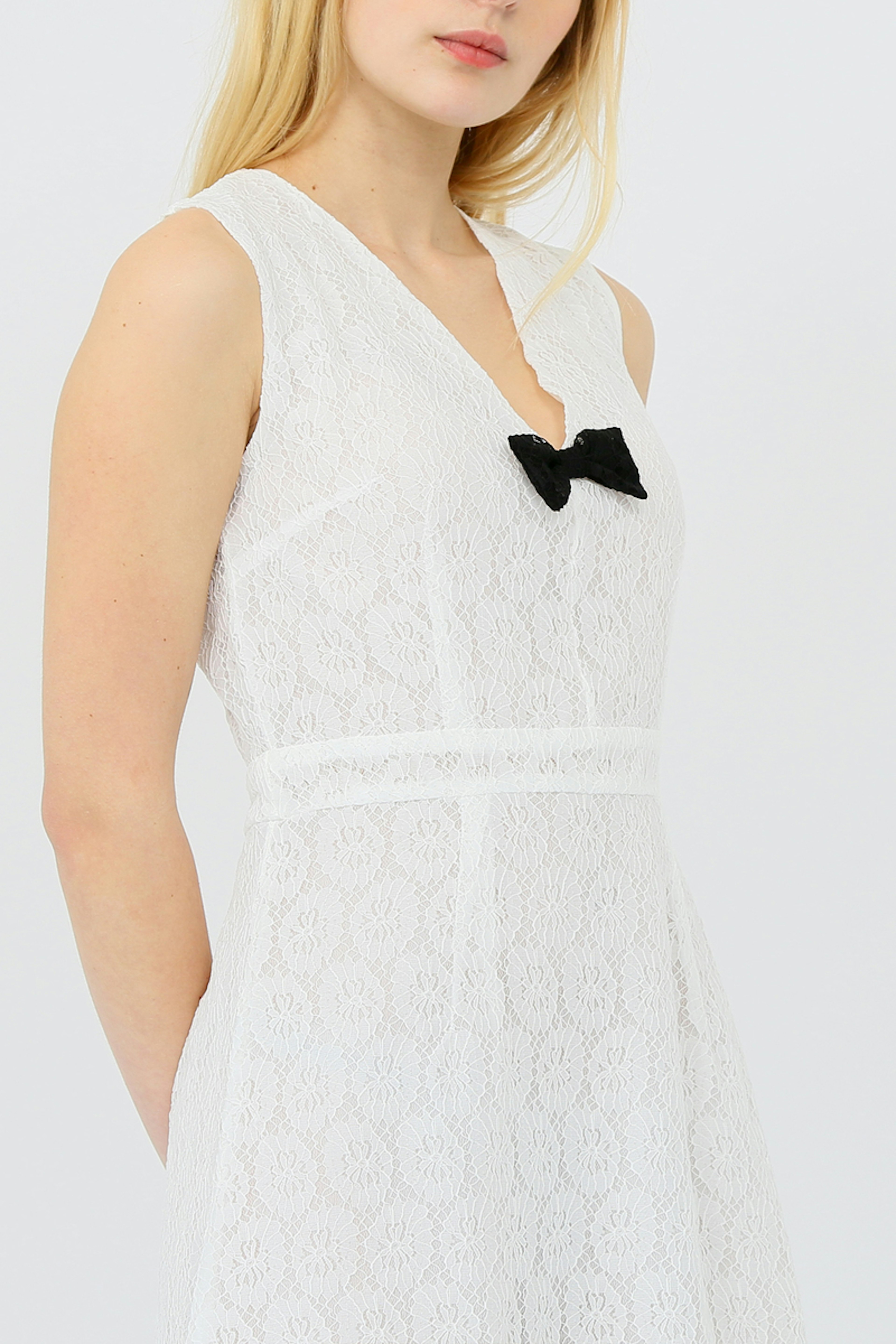 Robe blanche en dentelle, manches courtes et col en V avec un noeud noir. Ceinturรฉe ร la taille et zip dans le dos. <br> La mannequin mesure 1,74 mรจtre, son tour de taille est de 62 centimรจtres, son tour de hanche est de 89 centimรจtres et son tour de poitrine est de 86 centimรจtres (85C).