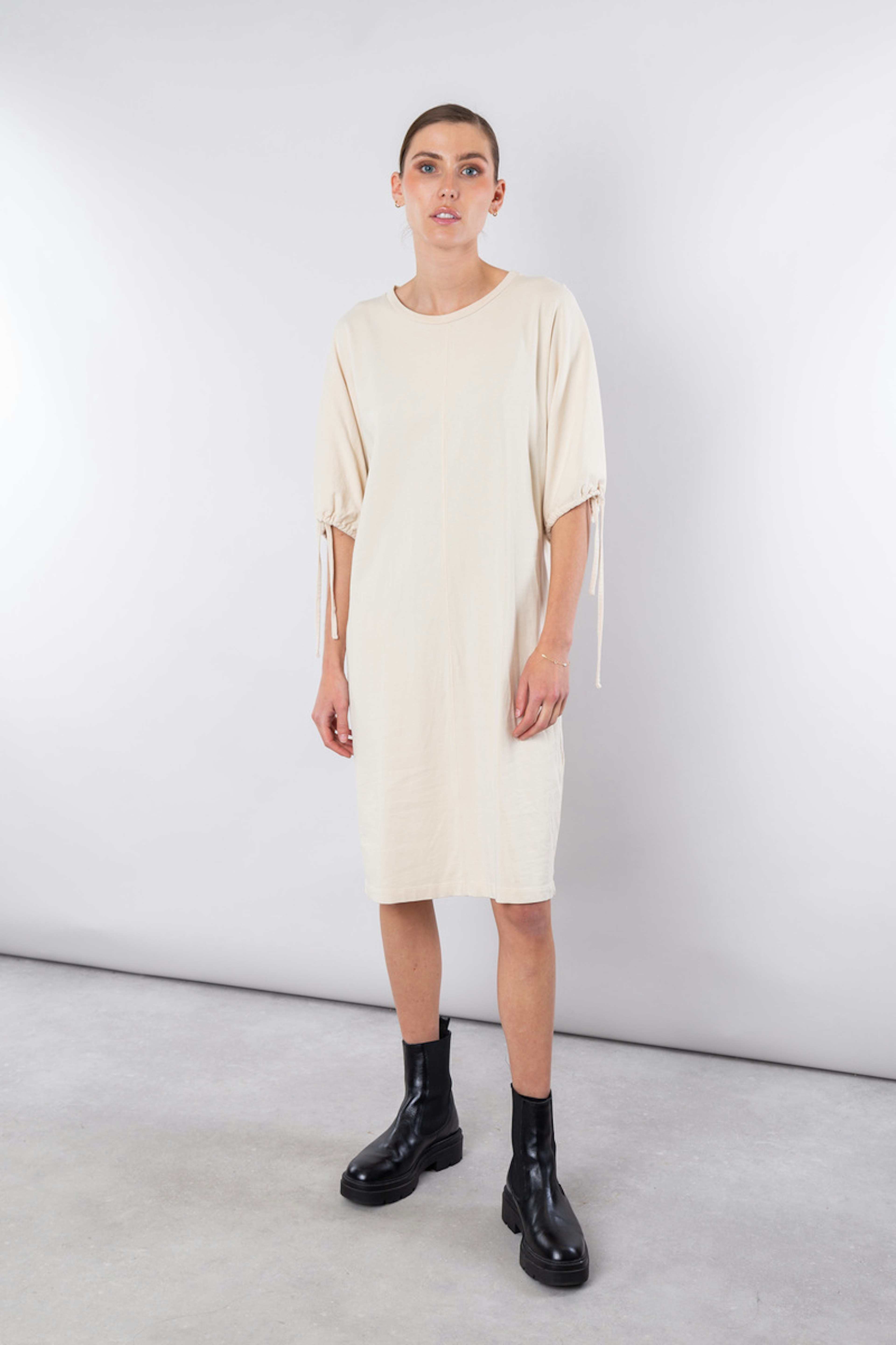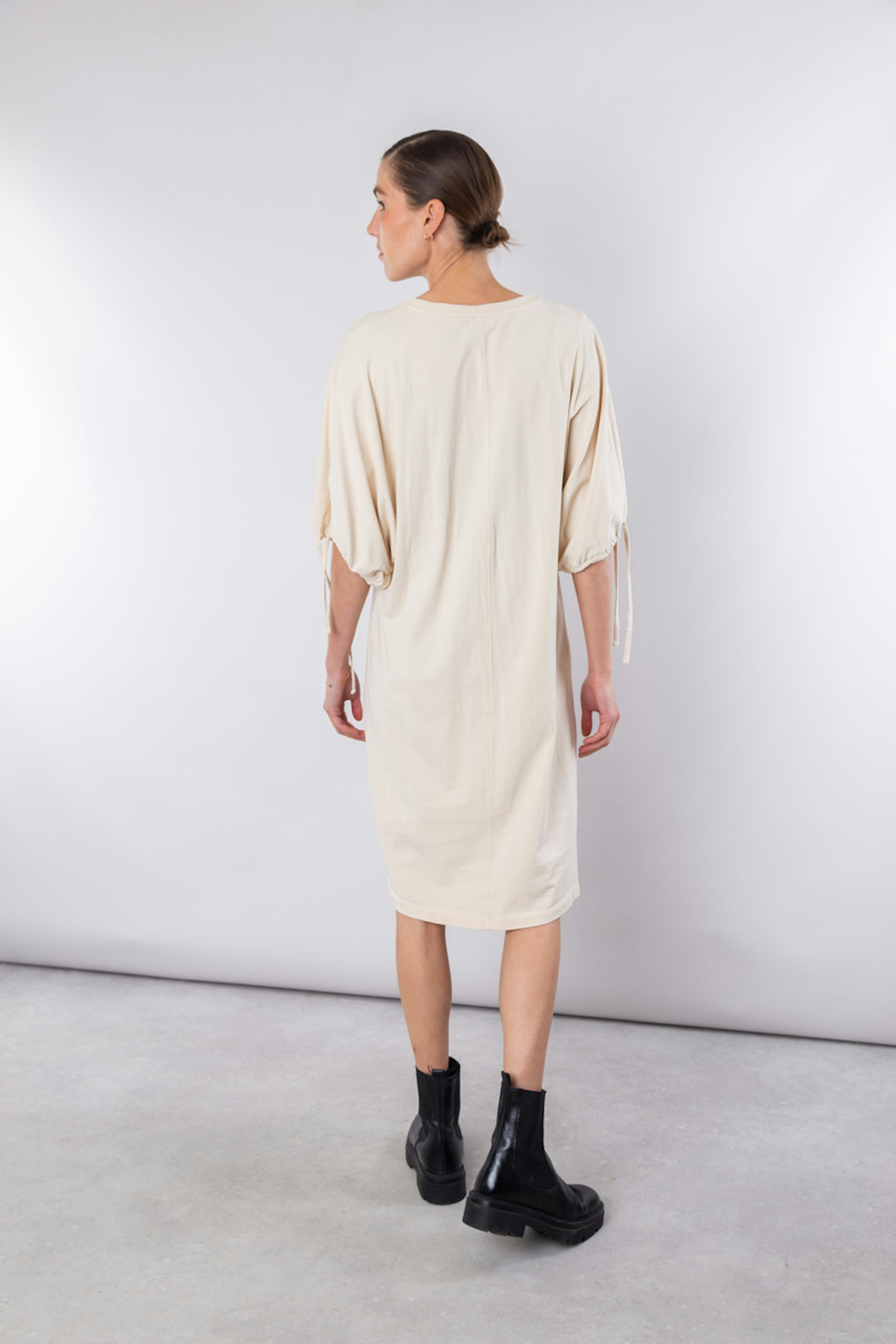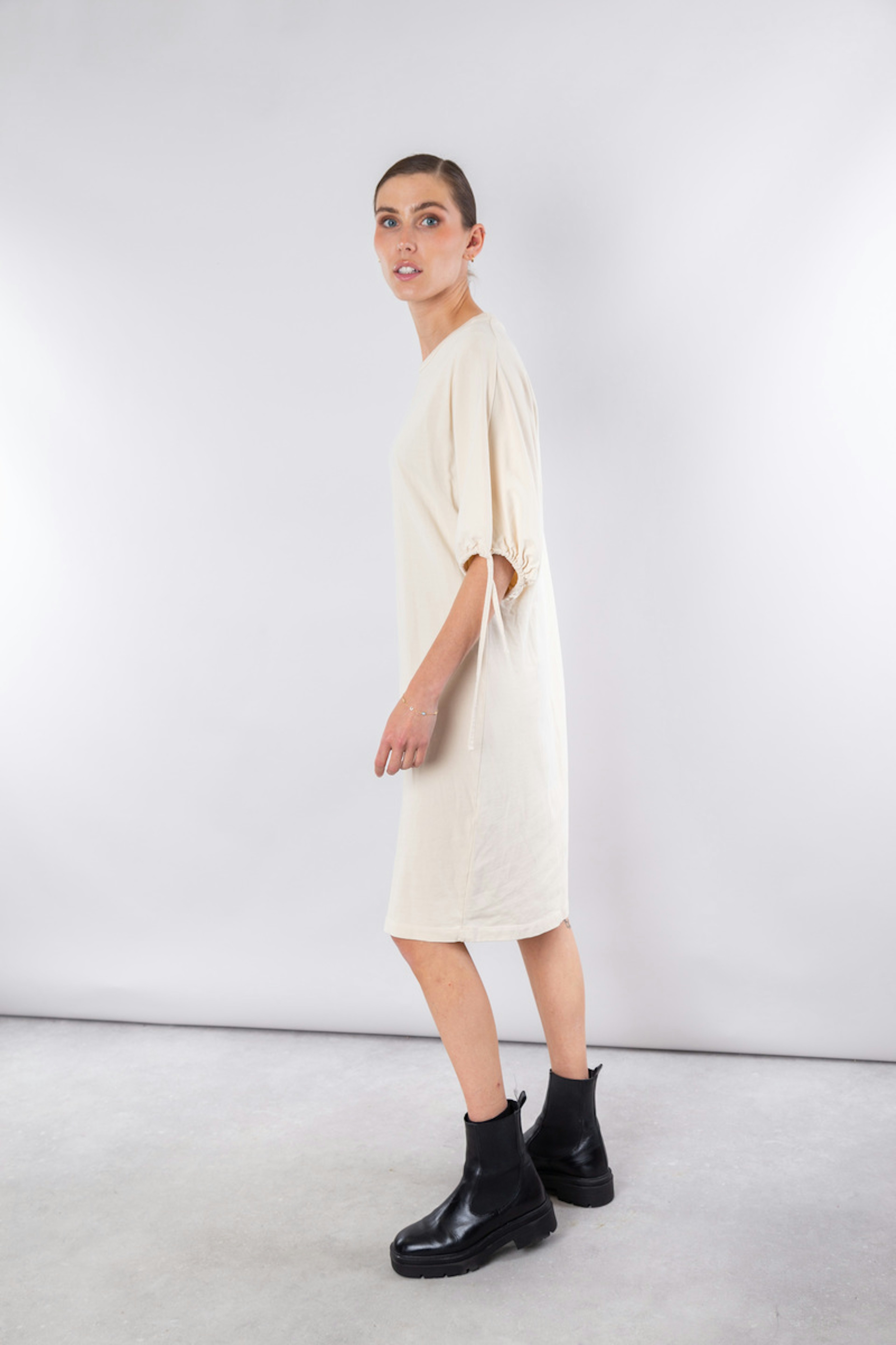 โข Robe t-shirt blanc รฉcru โข Manches 3/4 resserrรฉes par un cordon โข Col rond โข Epaules tombantes โข Coupe droite et ample