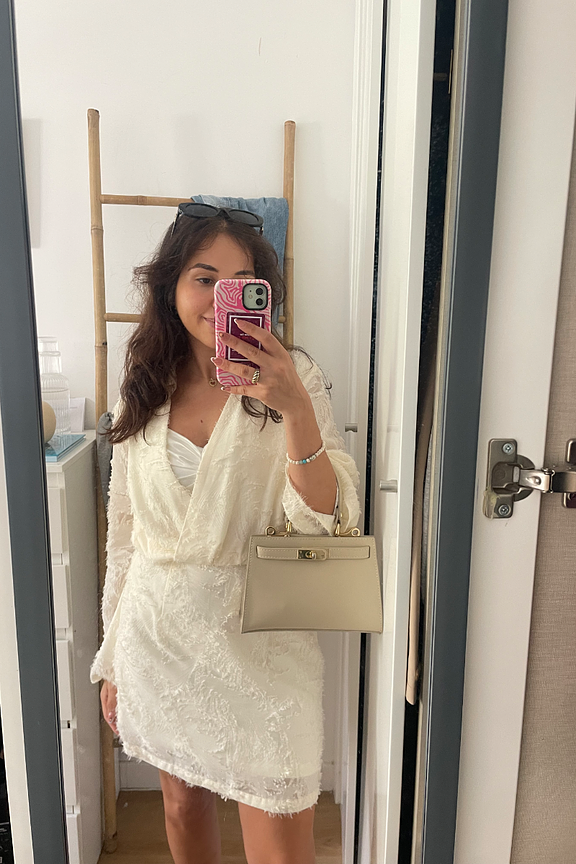 Associez cette robe beige avec des sandales dorées et un sac à main élégant pour une allure estivale raffinée. • Robe courte • Col à revers • Manches longues évasées • Coupe portefeuille • Texture en relief