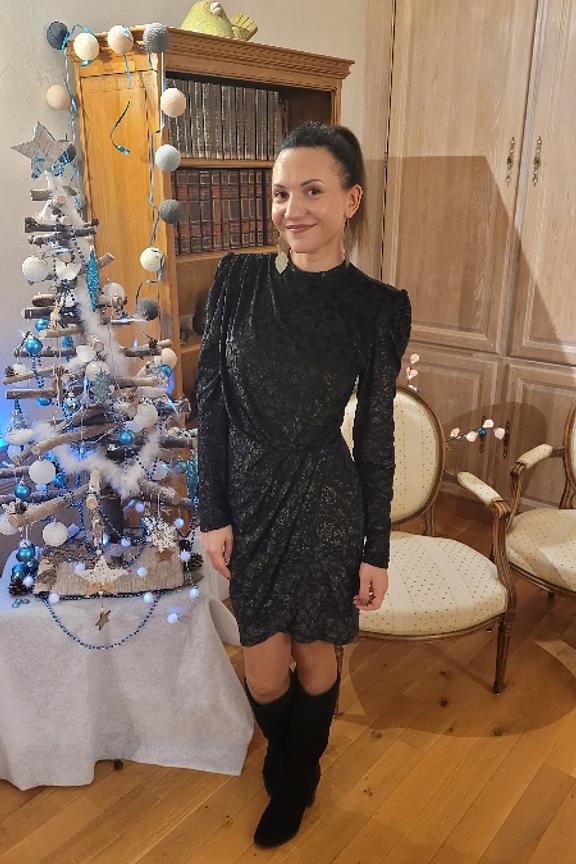 “Robe très belle et confortable (toute douce!), je l'ai porté à Noël et je n'ai pas du tout eu froid (pourtant elle n'est pas épaisse). On ne voit pas forcément de loin mais elle a des reflets dorés, c'est très joli 😊. J'ai adoré les épaulettes aussi 😊”