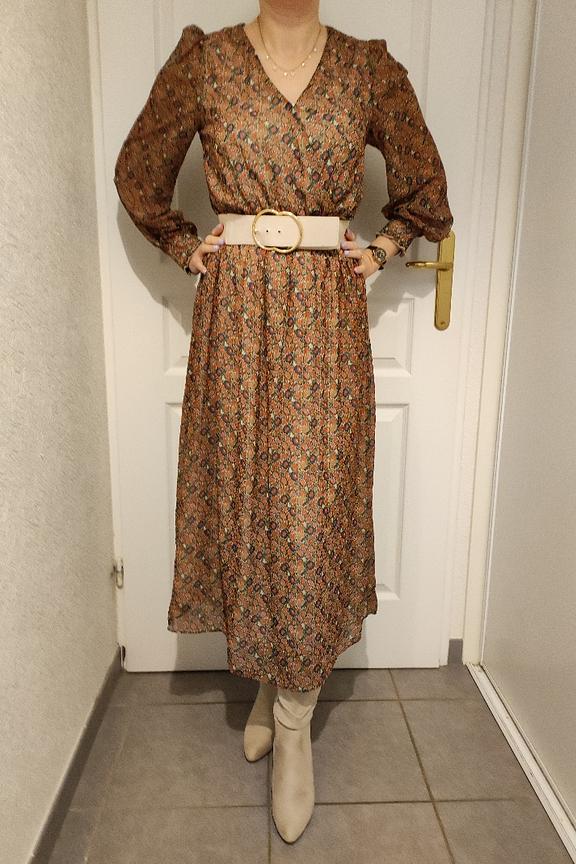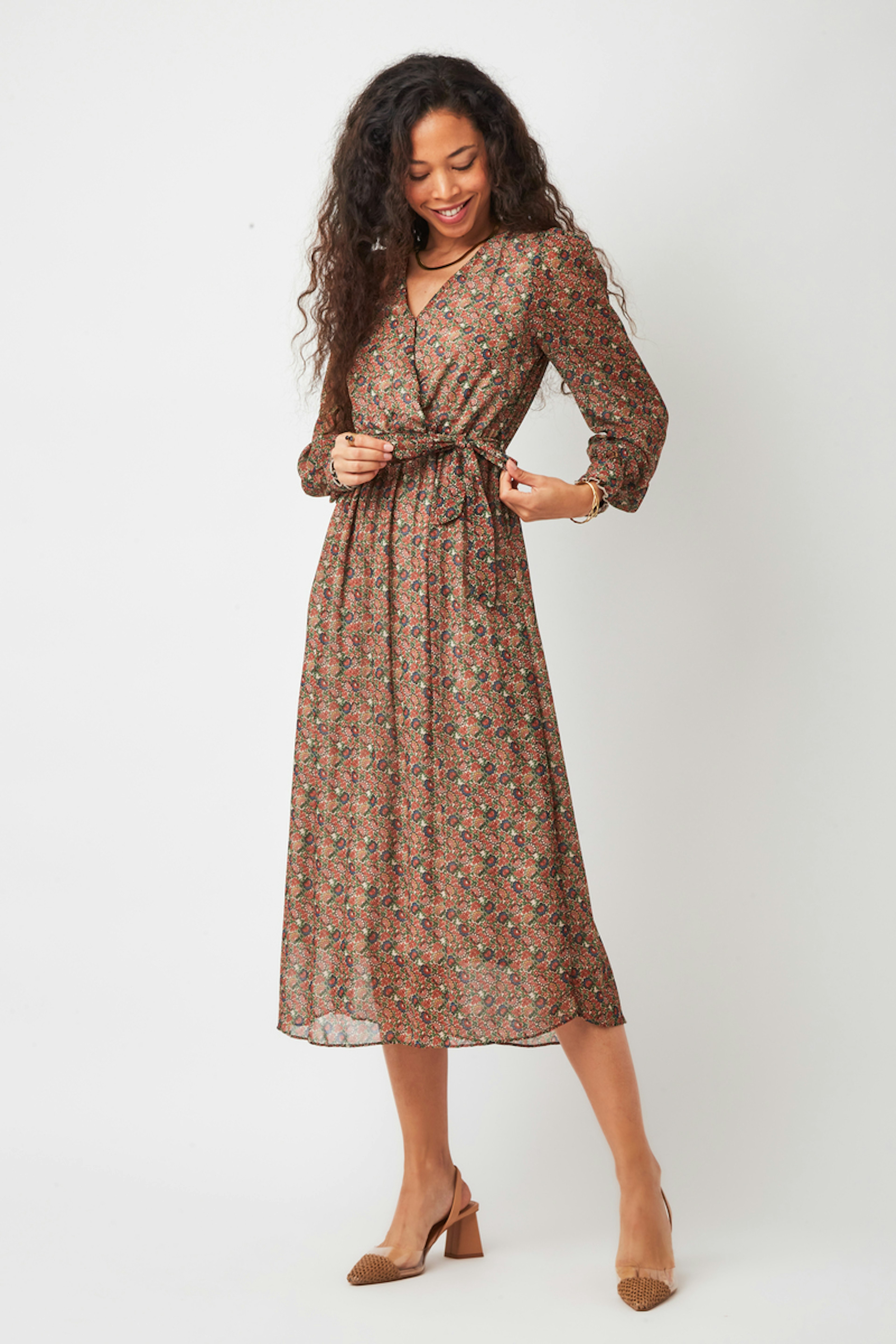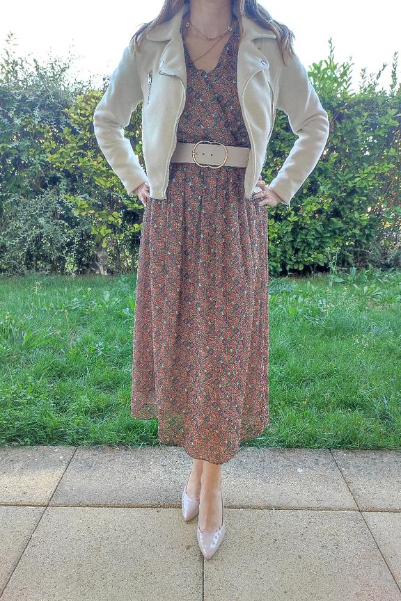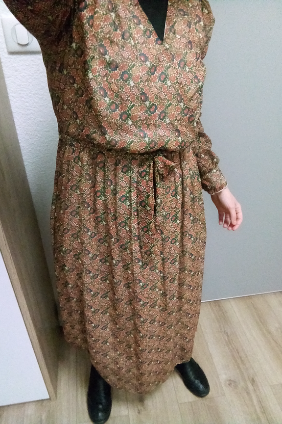 โข Robe longue imprimรฉe fleurie bohรจme โข Taille cintrรฉe โข Dรฉcolletรฉ portefeuille avec ceinture ร nouer sur le cรดtรฉ โข Tissu fluide et transparent dans le dos โข Manches longues resserrรฉes aux poignets