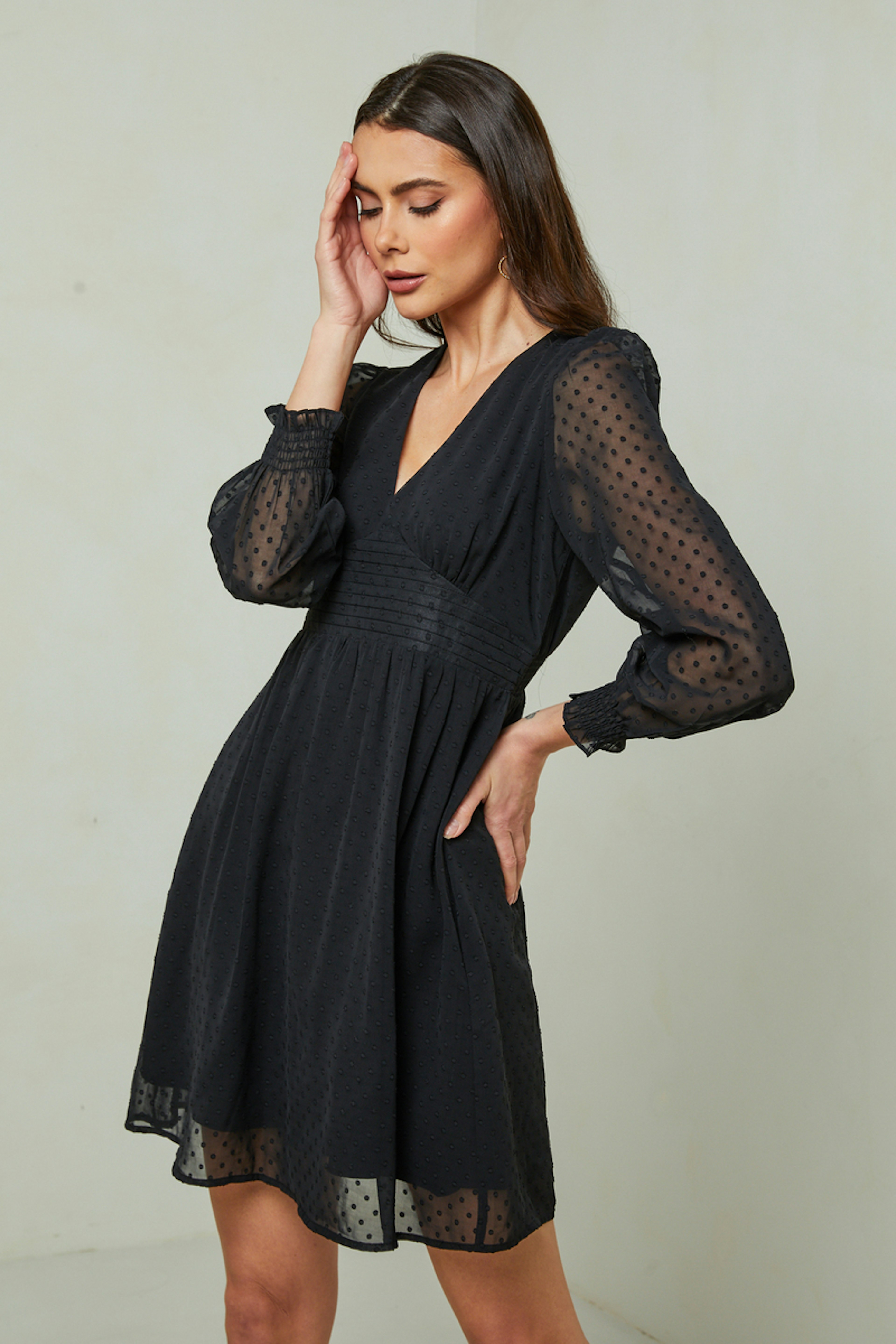 - Robe noire manches transparentes ร pois - Style รฉlรฉgant avec col en V et resserrรฉ ร la taille - Idรฉal pour tous les jours ou ร porter pour une occasion. - Le petit plus : ร associer avec des talons dorรฉs La mannequin mesure 1.78m et porte une taille 36