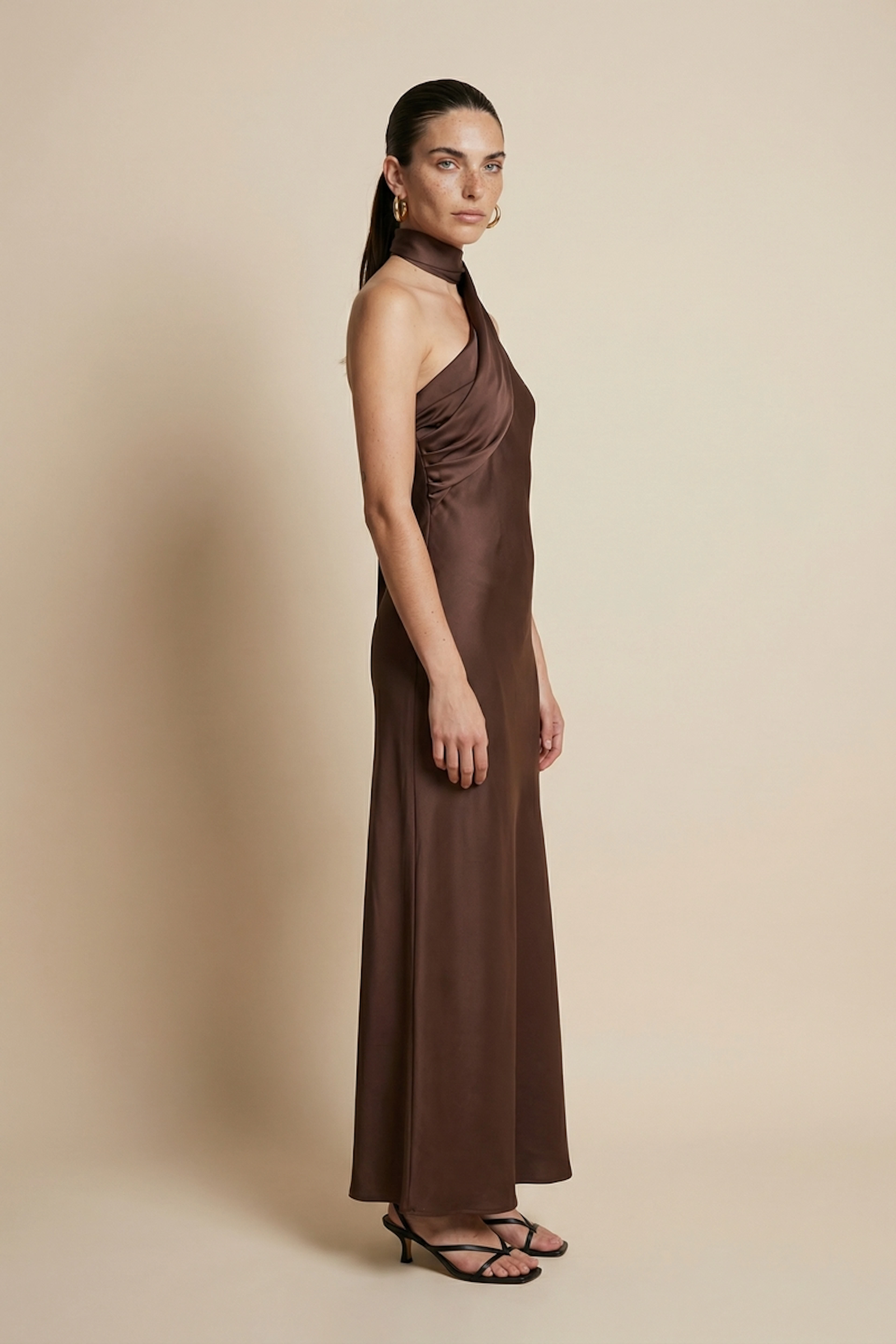 Ajoutez une paire de sandales dorées pour une touche estivale. Complétez avec des boucles d’oreilles pendantes. • Robe longue • Coupe asymétrique • Sans manches • Encolure drapée • Tissu fluide et léger