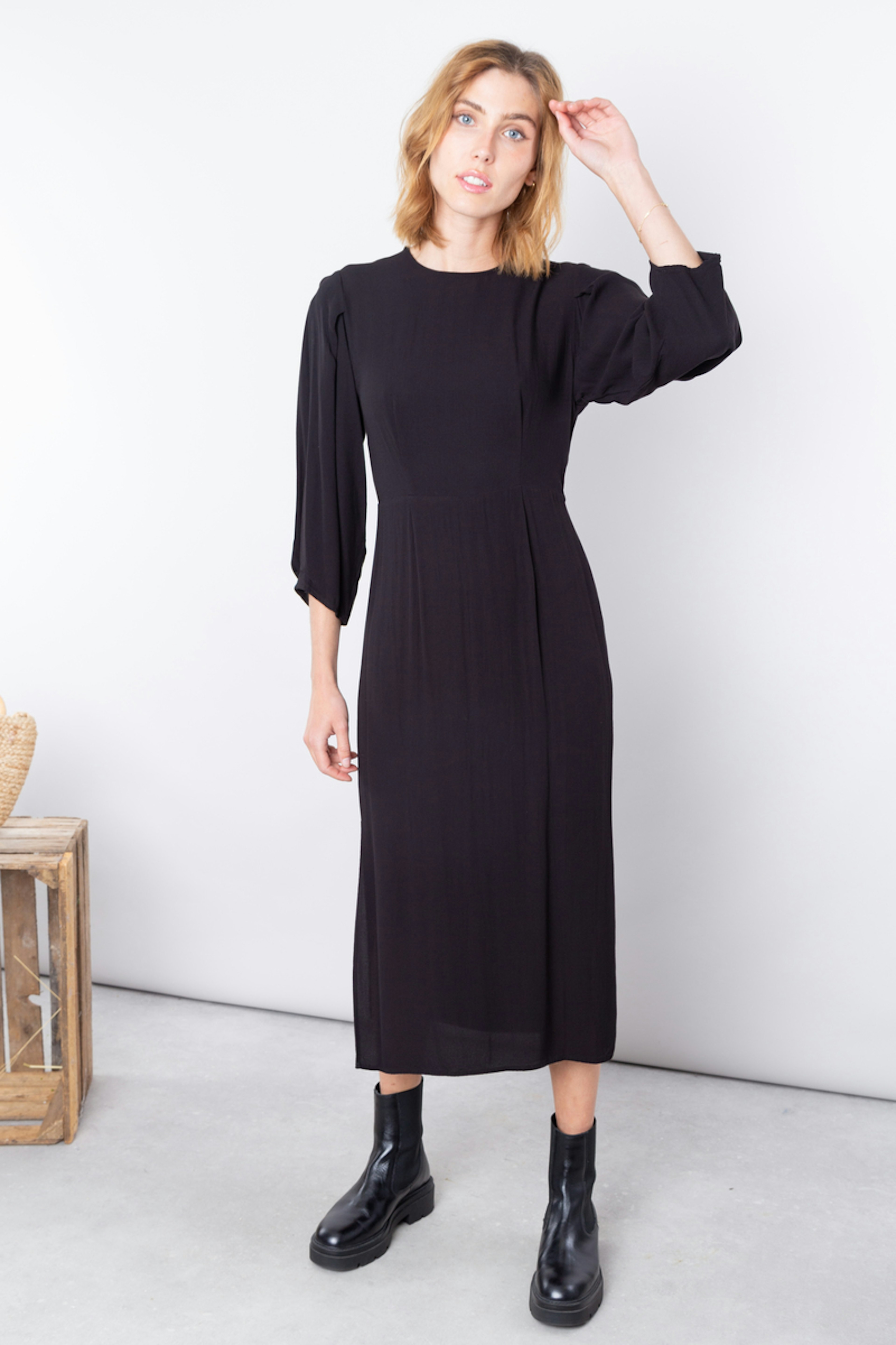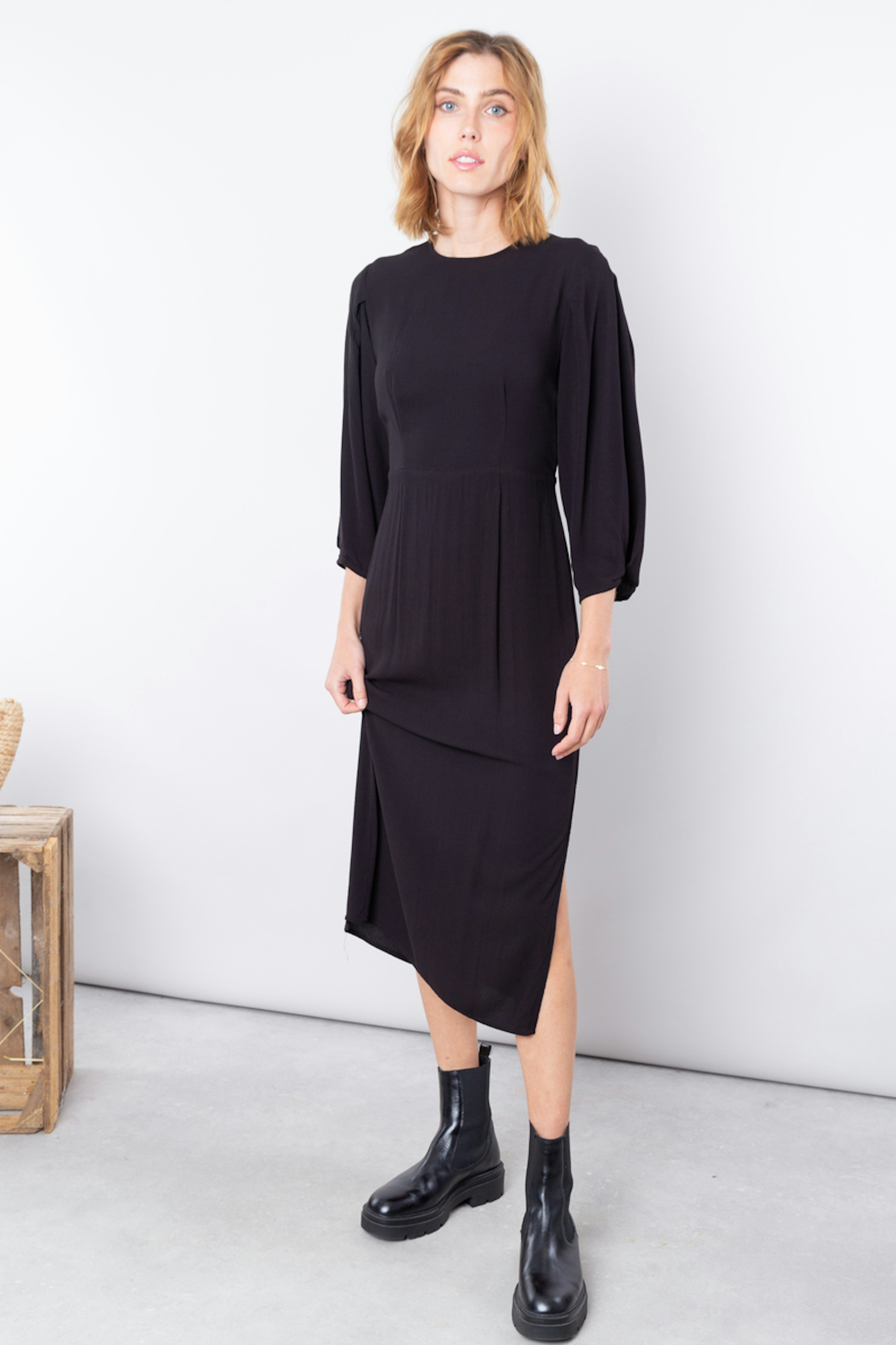 โข Robe noire droite mi-longue โข Manches 3/4 ballons avec petites รฉpaulettes โข Col rond โข Fente ouverte sur la jambe โข Coupe fluide