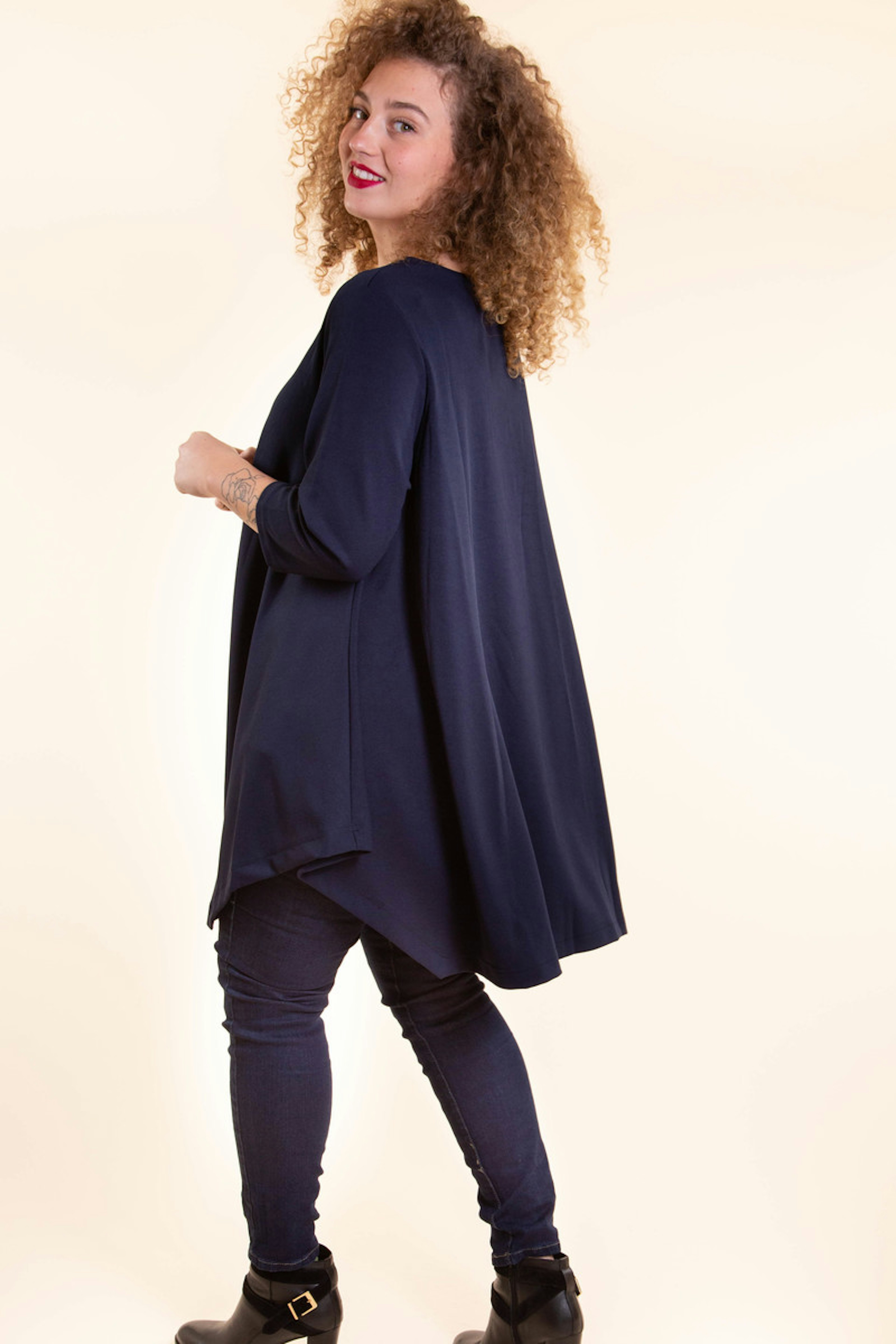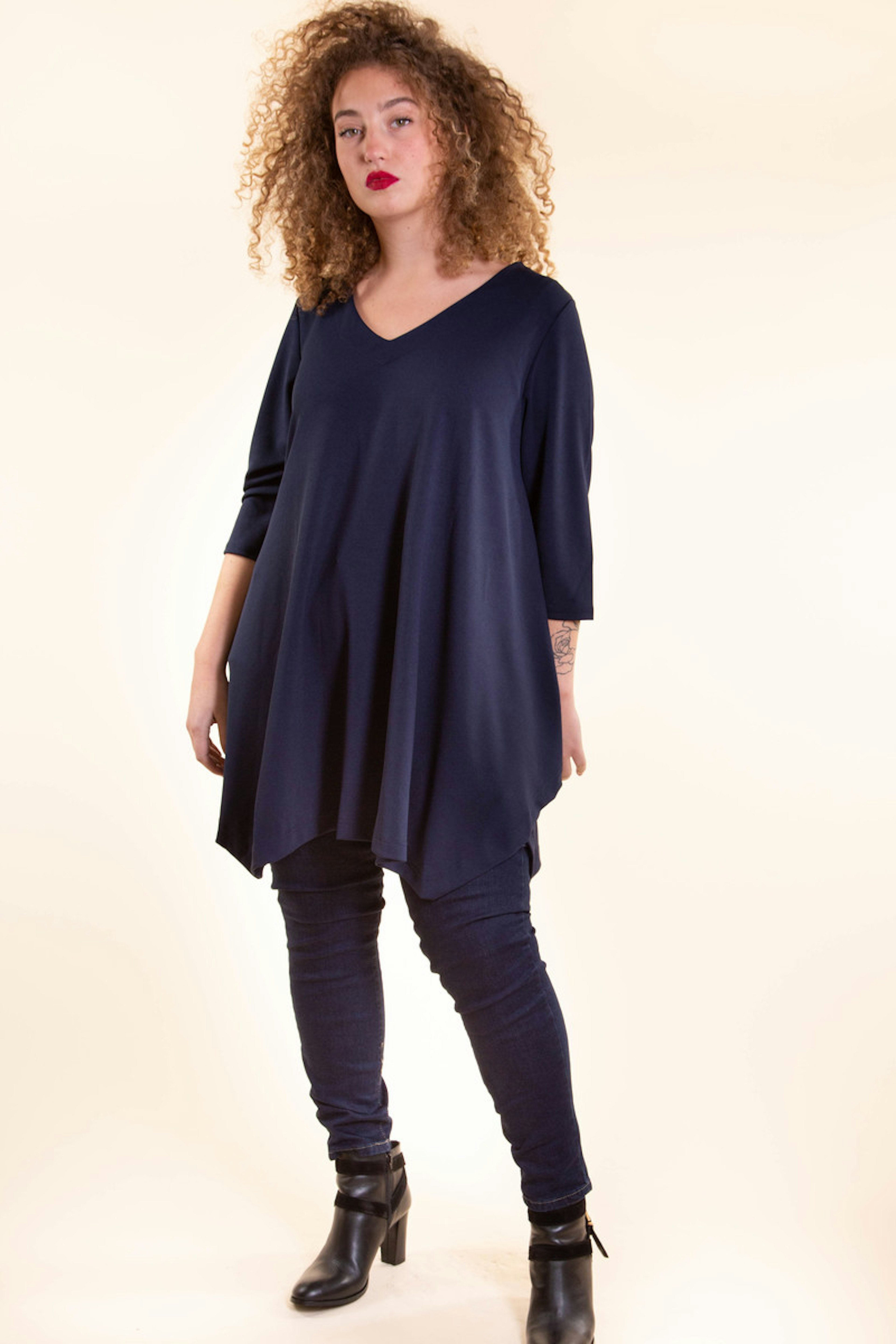 Dรฉcouvrez cette tunique bleu marine super confortable. Ce modรจle est en taille unique et s'adapte aux tailles 44 ร 50. La tunique sera donc plus ou moins ample selon vos formes. A porter sur un jean ou en version courte avec des collants.
