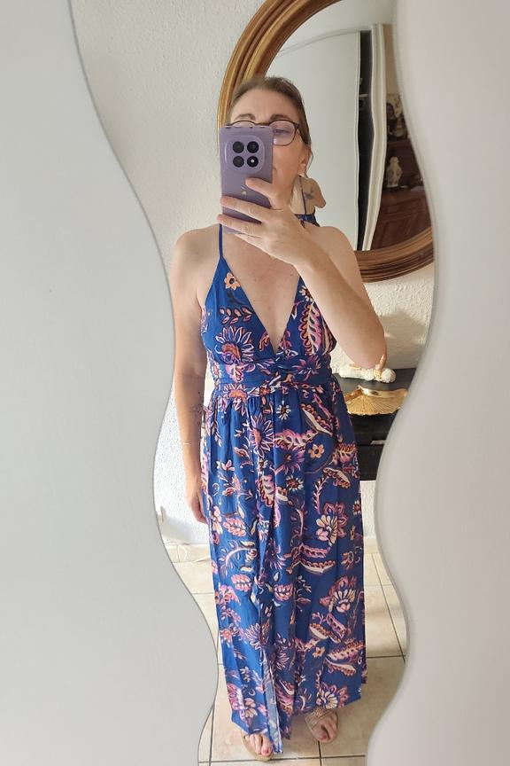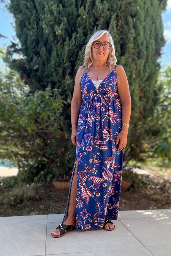 Associez cette robe fluide à des sandales dorées et une pochette estivale. Parfaite pour flâner sous le soleil ou pour une soirée d'été. • Robe longue • Bretelles fines • Décolleté en cœur • Taille smockée • Imprimé floral