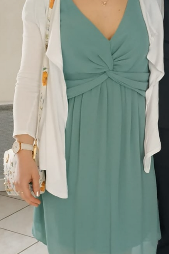 โข Robe bleu cรฉladon ร manches courtes โข Forme babydoll โข Manches ballons โข Taille cintrรฉe avec dรฉtail โข Zip invisible dans le dos