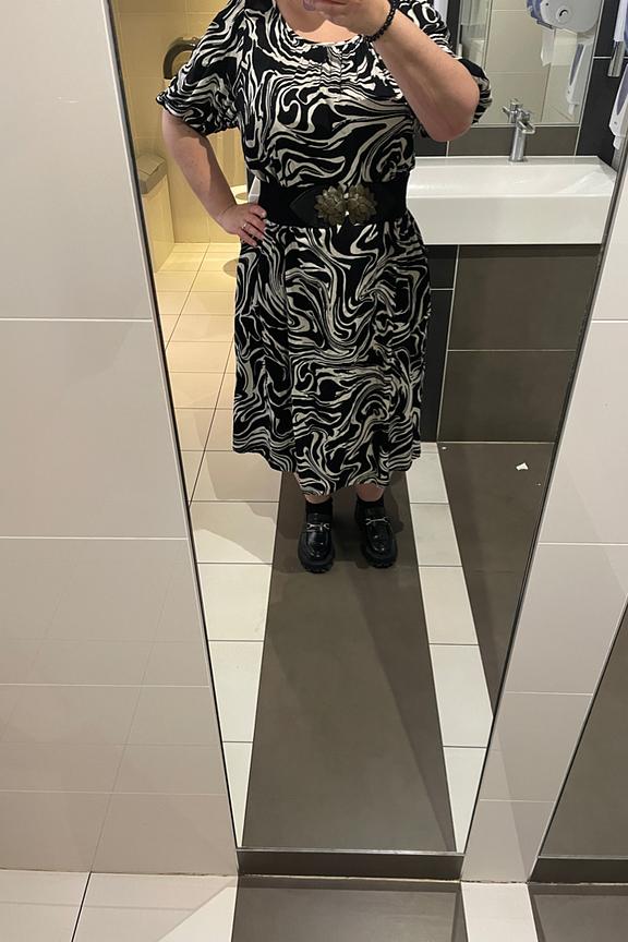 Sublimez votre allure estivale avec cette robe à l'imprimé captivant, parfaite pour les journées ensoleillées ou les soirées douces. Associez-la à des sandales noires et une ceinture camel pour une touche d'élégance. • Robe mi-longue, 100% Viscose • Manches trois-quarts bouffantes • Encolure ronde délicate • Jupe fluide et aérienne • Motif marbré noir et blanc