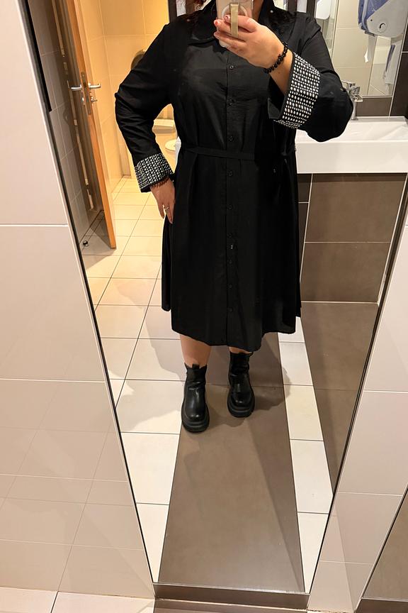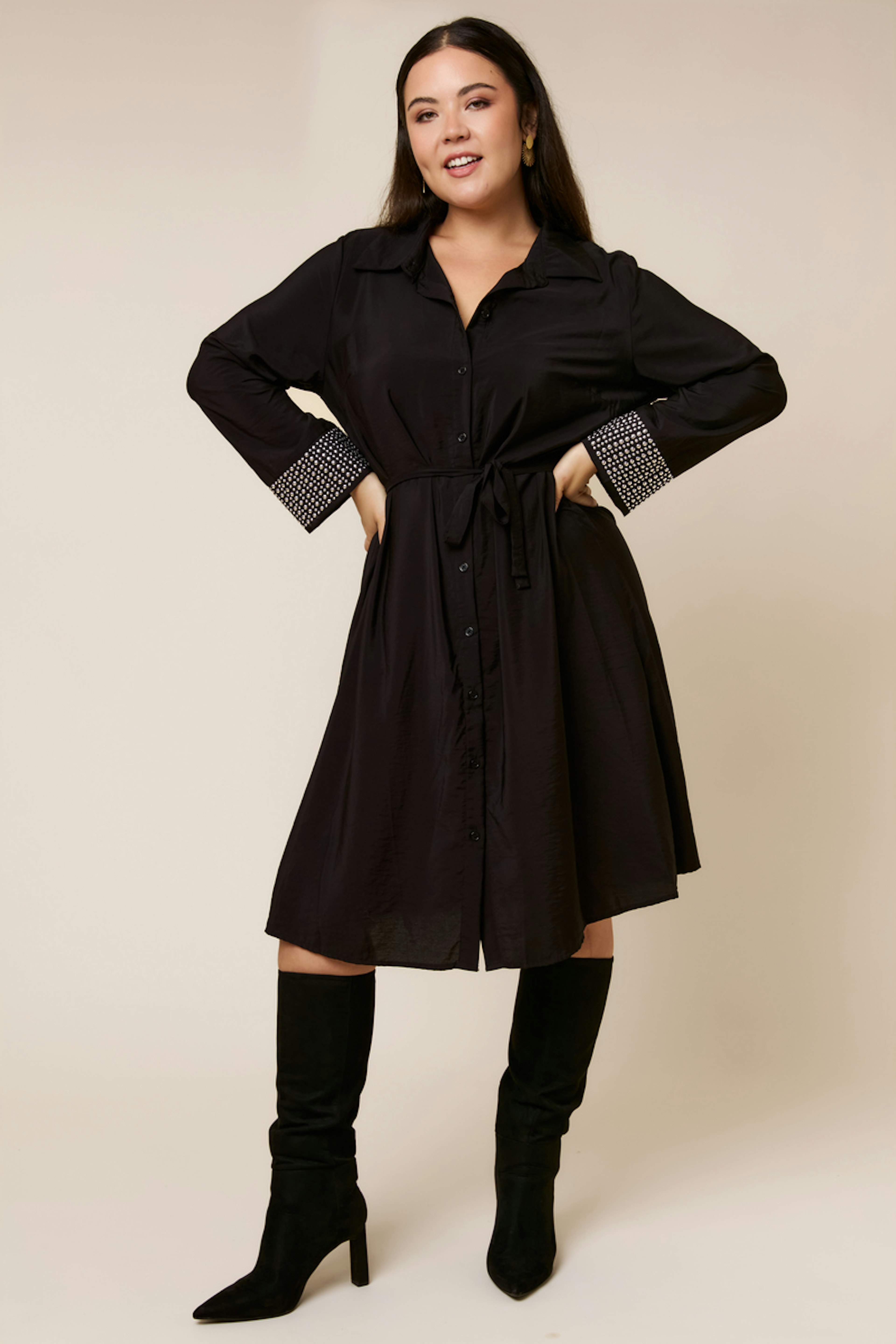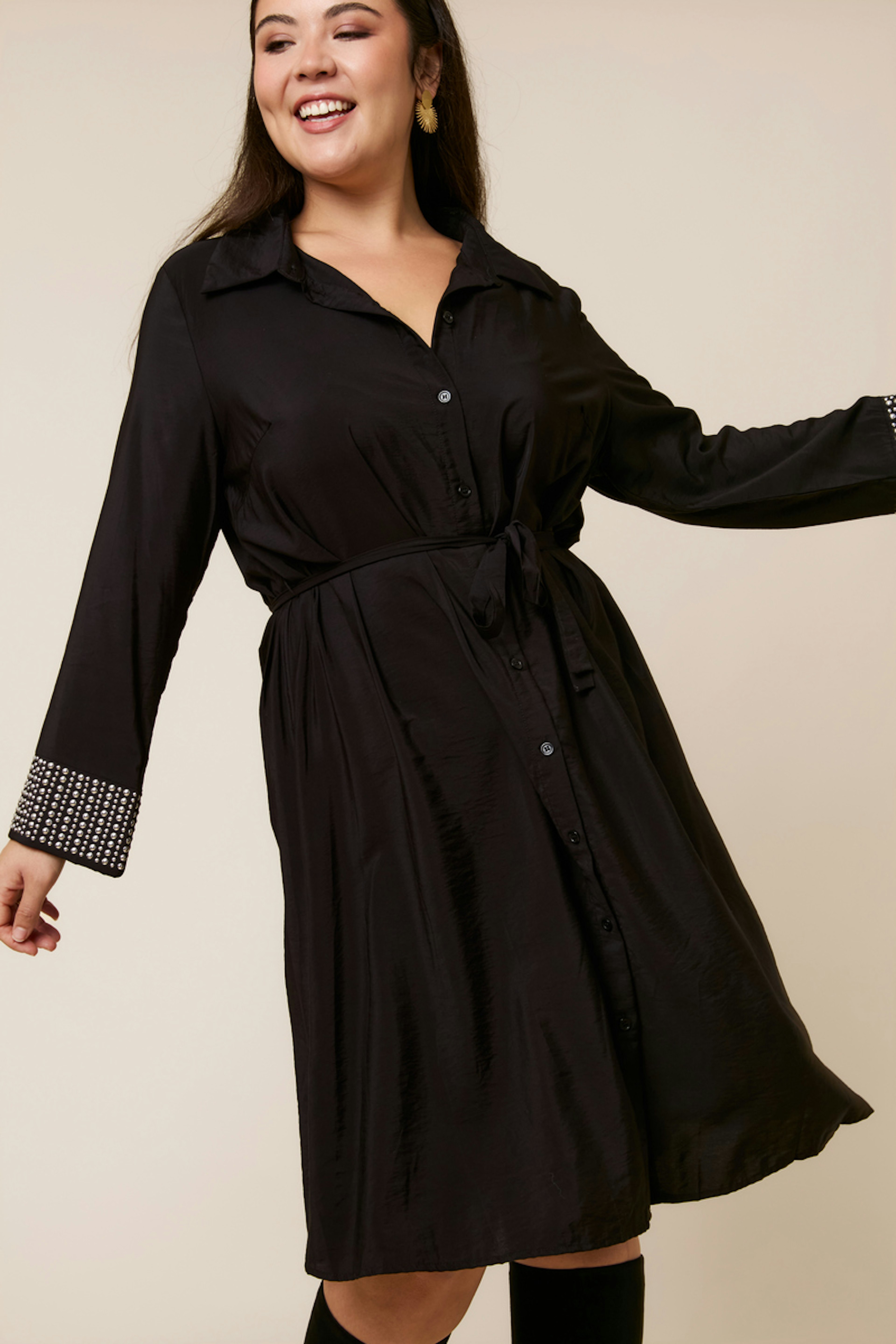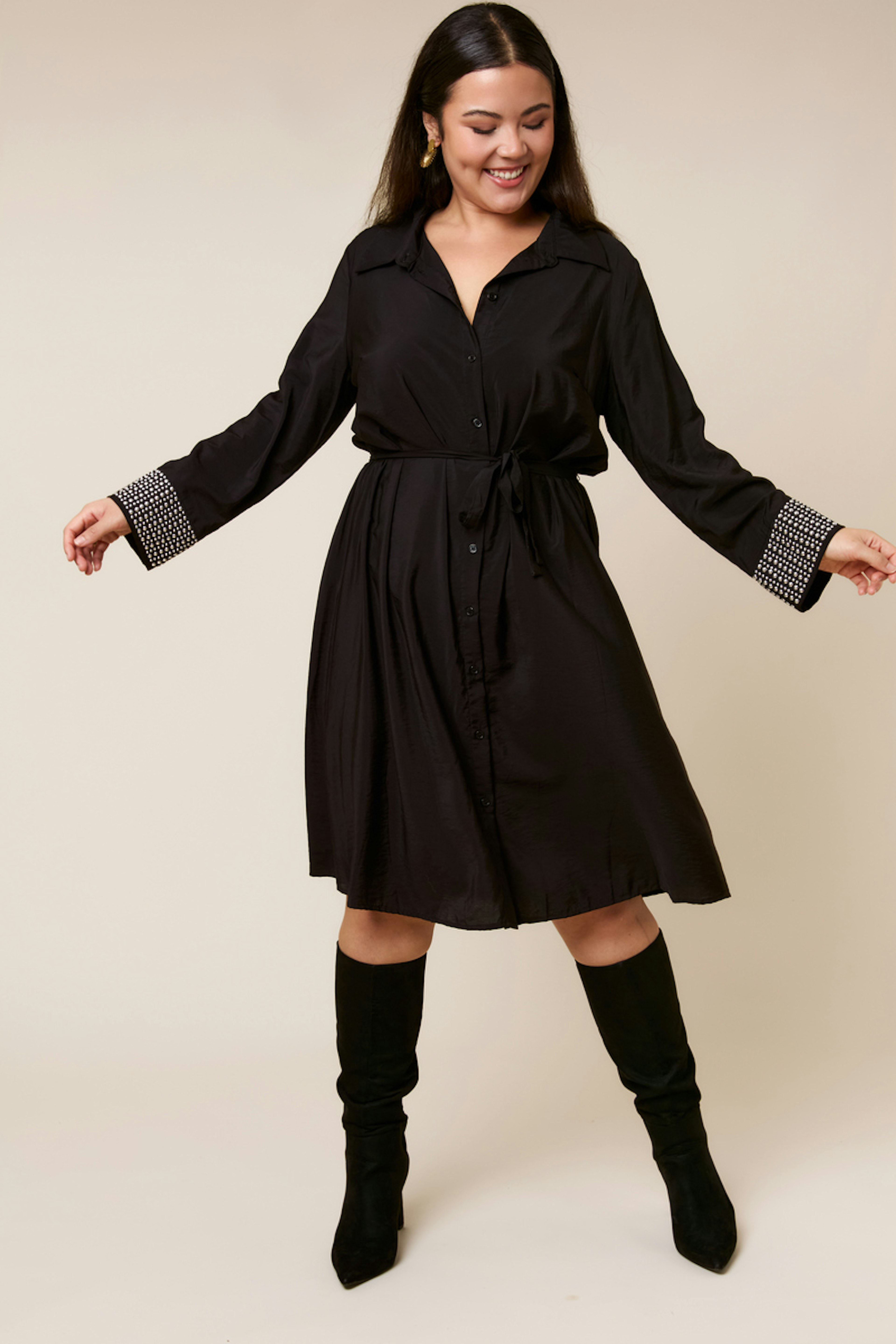 Ajoutez une touche glamour avec des bottes hautes et des bijoux argentés pour un look hivernal chic. • Robe noir en coton • Coupe portefeuille • Manches longues • Ceinture assortie • Poignets ornés de perles