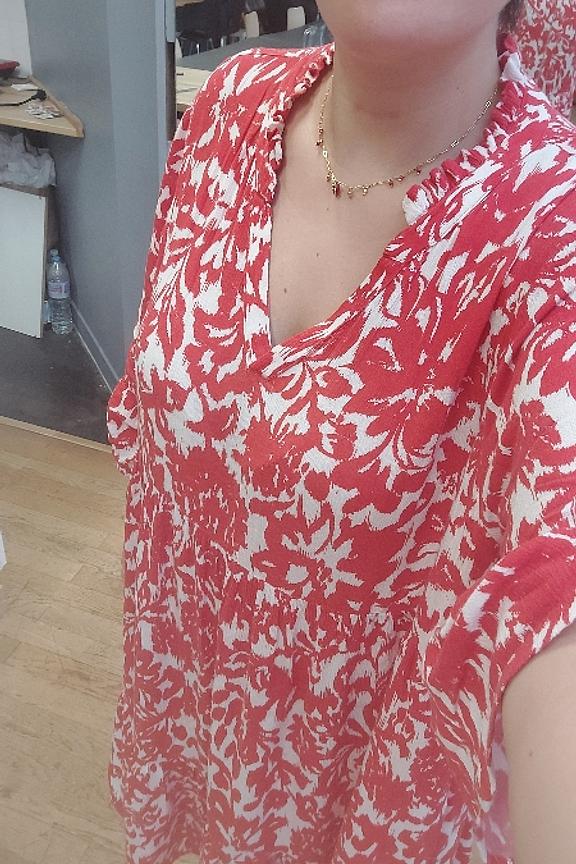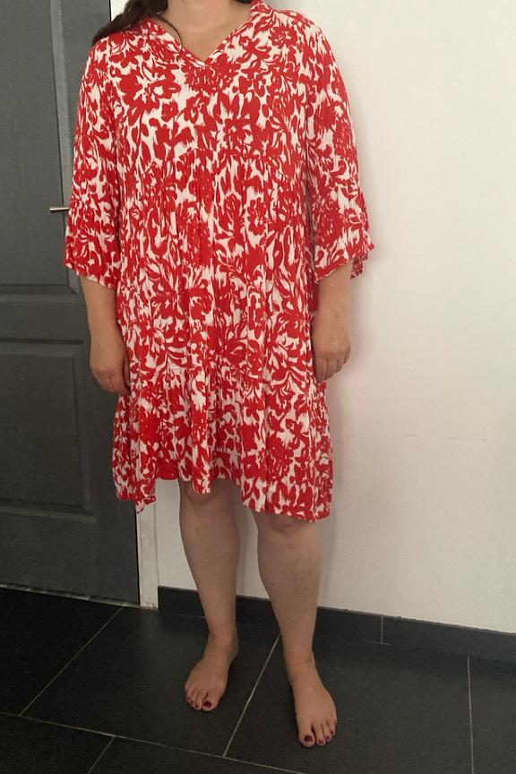 • Robe courte rouge à motifs fleuris • A-forme mais convient à toutes les morphologies • Manches 3/4 amples • Col en V avec détails de volants • Couple fluide et légère • Longueur : 98cm (T42)