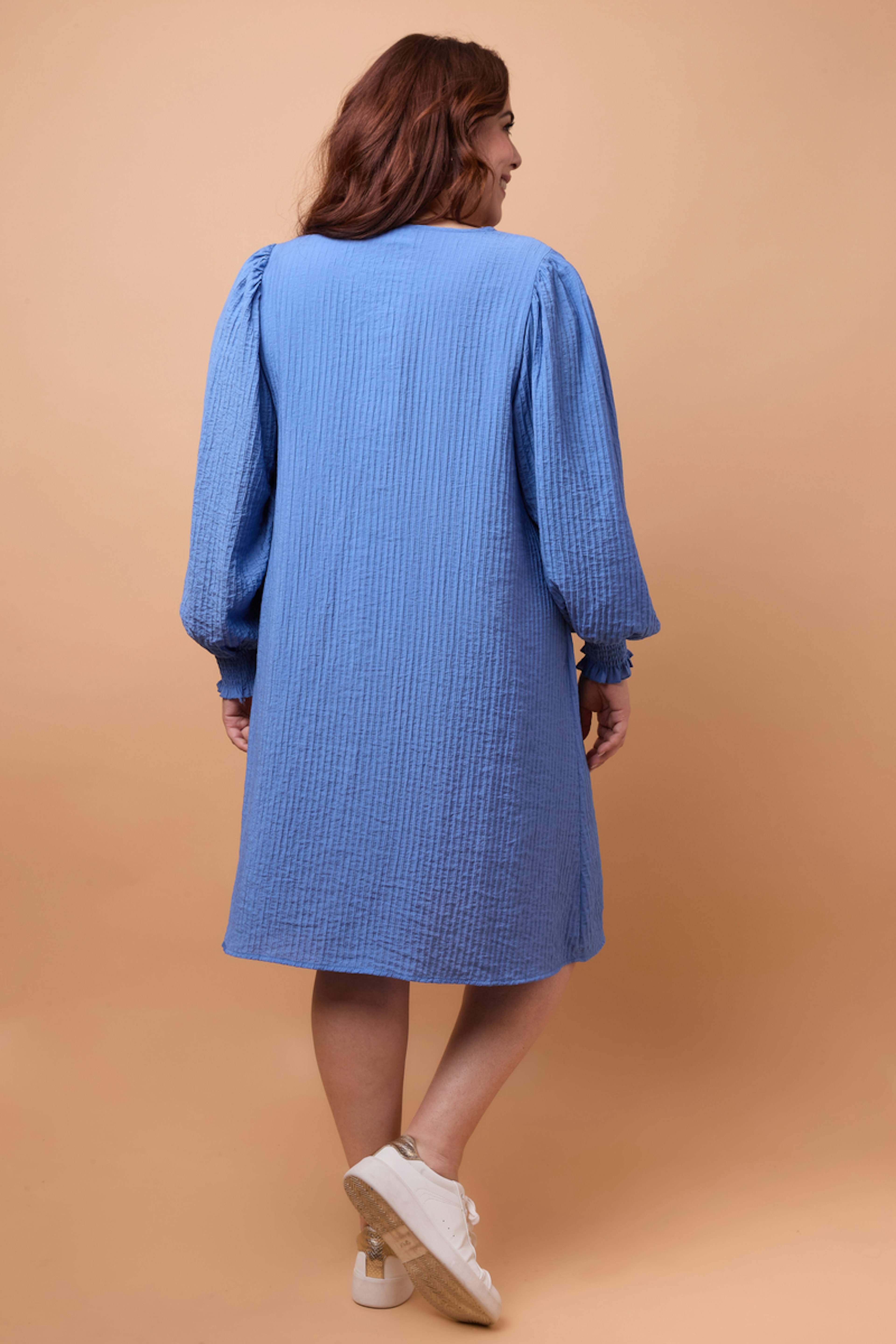 Ajoutez une ceinture en cuir tressé et des sandales dorées pour un look estival frais. • Robe courte • Décolleté en V • Manches longues bouffantes • Empiècement froncé aux épaules • Texture gaufrée