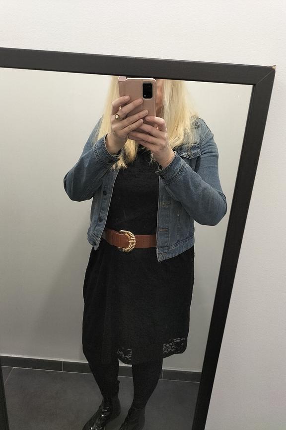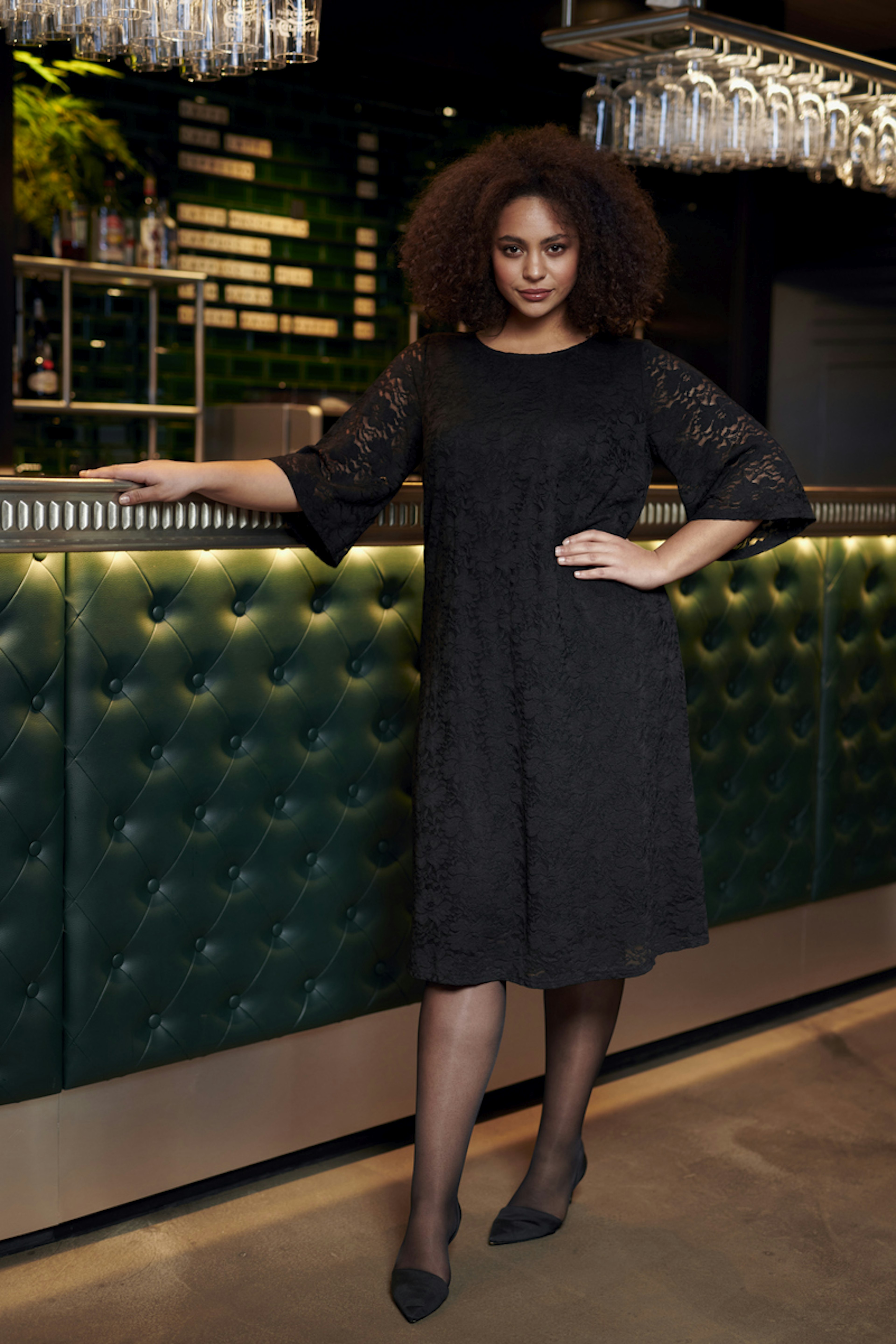 โข Robe noire en dentelle รฉlรฉgante avec jeu de transparence โข Doublure โข Manches courtes โข Coupe รฉvasรฉe โข Fermeture goutte dans le haut du dos
