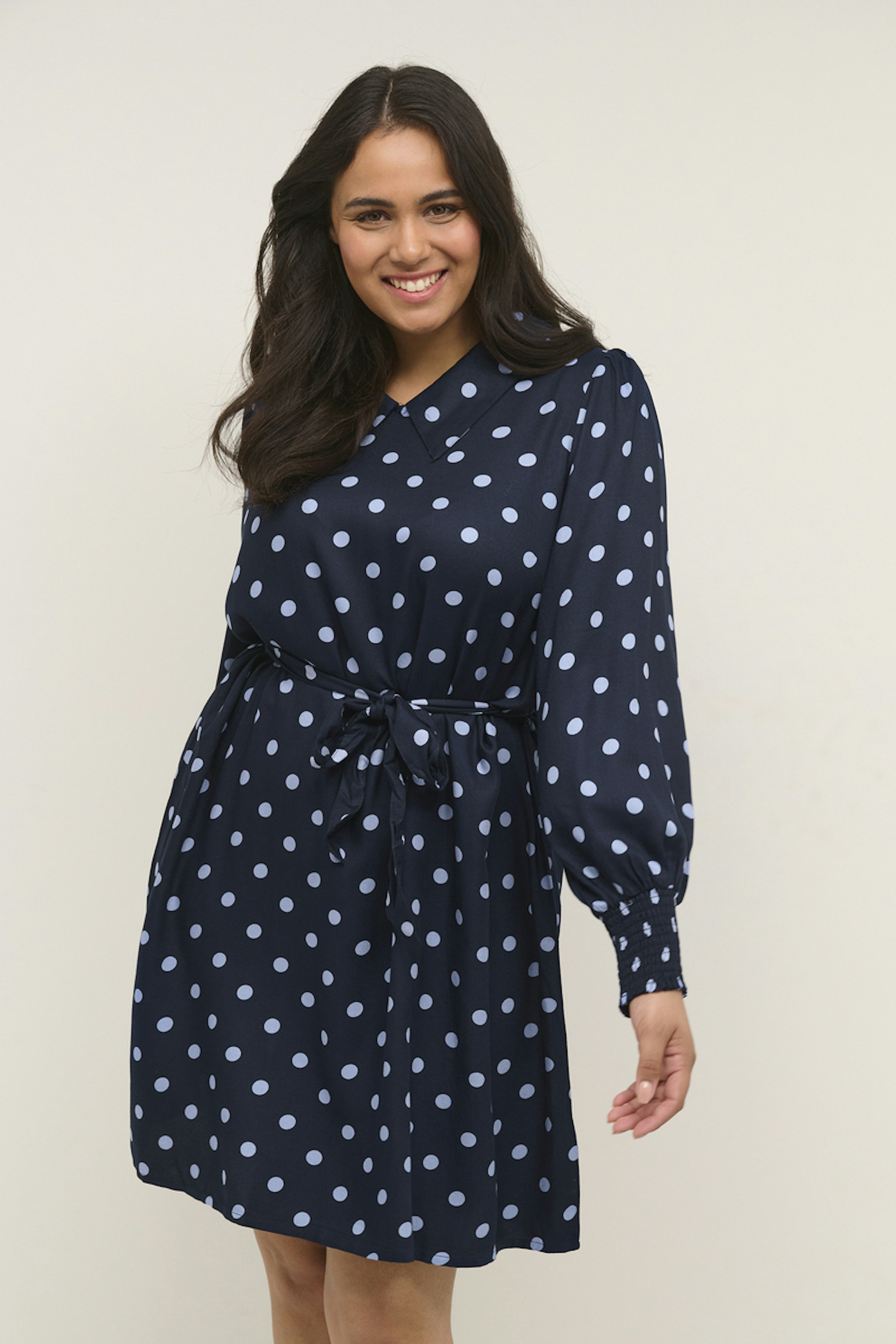 โข Robe chemise bleu marine โข Imprimรฉ ร pois bleu ciel โข Taille cintrรฉe avec ceinture ร nouer โข Manches ballons resserrรฉes aux poignets โข Longueur au-dessus du genou โข Tissu en viscose certifiรฉe รฉcovero