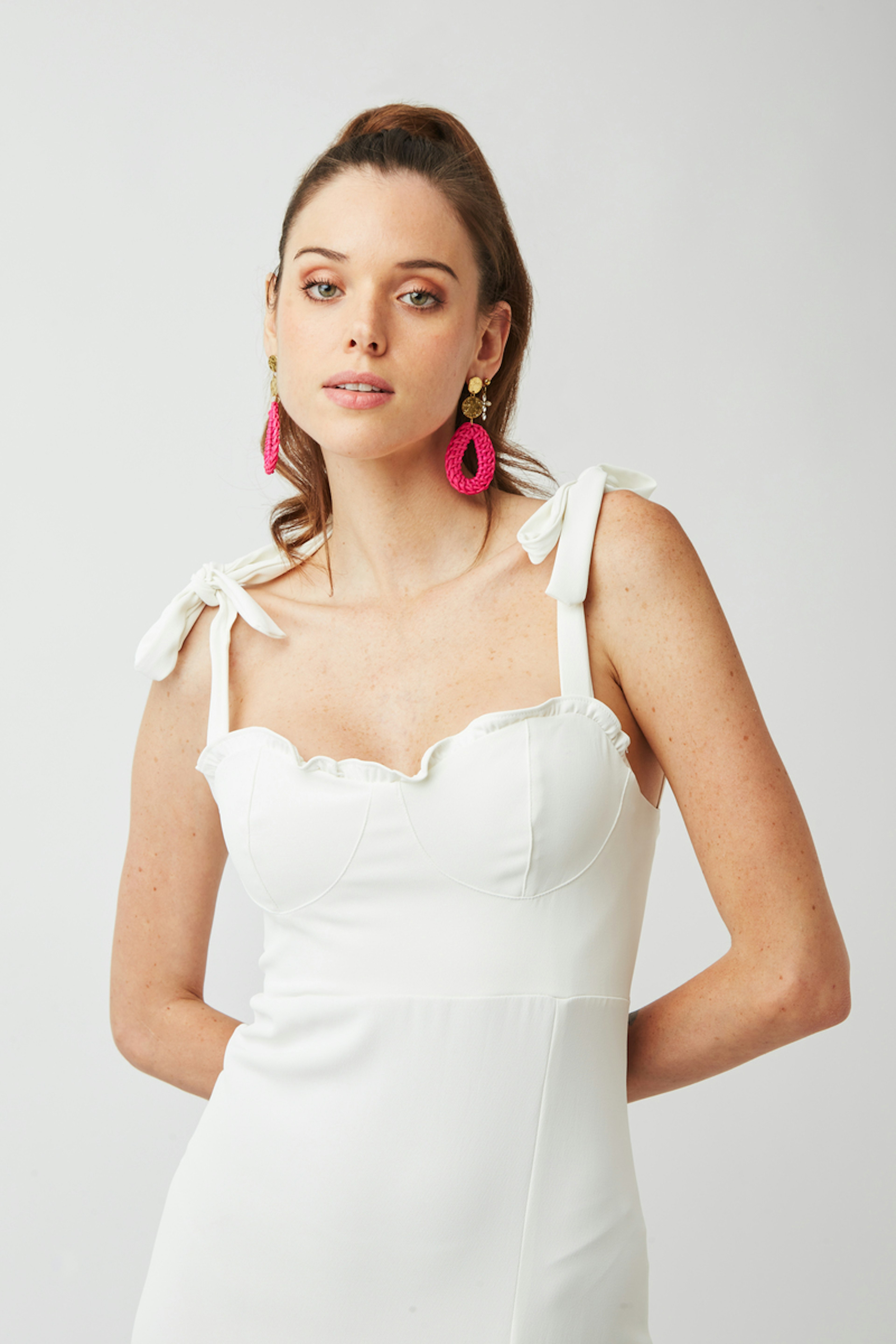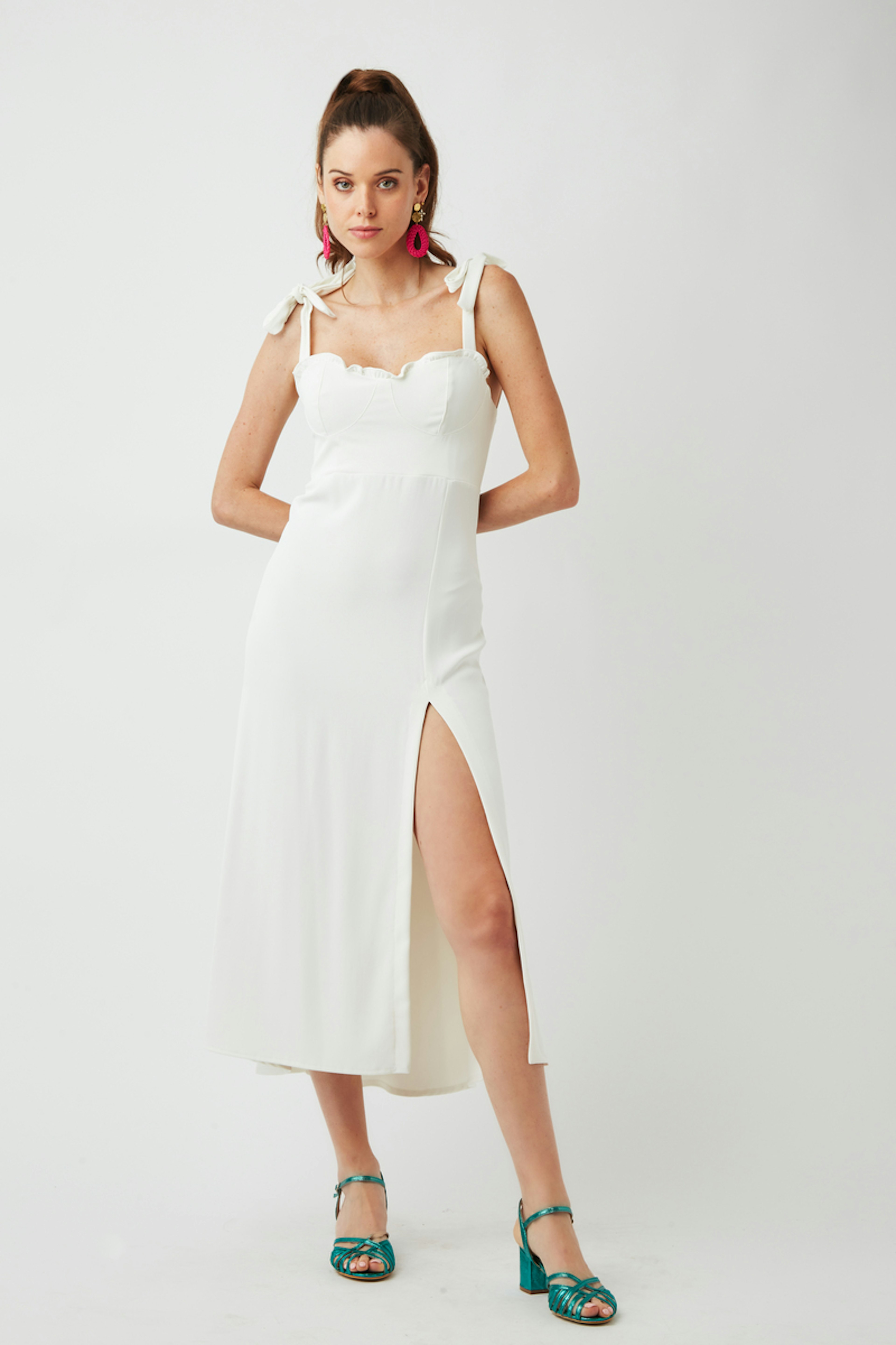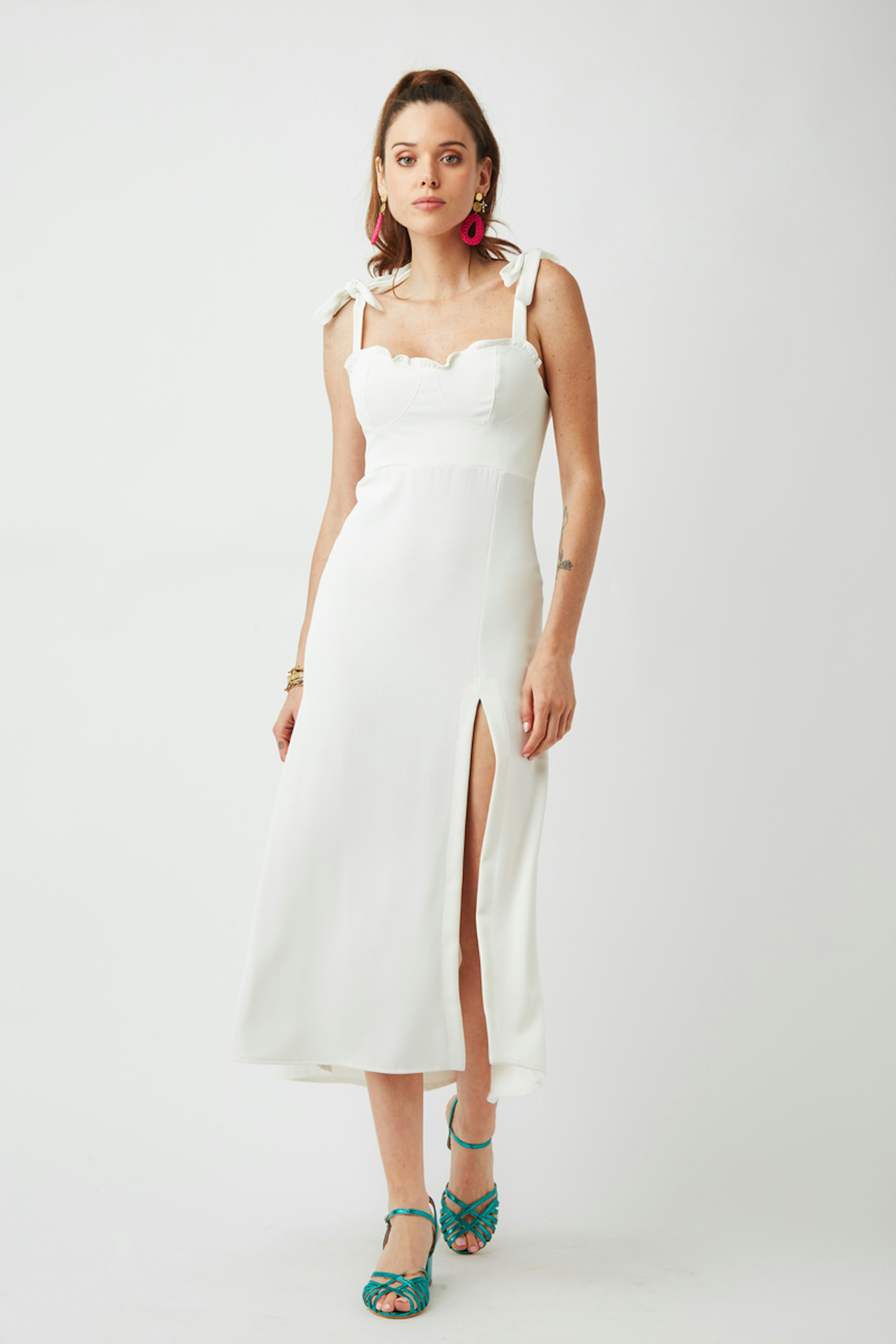 โข Robe blanche mi longue โข Fente latรฉrale รฉlรฉgante โข Dรฉcolletรฉ ร volants โข Bretelles rรฉglables nouรฉes dรฉlicatement