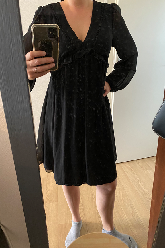 โข Robe courte โข Manches longues transparentes lรฉgรจrement bouffantes โข Poignets รฉlastiquรฉs โข Col V โข Doublรฉe sur le haut ร l'avant โข Bas intรฉgralement doublรฉ โข Dรฉtail en maille ajourรฉe au niveau du col โข Volants sous la poitrine