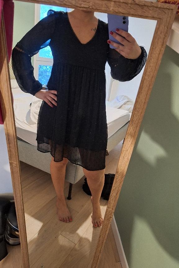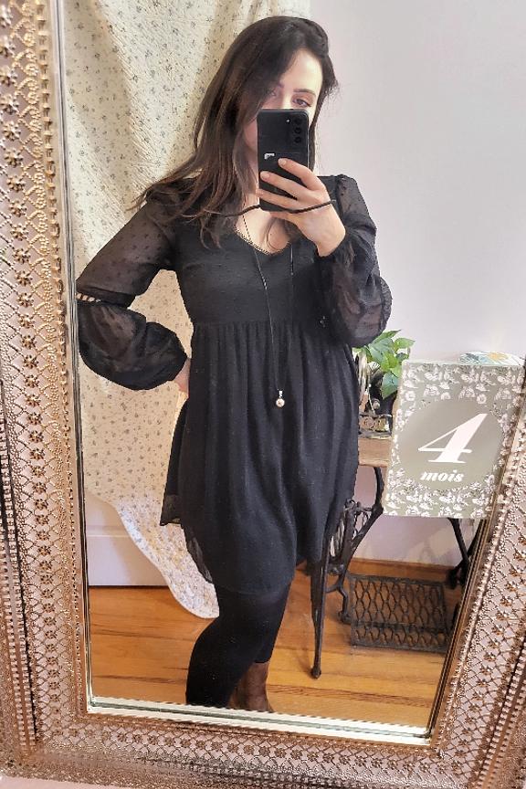 โ€ข Robe ร  manches longues noire โ€ข Col V โ€ข Coupe droite โ€ข Manches bouffantes โ€ข Motif plumetis โ€ข Transparence des manches et dans le dos