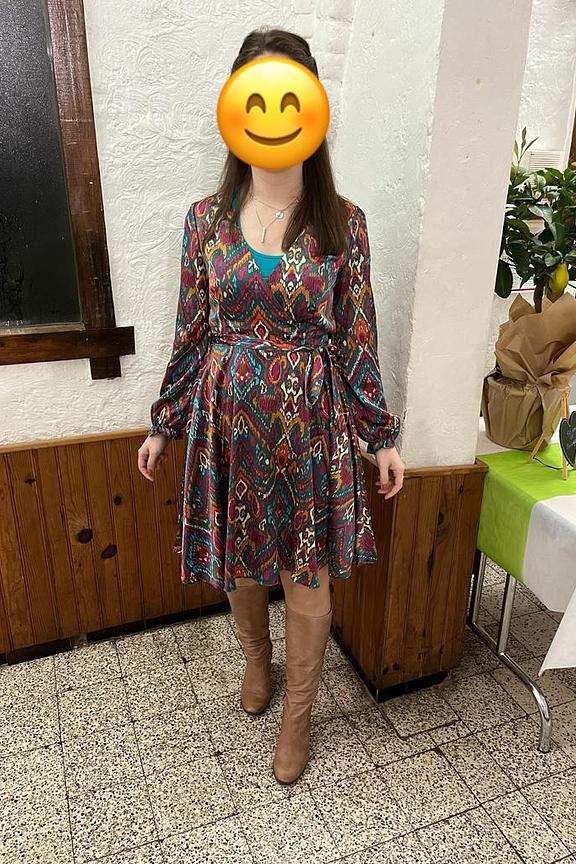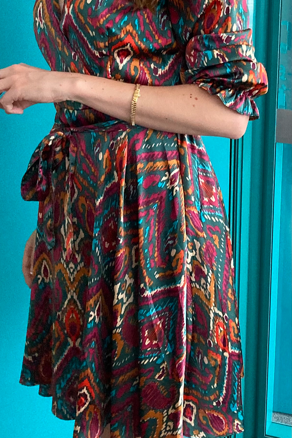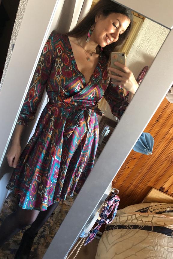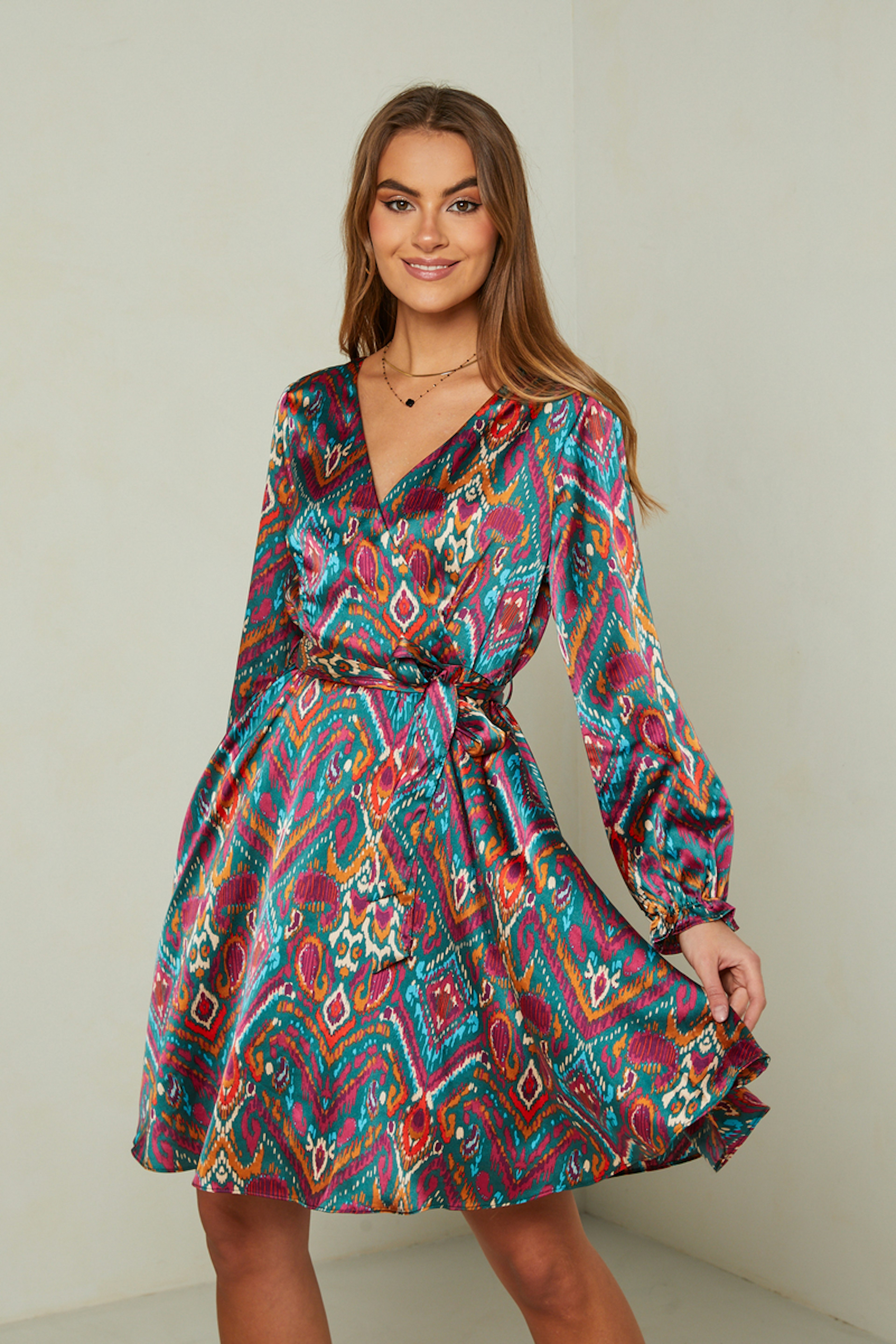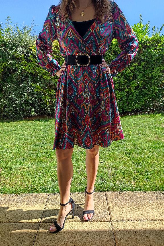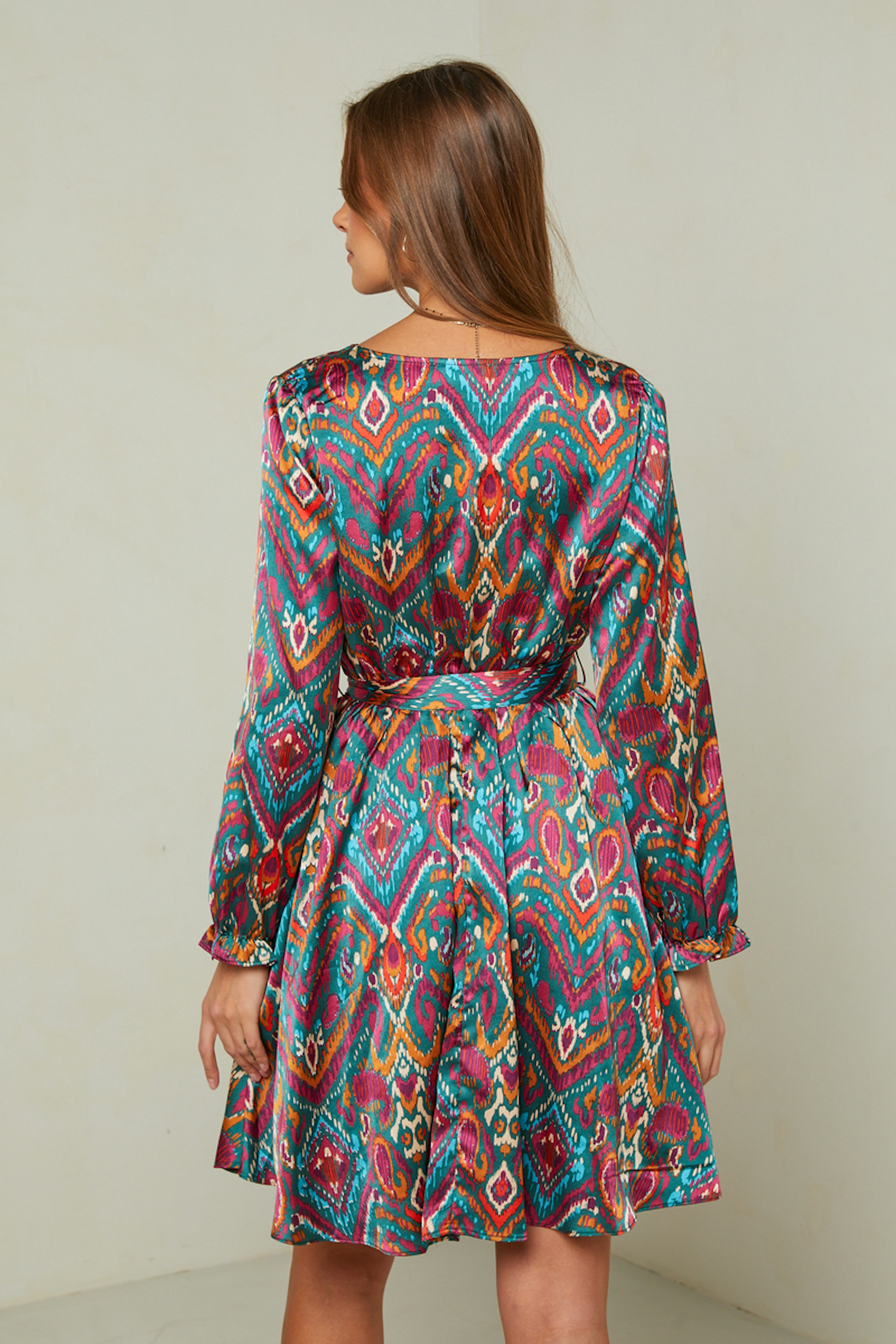 โข Robe courte imprimรฉs multicolores originaux โข Manches longues avec poignets รฉlastiques โข Col cache-cลur nouรฉ sur le cรดtรฉ โข Ceinture ton sur ton โข Jupe large et fluide