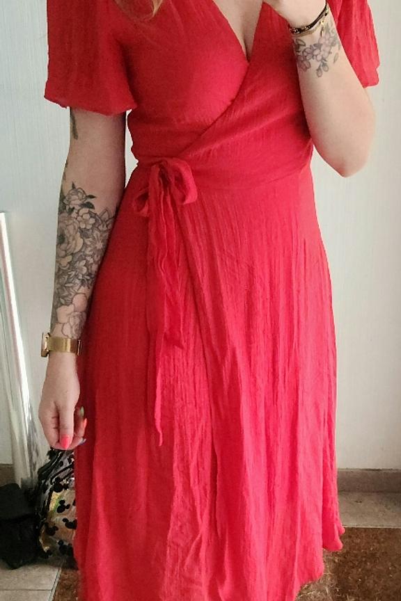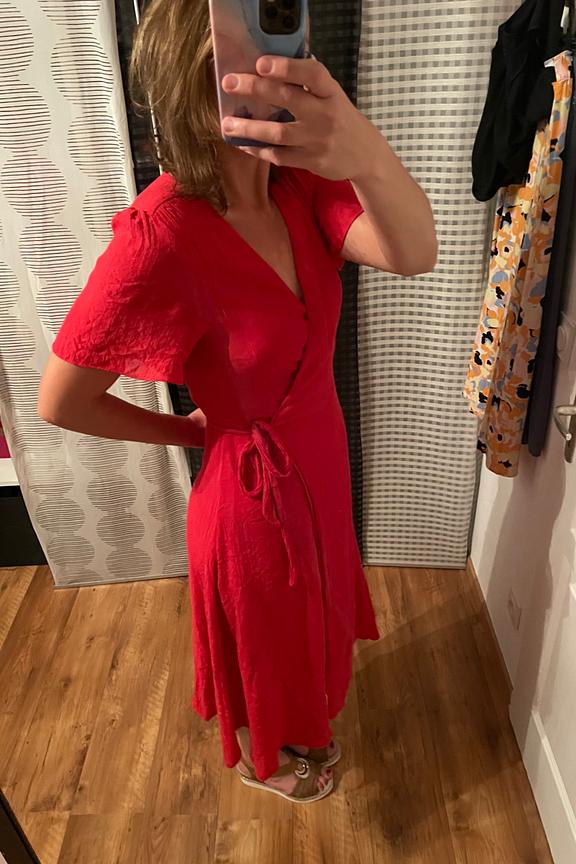 Pour un look estival chic, associez cette robe rouge éclatante à des sandales dorées et un chapeau de paille pour une touche glamour. Parfaite pour les soirées d'été ou les escapades en bord de mer. • Robe portefeuille • Décolleté en V • Manches courtes • Jupe midi fendue