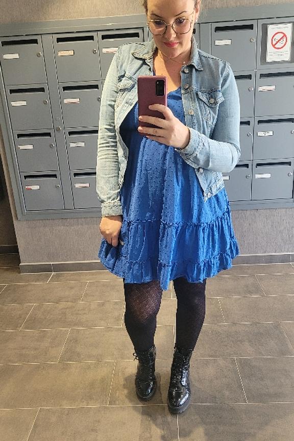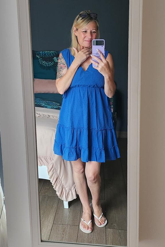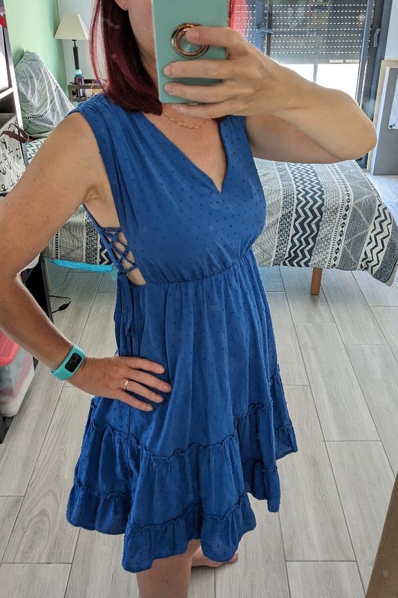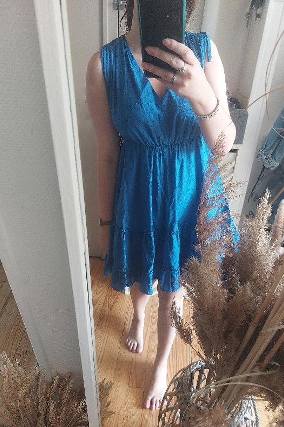 โข Robe coupe patineuse โข Col en V et dรฉcolletรฉ de dos โข Liens de corsage sur les cรดtรฉ โข Bas double volantรฉ โข Pois en relief