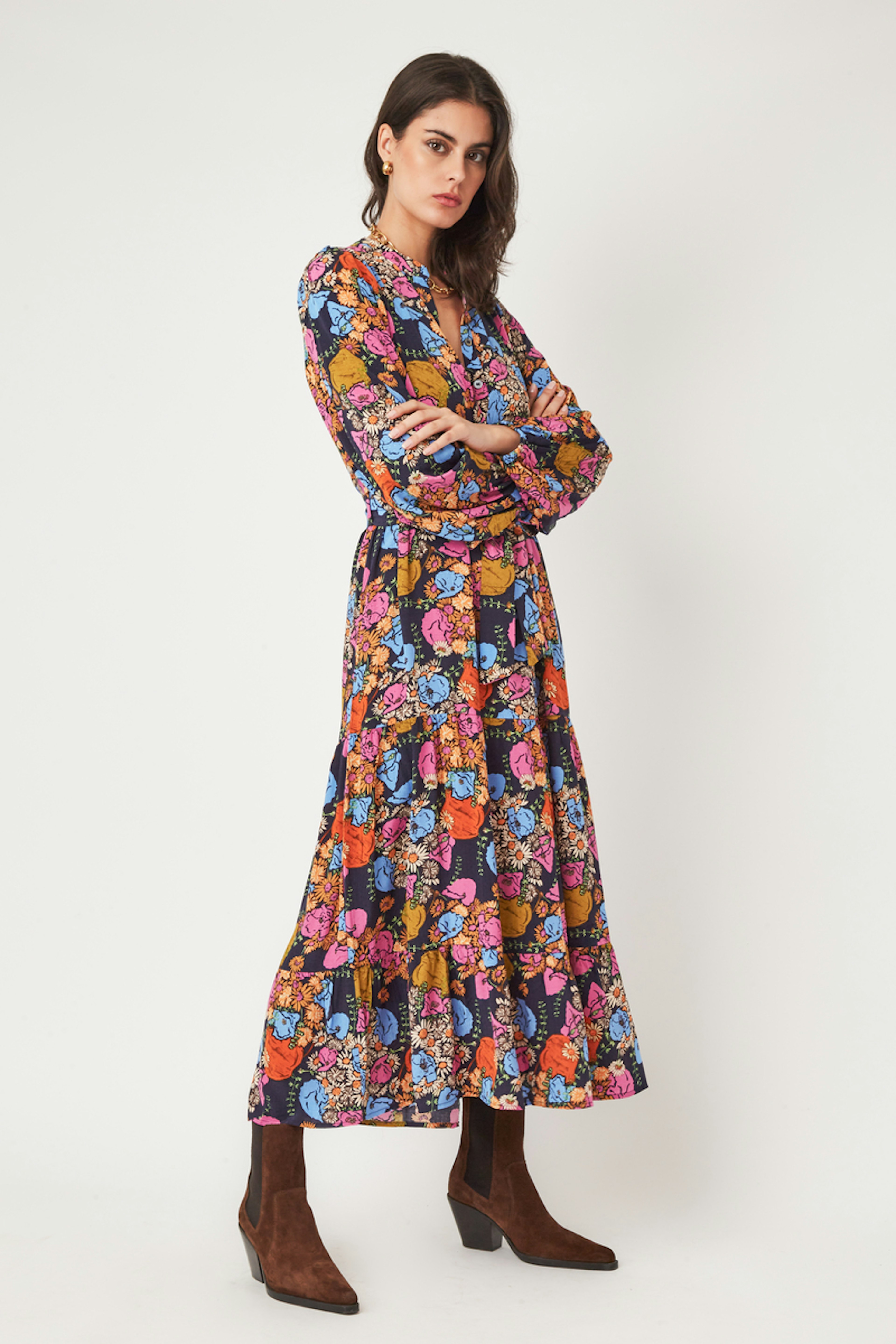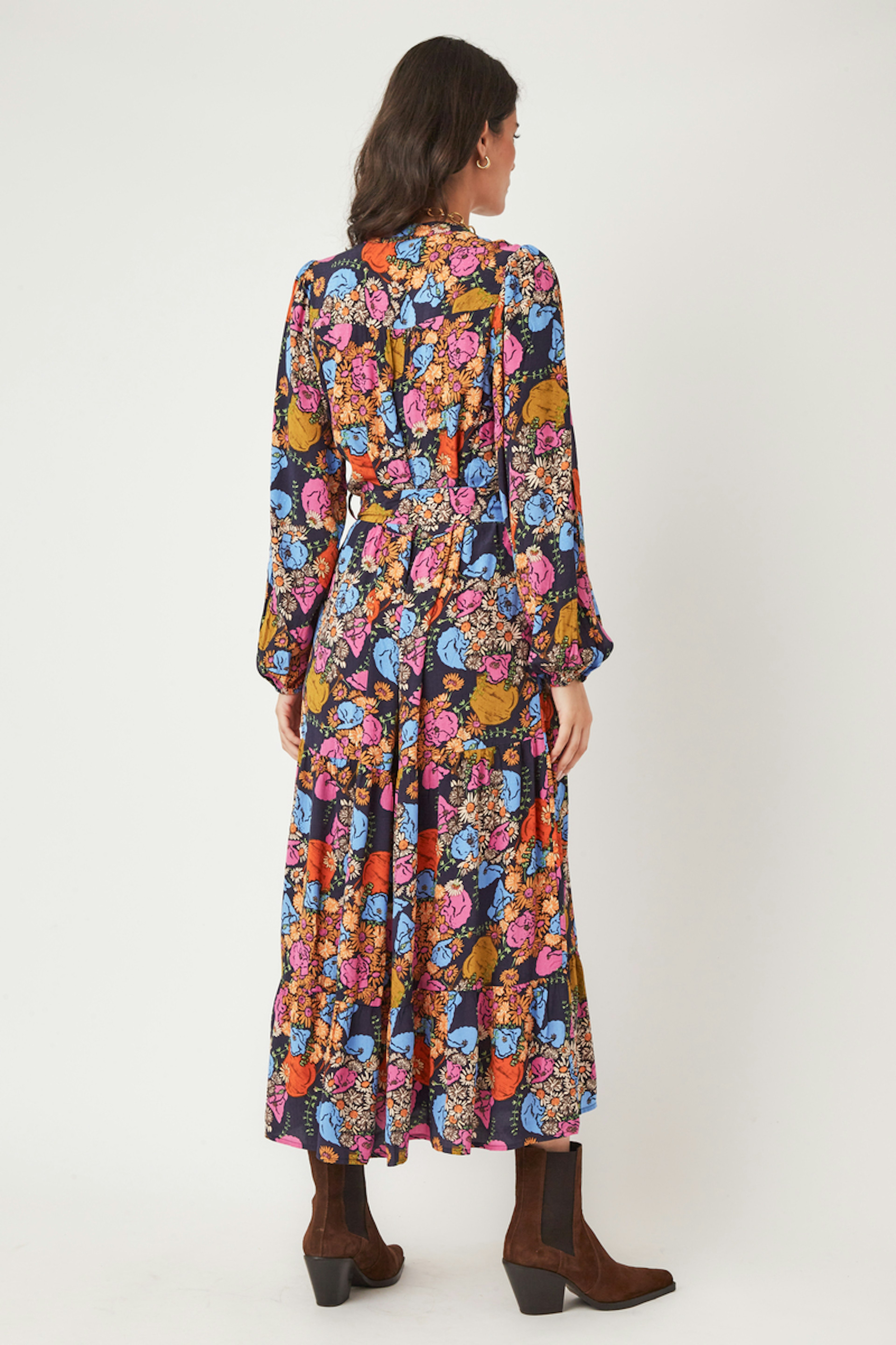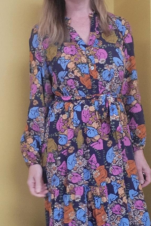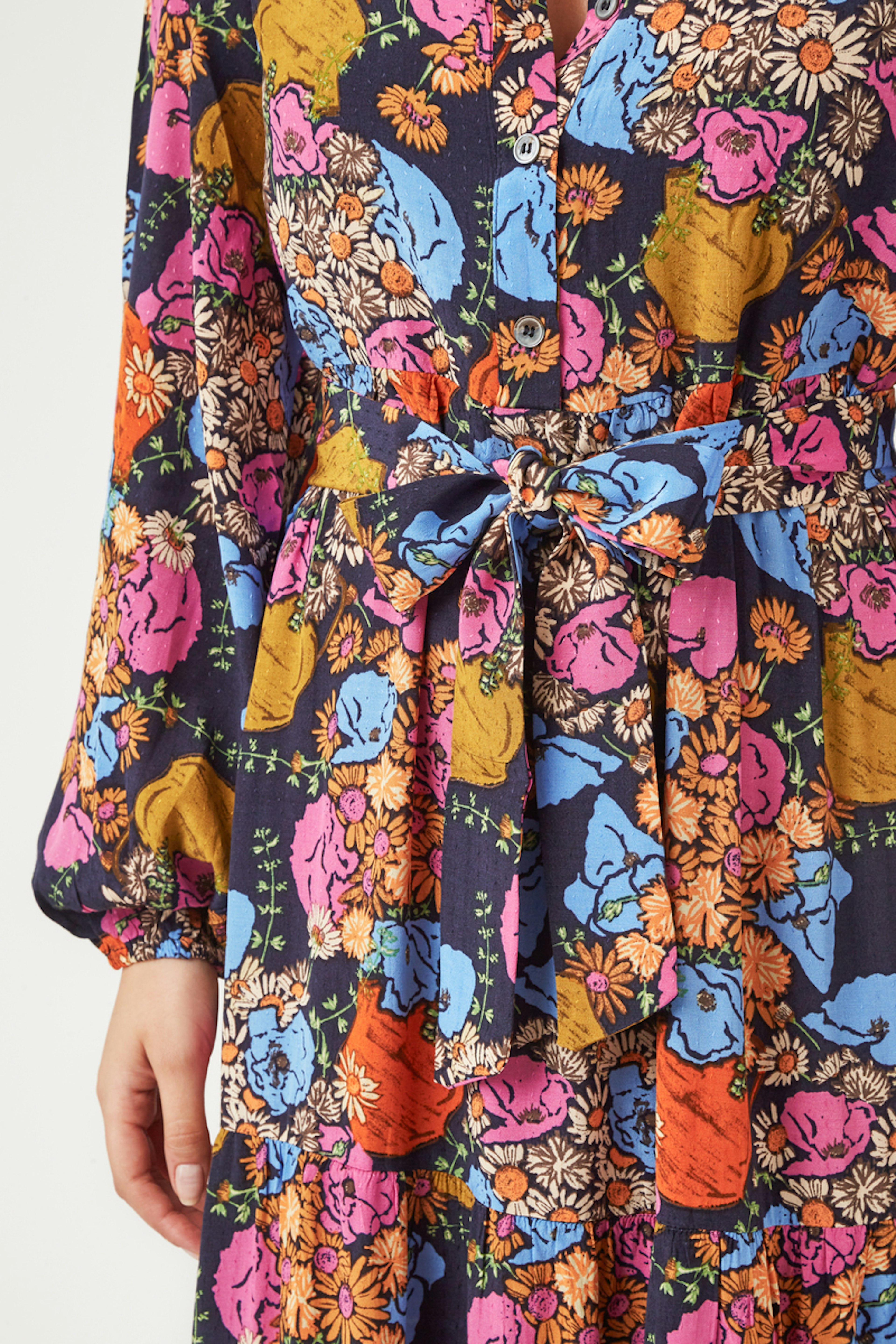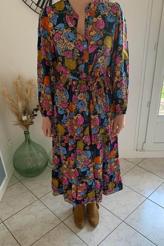โ€ข Robe midi ร  manches longues โ€ข Manches ballons โ€ข Fermeture poitrine ร  boutons โ€ข Passants et ceinture amovible ร  nouer ร  la taille โ€ข Imprimรฉ Mano Mani(Design par FRNCH)