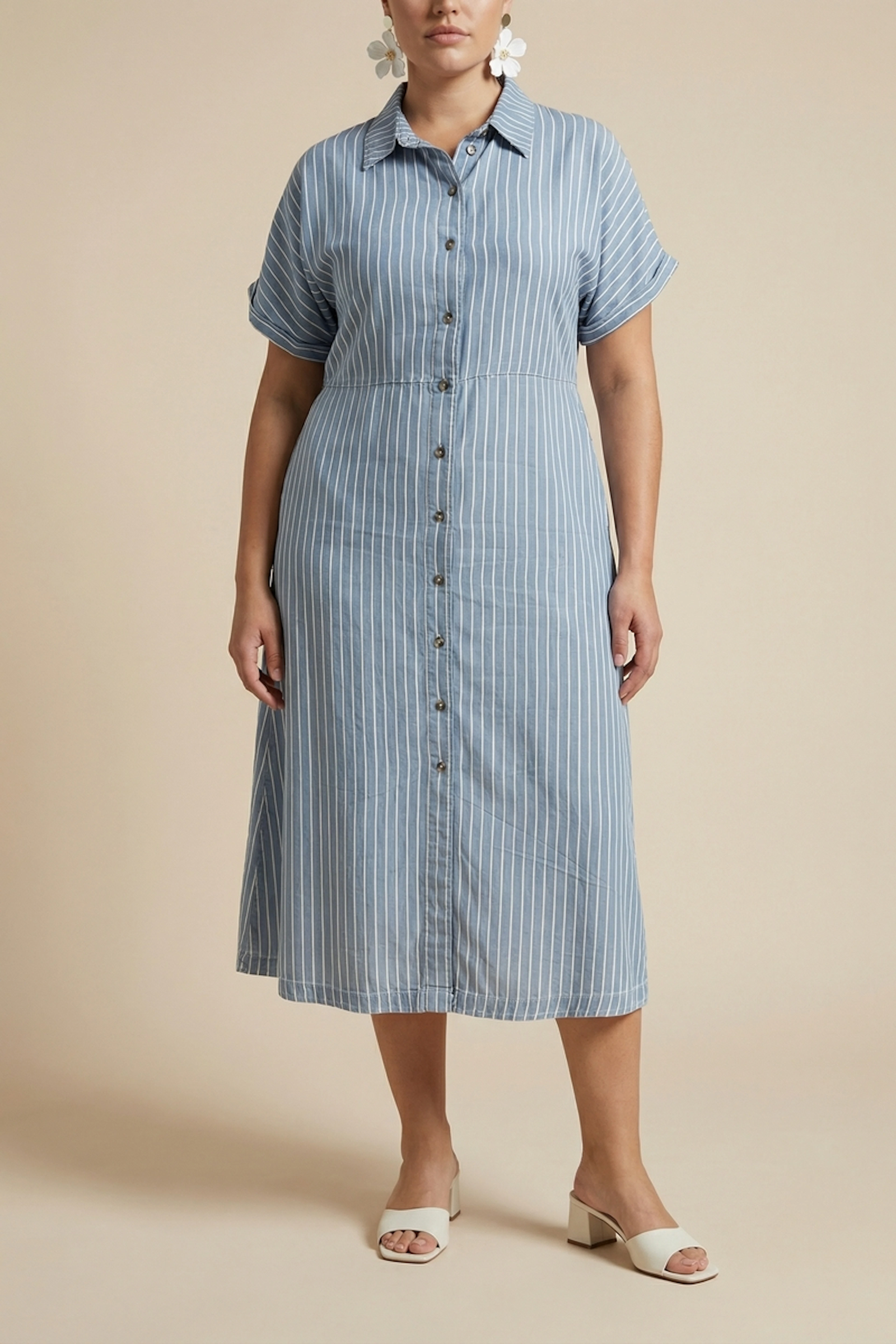 Associez cette robe à une paire de sandales légères et un chapeau de paille pour un look estival décontracté. Parfait pour une journée ensoleillée. • Robe en coton • Coupe chemise • Manches courtes • Rayures verticales • Boutonnage sur le devant