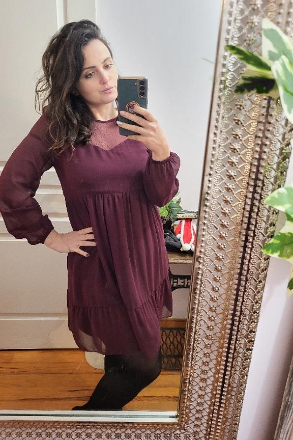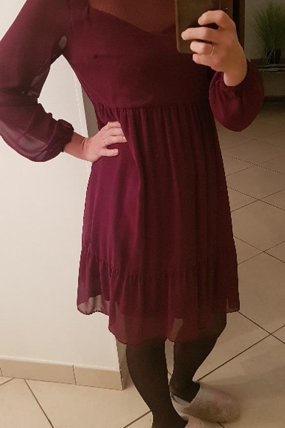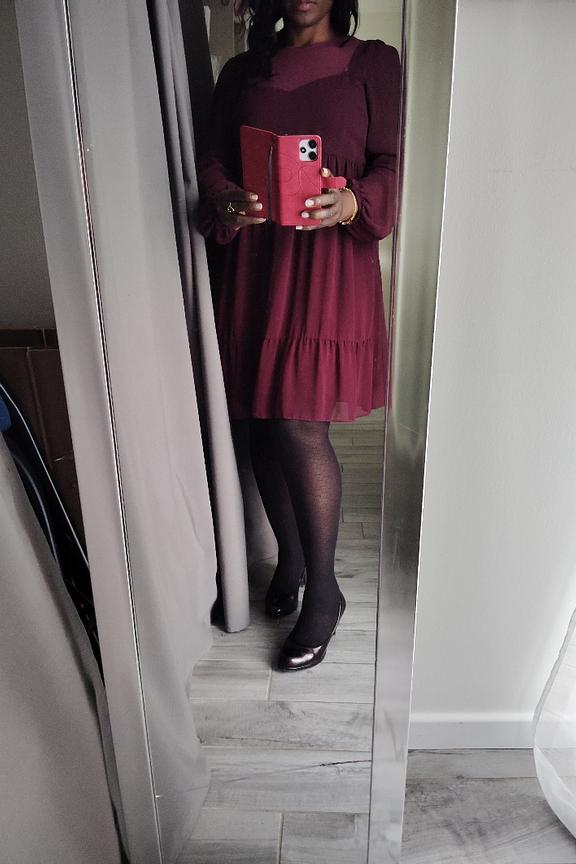 โข Robe ร manches longues รฉvasรฉe bordeaux โข Dรฉcolletรฉ et manches transparentes โข Dรฉtails de lurex dans le tissu