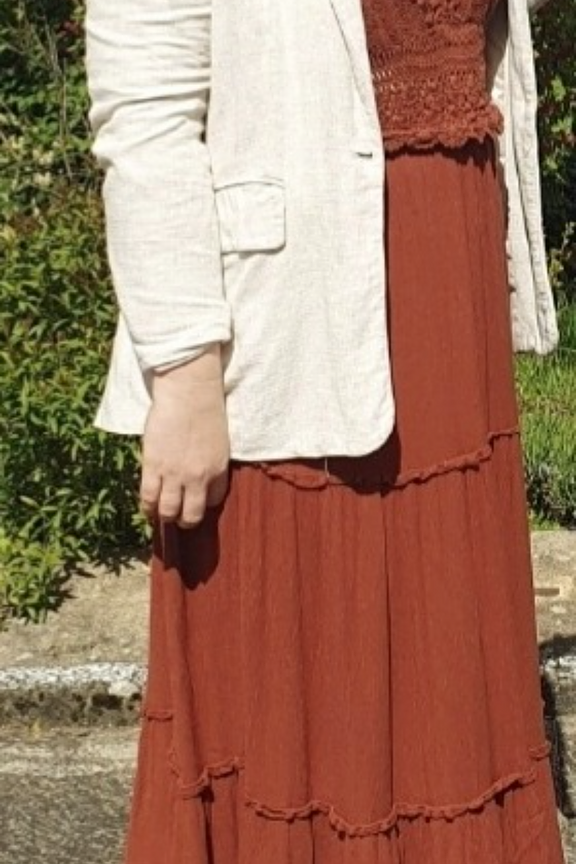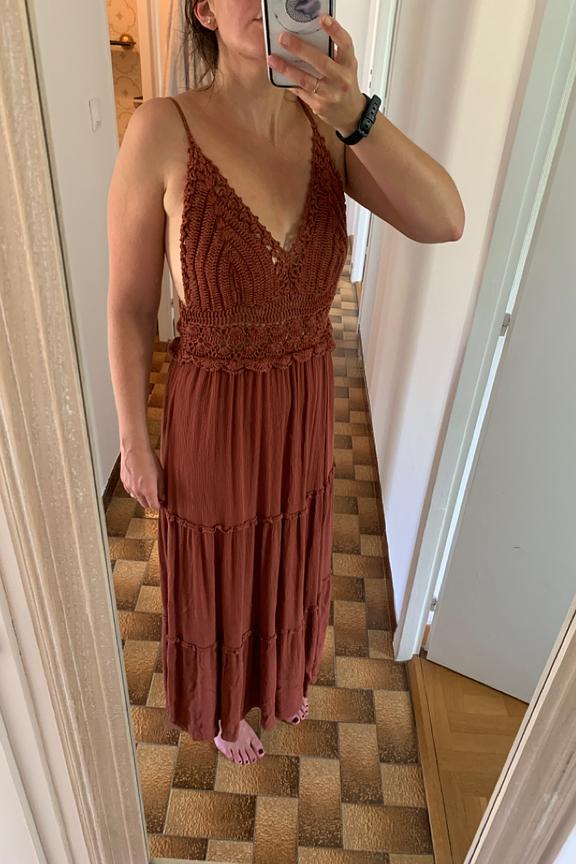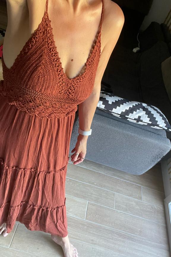 โข Robe estivale brique โข Haut sans manches prรจs du corps crochet โข Jupe fluide longue โข Taille cintrรฉe ร l'aide d'une ceinture โข Conรงue dans un tissu fluide en viscose