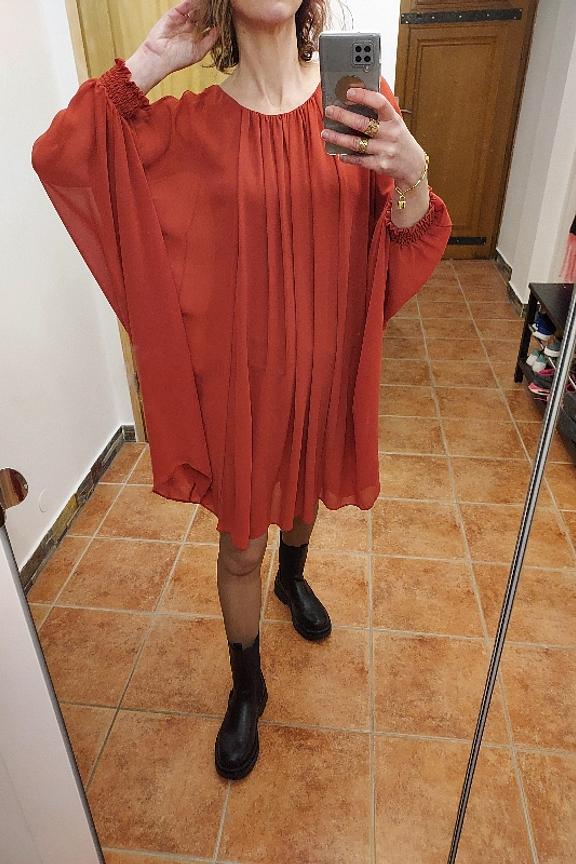 โข Robe ร manches 3/4 rouge โข Tissu fluide โข Longueur genou โข Ouverture dos