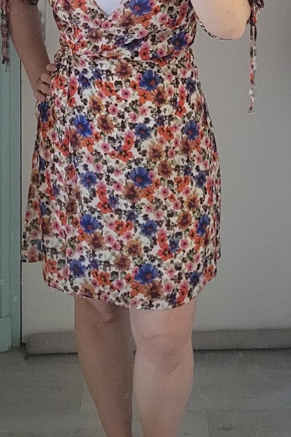Labougie est une robe imprimรฉe fleurie ร porter pour la mi-saison. โข Robe imprimรฉe fleurie โข Manches 3/4 froncรฉes โข Longueur genou โข Dรฉcolletรฉ plongeant