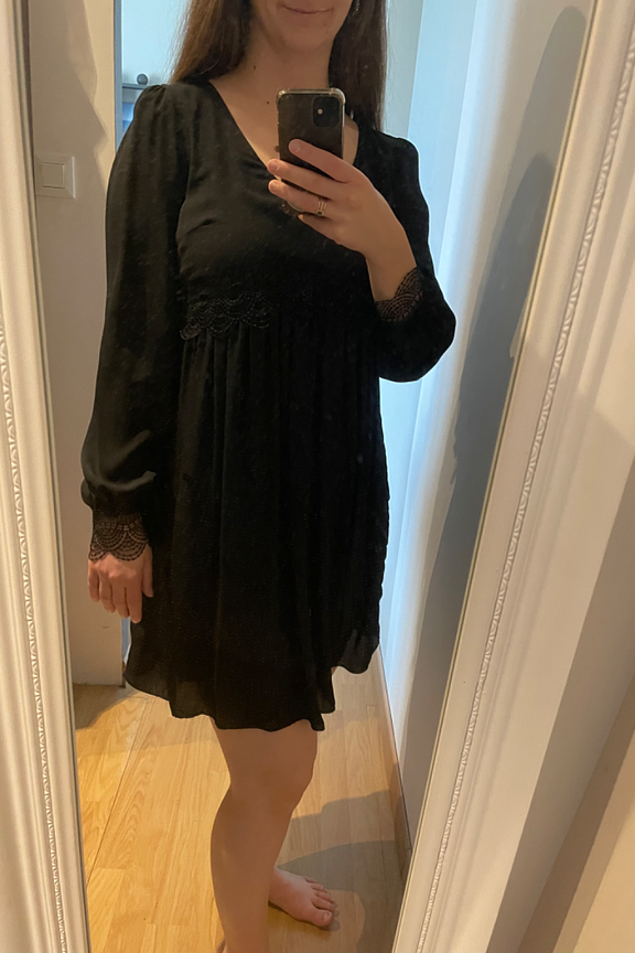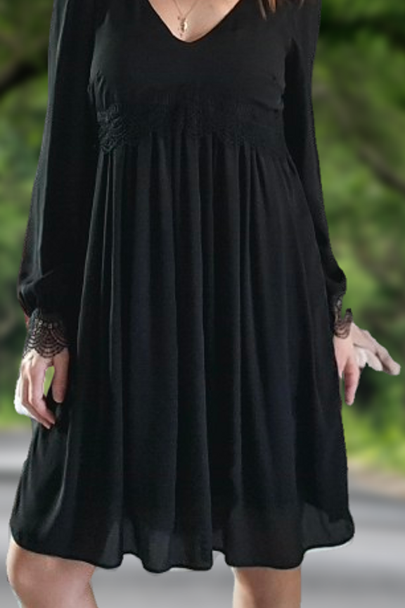 โข Robe ร manches longues noire โข Col V โข Coupe droite โข Dentelle sur les manches et sous le dรฉcolletรฉ