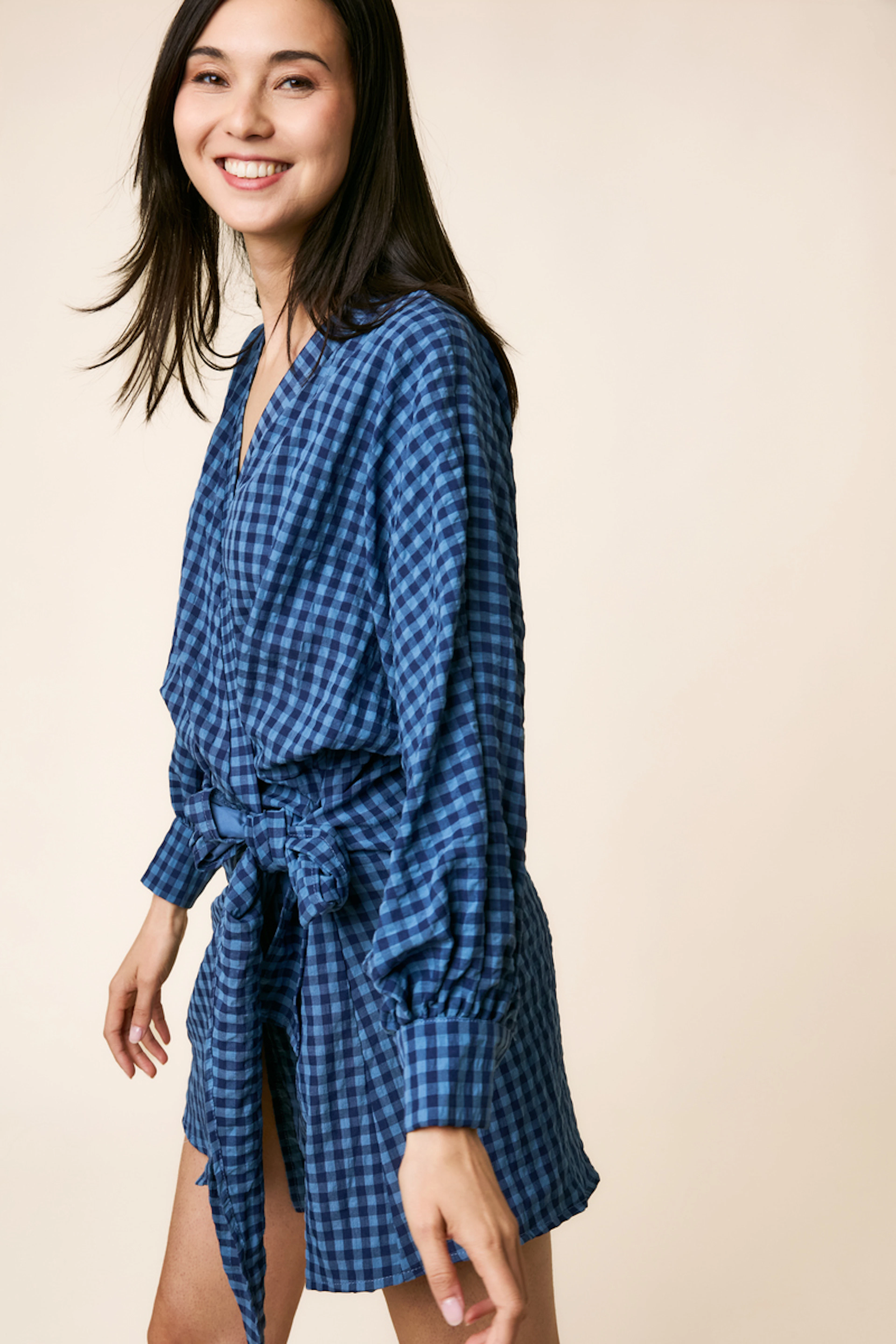 Associez cette robe avec des bottines blanches et un sac à main en cuir pour une balade ensoleillée en été. • Robe à motif • Coupe portefeuille • Manches longues amples • Encolure en V • Ceinture à nouer à la taille