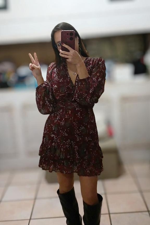 Associez cette robe à des bottes camel et un chapeau en feutre pour un look bohème chic. Parfaite pour toutes les saisons. • Robe courte • Décolleté en V • Manches longues • Jupe à volants • Imprimé floral