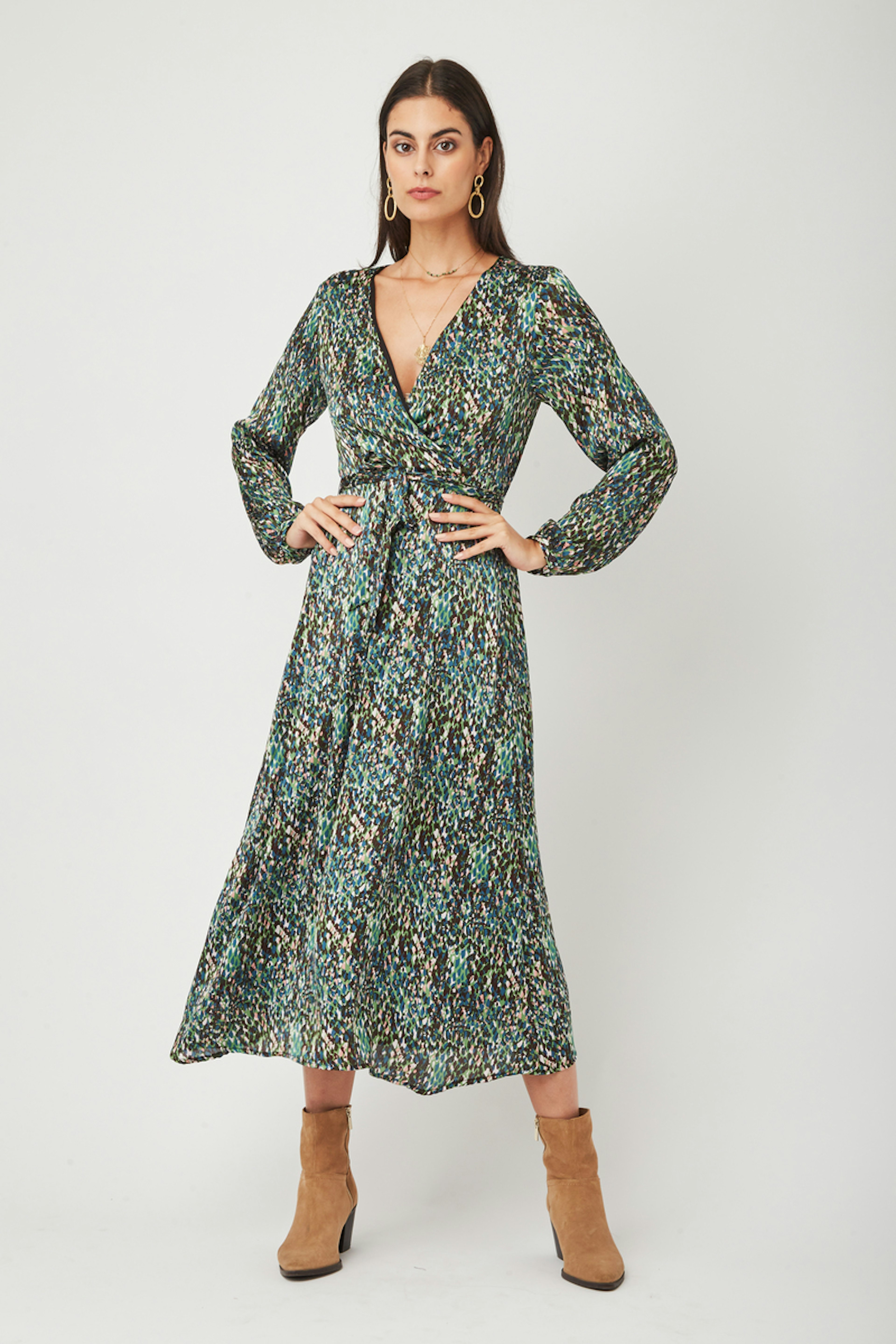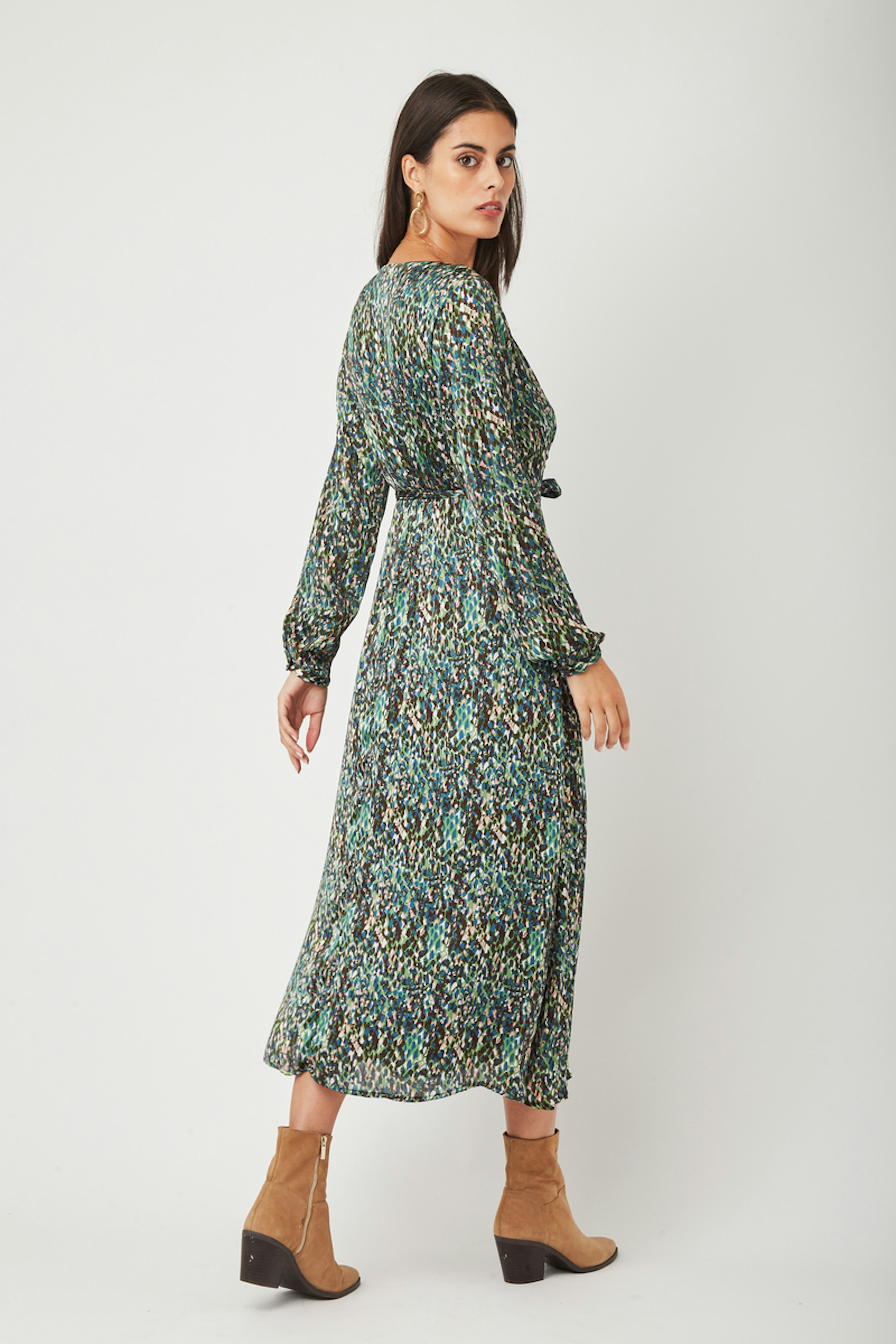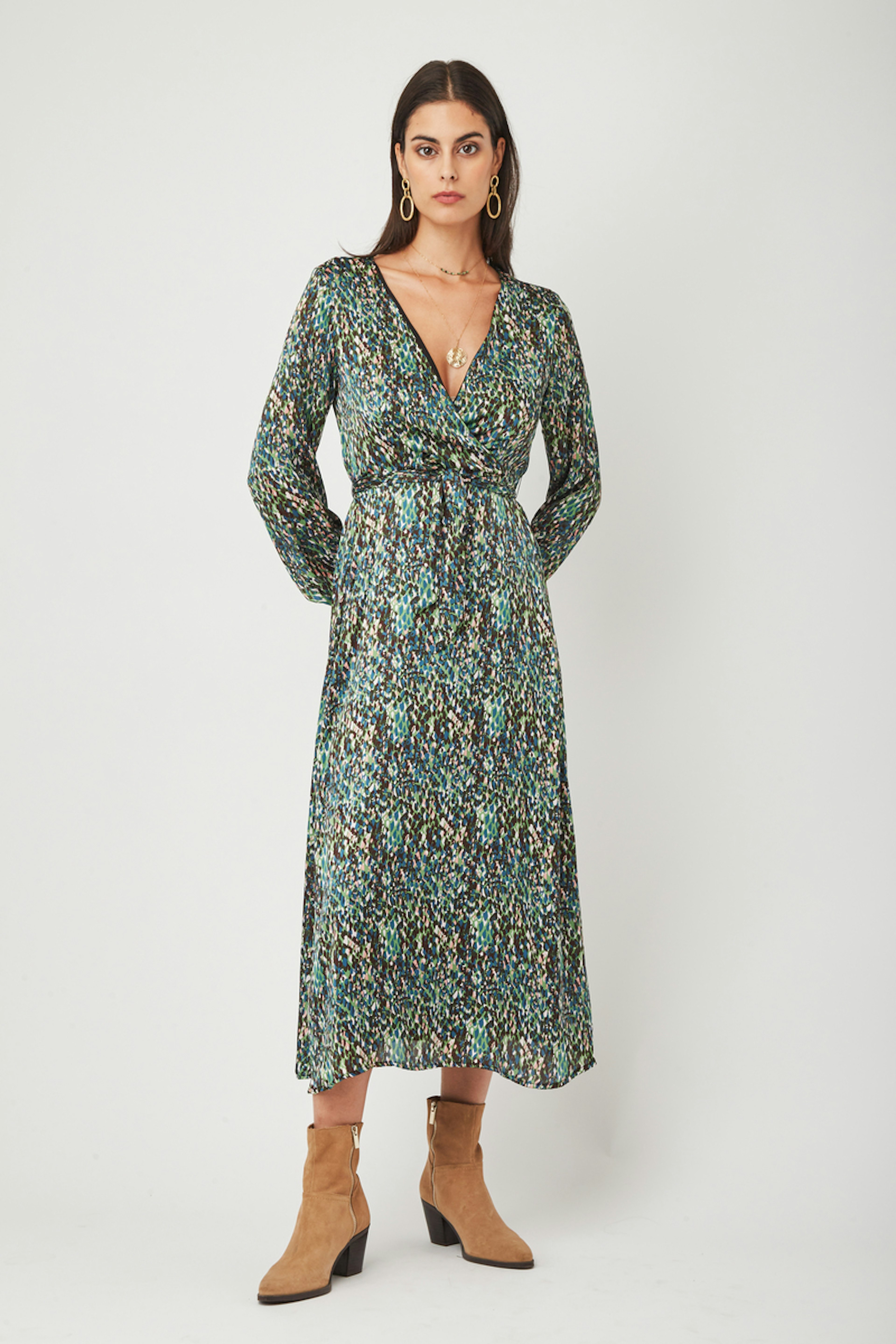 โข Robe longue ceinturรฉe โข Imprimรฉ bleu, vert, marron, รฉcru โข Col v โข Ceinture ton sur ton โข Manches longues resserrรฉes