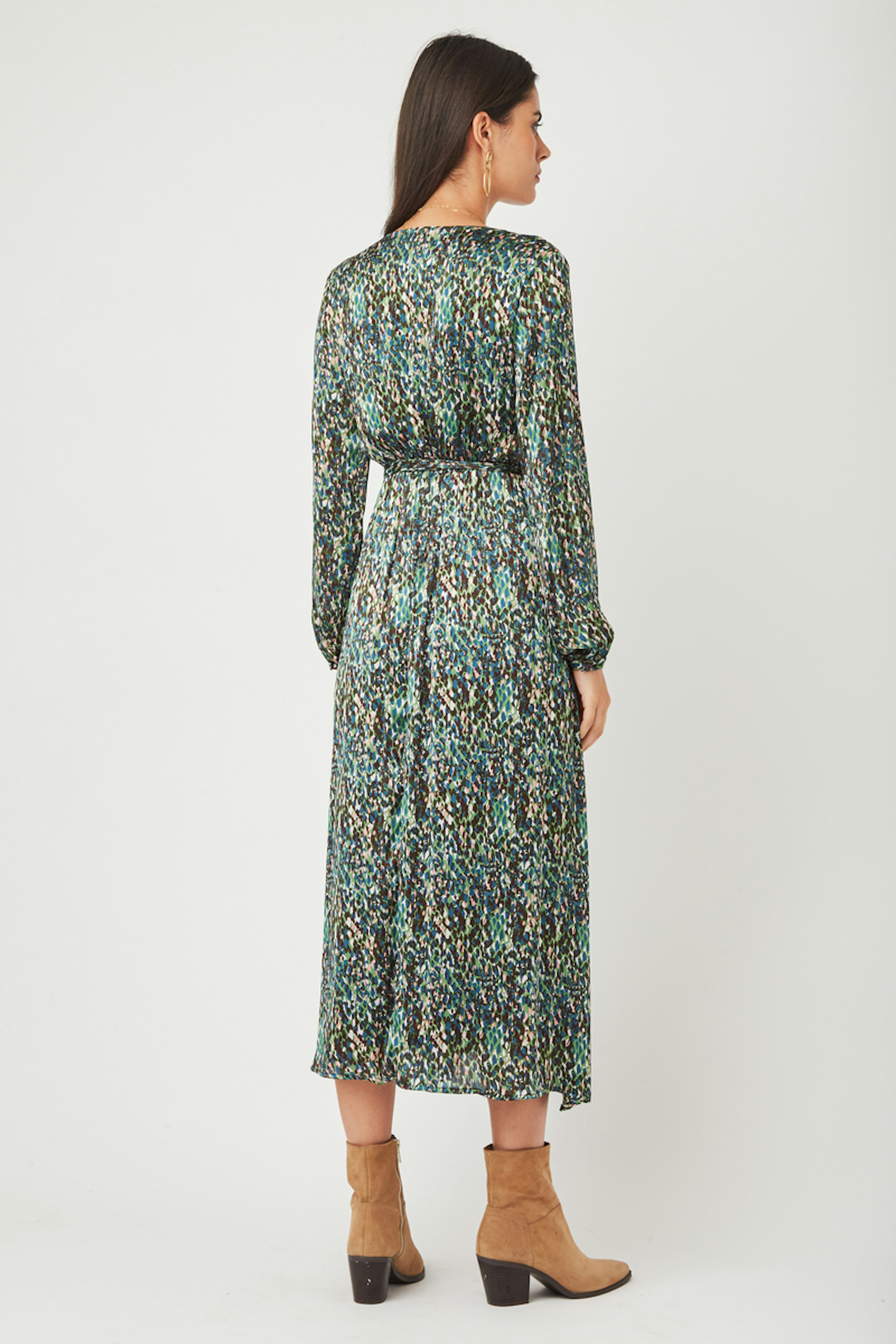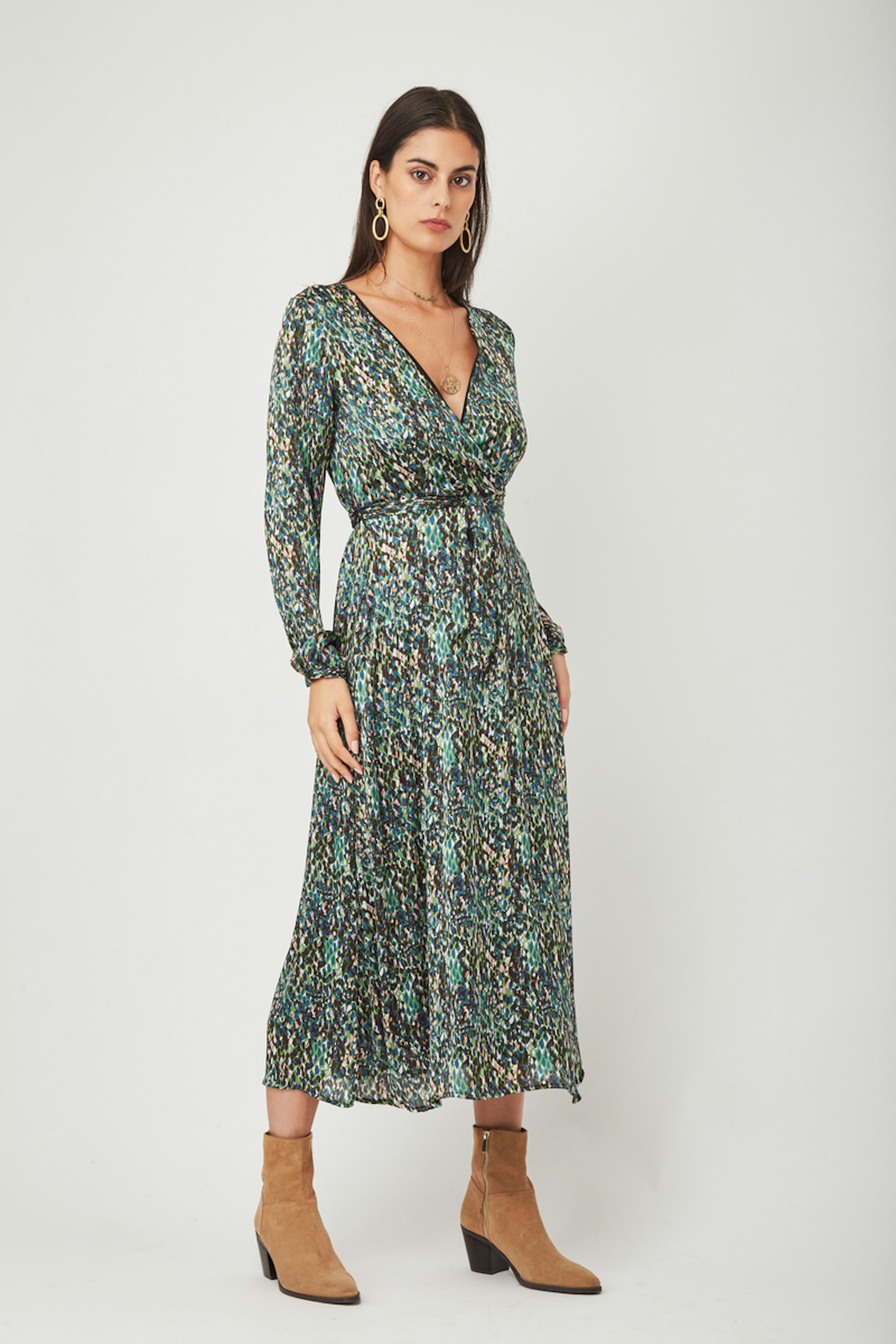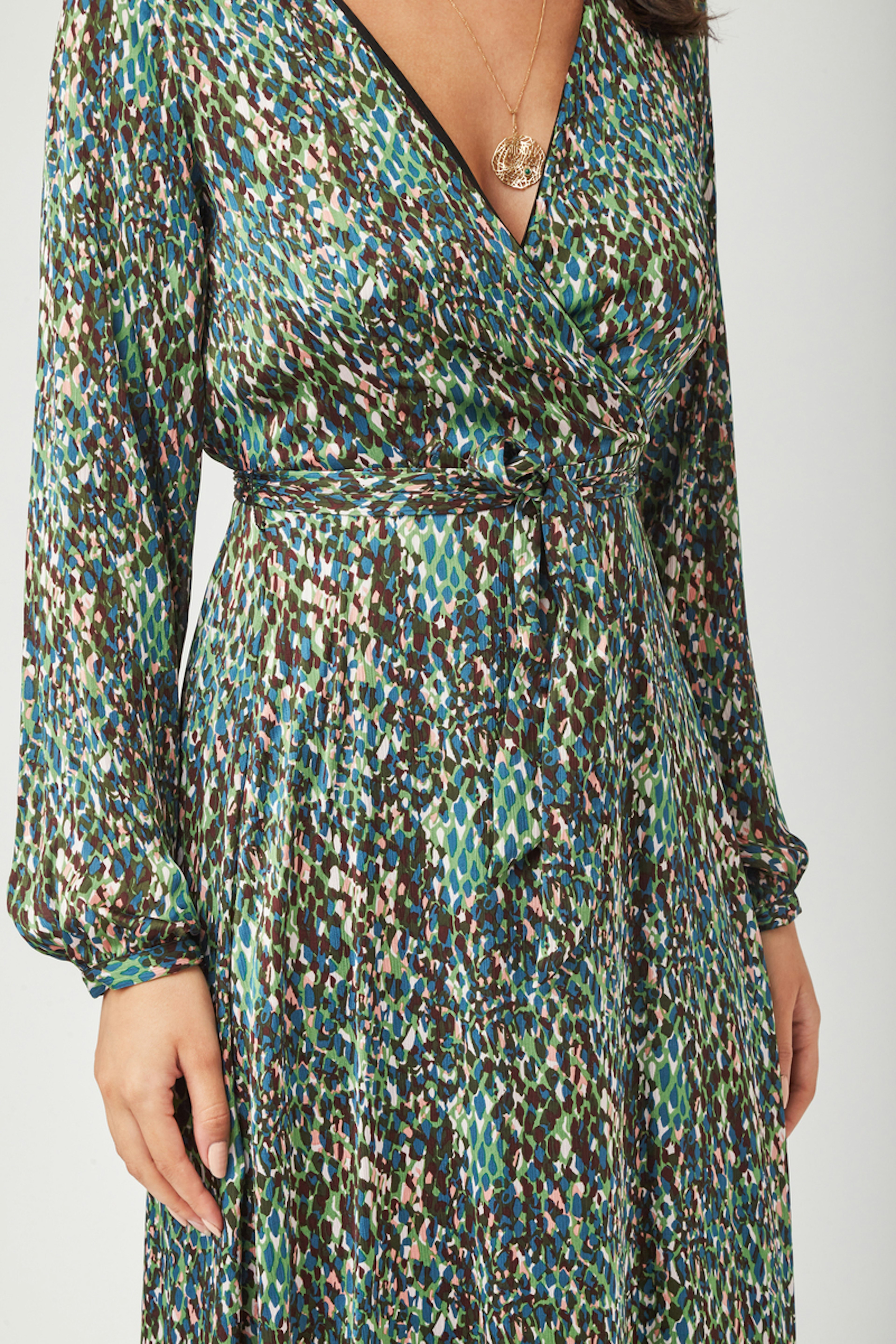 โข Robe longue ceinturรฉe โข Imprimรฉ bleu, vert, marron, รฉcru โข Col v โข Ceinture ton sur ton โข Manches longues resserrรฉes
