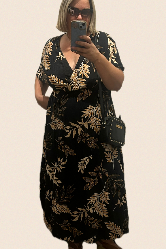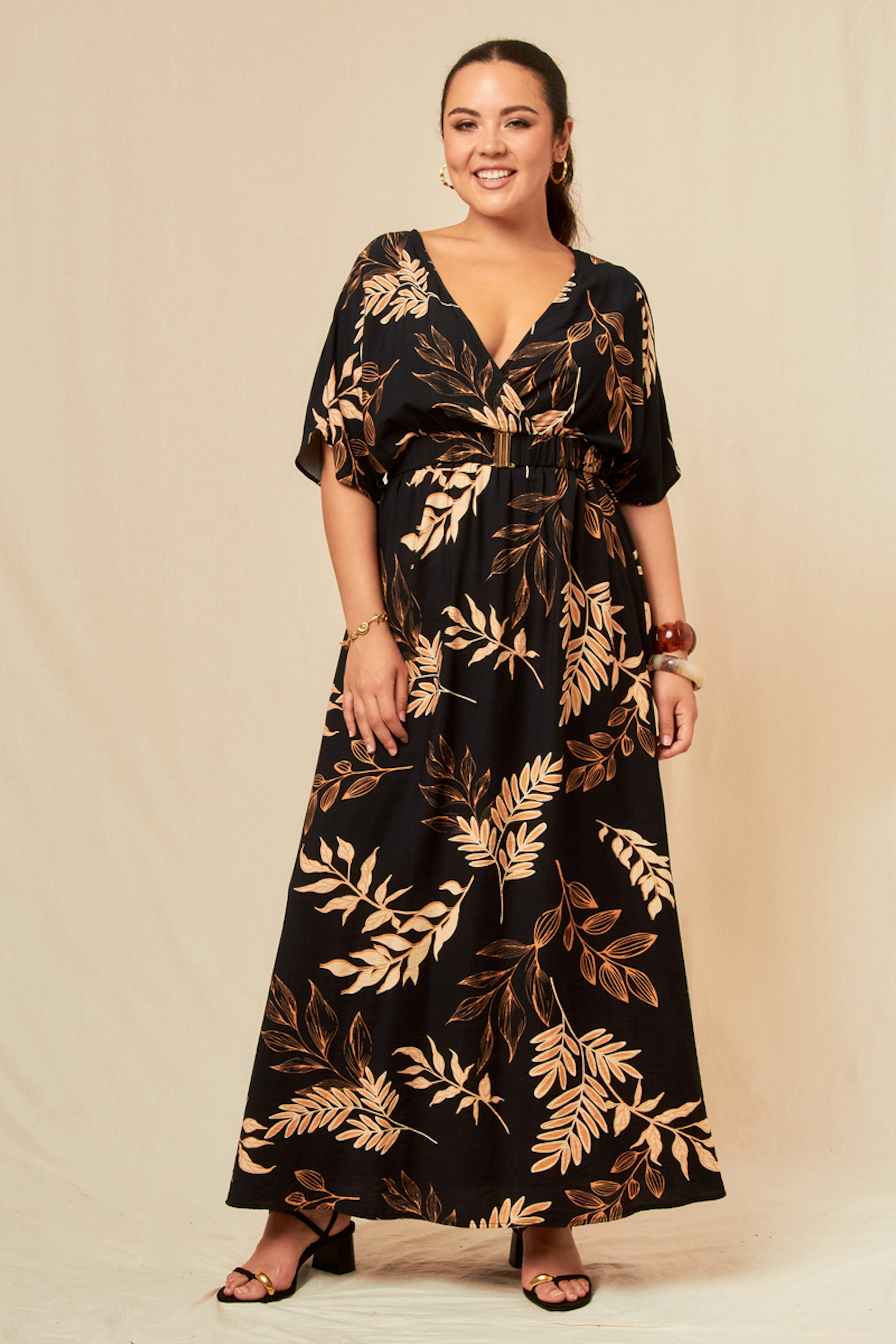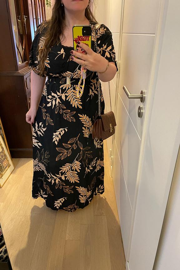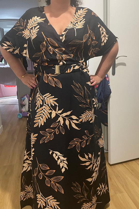Pour un look estival chic, associez cette robe avec des sandales dorées et des boucles d'oreilles pendantes. Parfait pour les journées ensoleillées. • Robe longue • Décolleté en V • Manches courtes • Ceinture intégrée • Motif imprimé