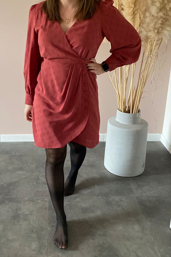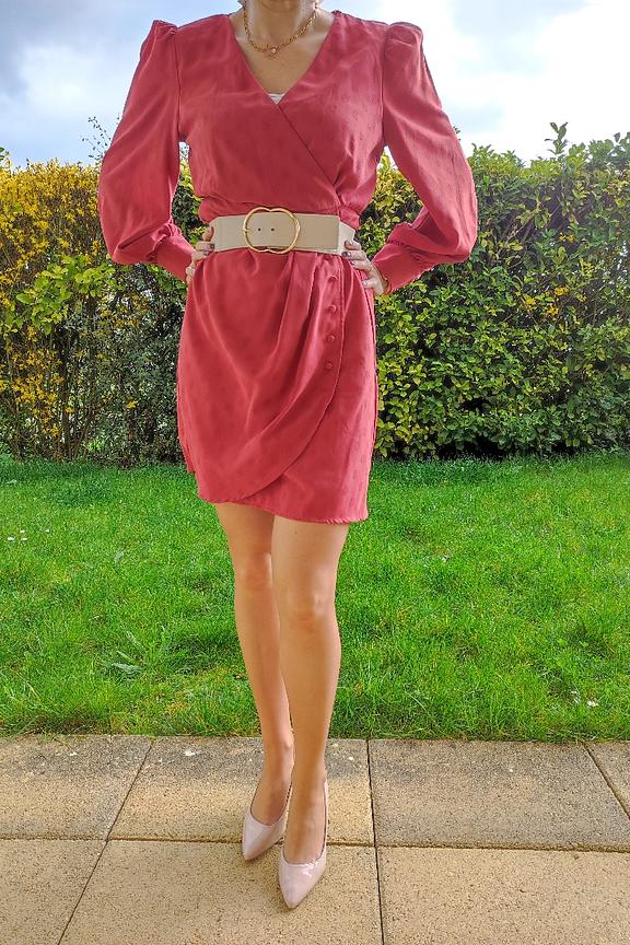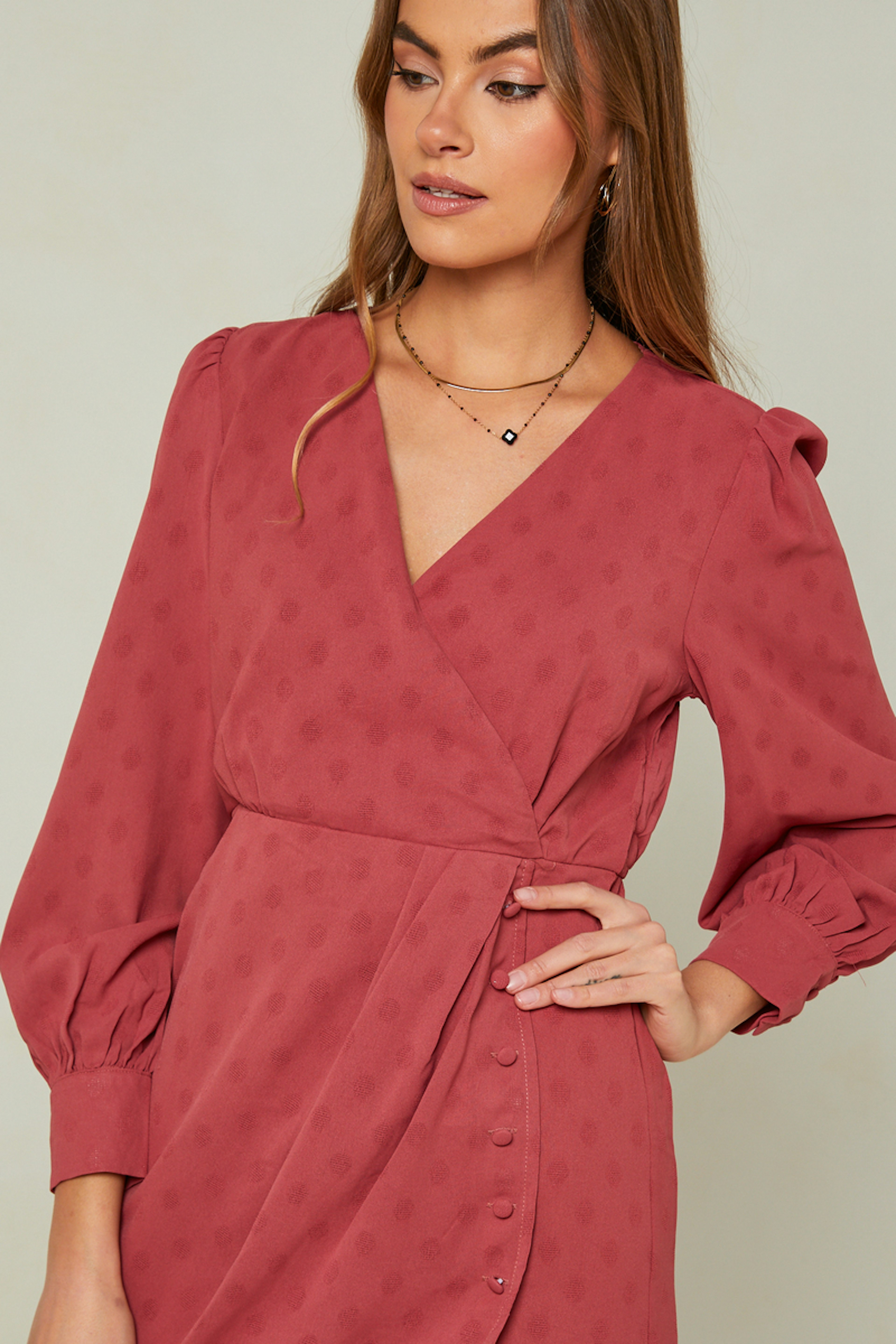 โข Robe courte rose โข Coupe portefeuille boutonnรฉe โข Boutons ton sur ton โข Col en V โข Manches longues avec ourlets boutonnรฉs et lรฉgers dรฉtails froncรฉs โข Petites รฉpaulettes โข Motifs ร pois ton sur ton