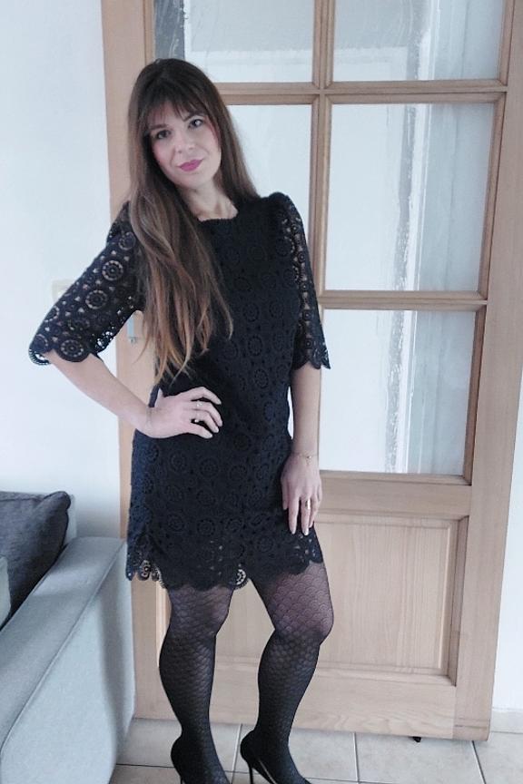 Envolez-vous pour une soirée étoilée avec cette robe en guipure noire, parfaite pour toute saison. Accompagnez-la d'escarpins et d'une pochette métallisée. • Robe courte en guipure noire • Coupe droite • Col rond • Manches et bas de robe festonnés • Goutte dans le dos fermée par un bouton fantaisie