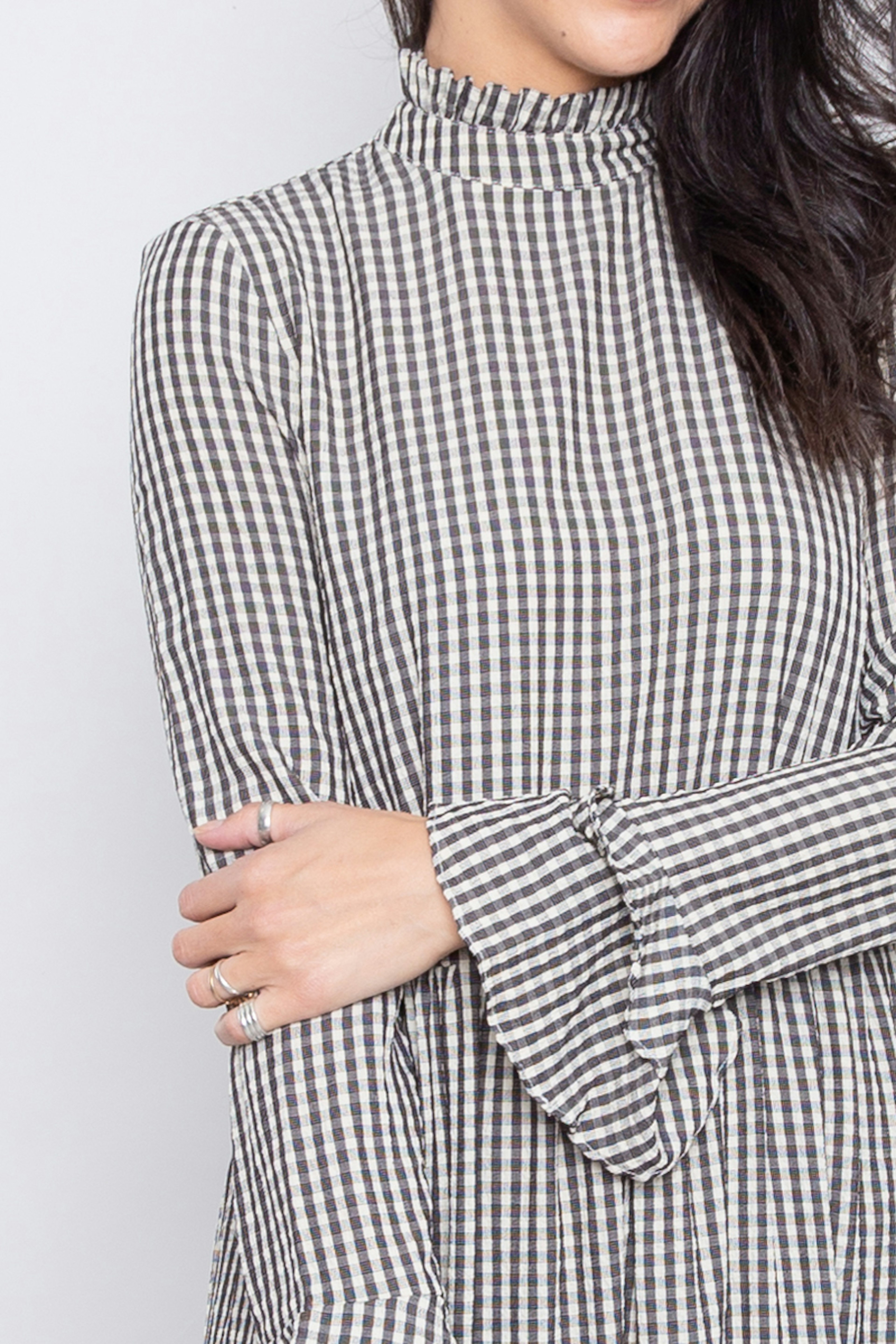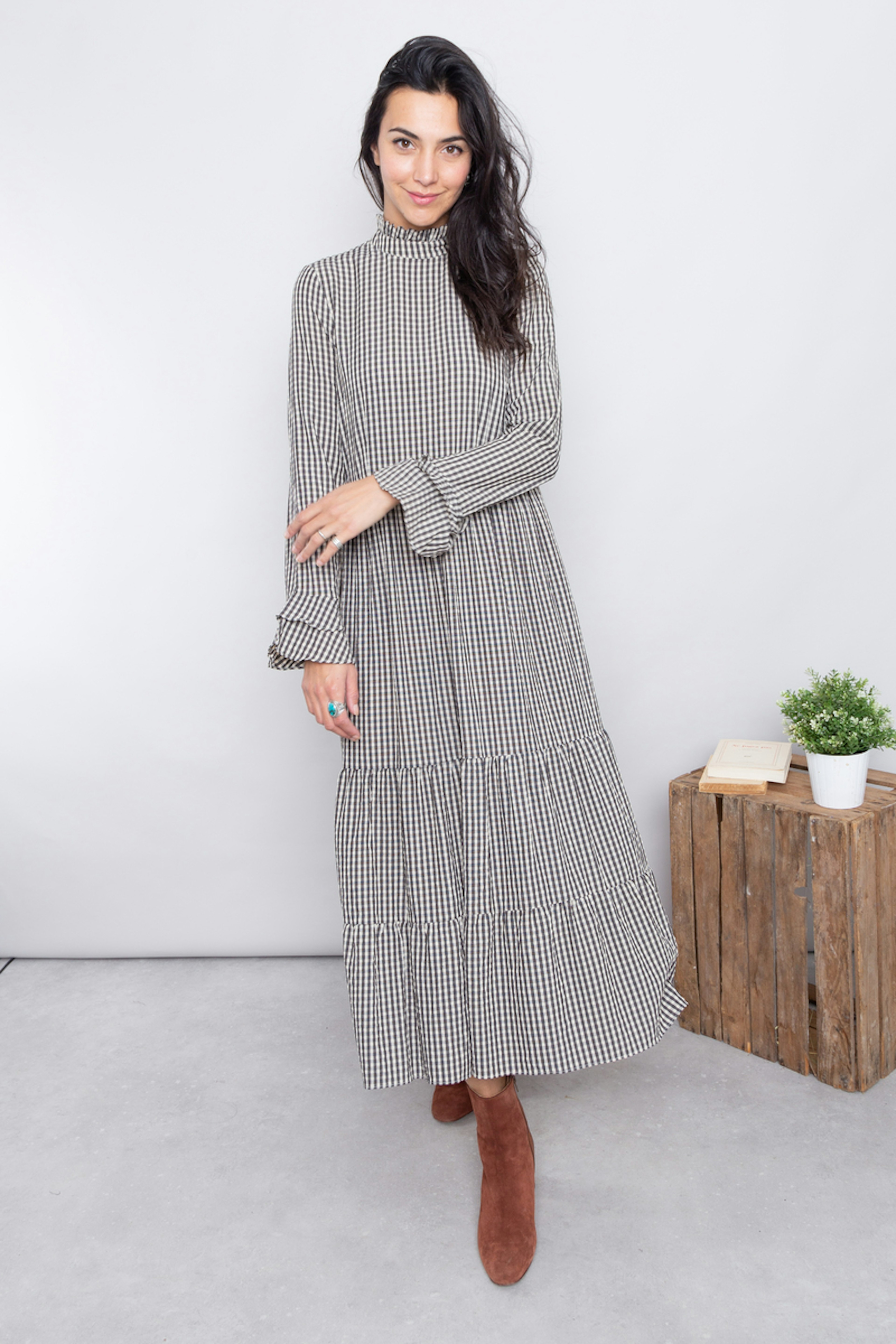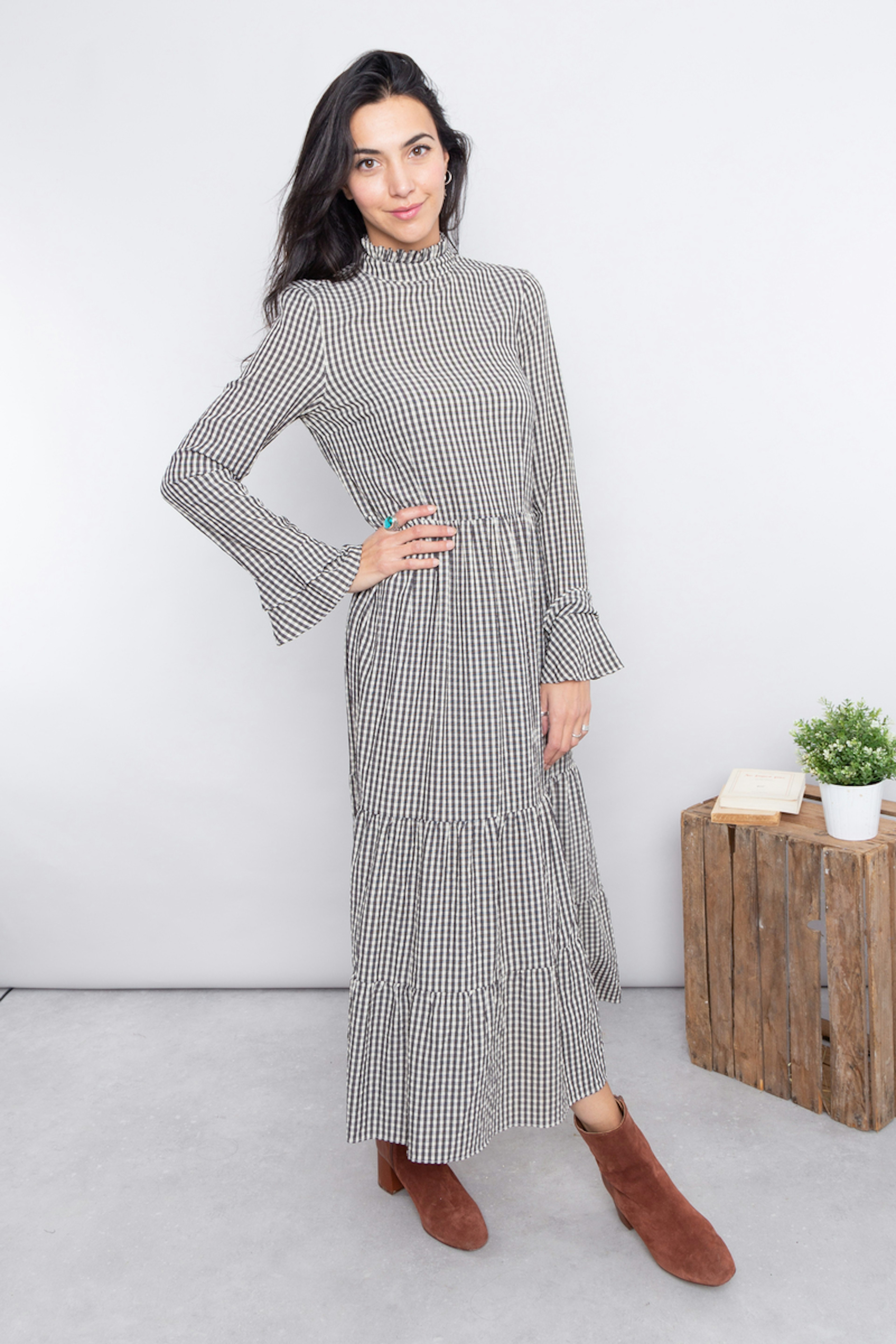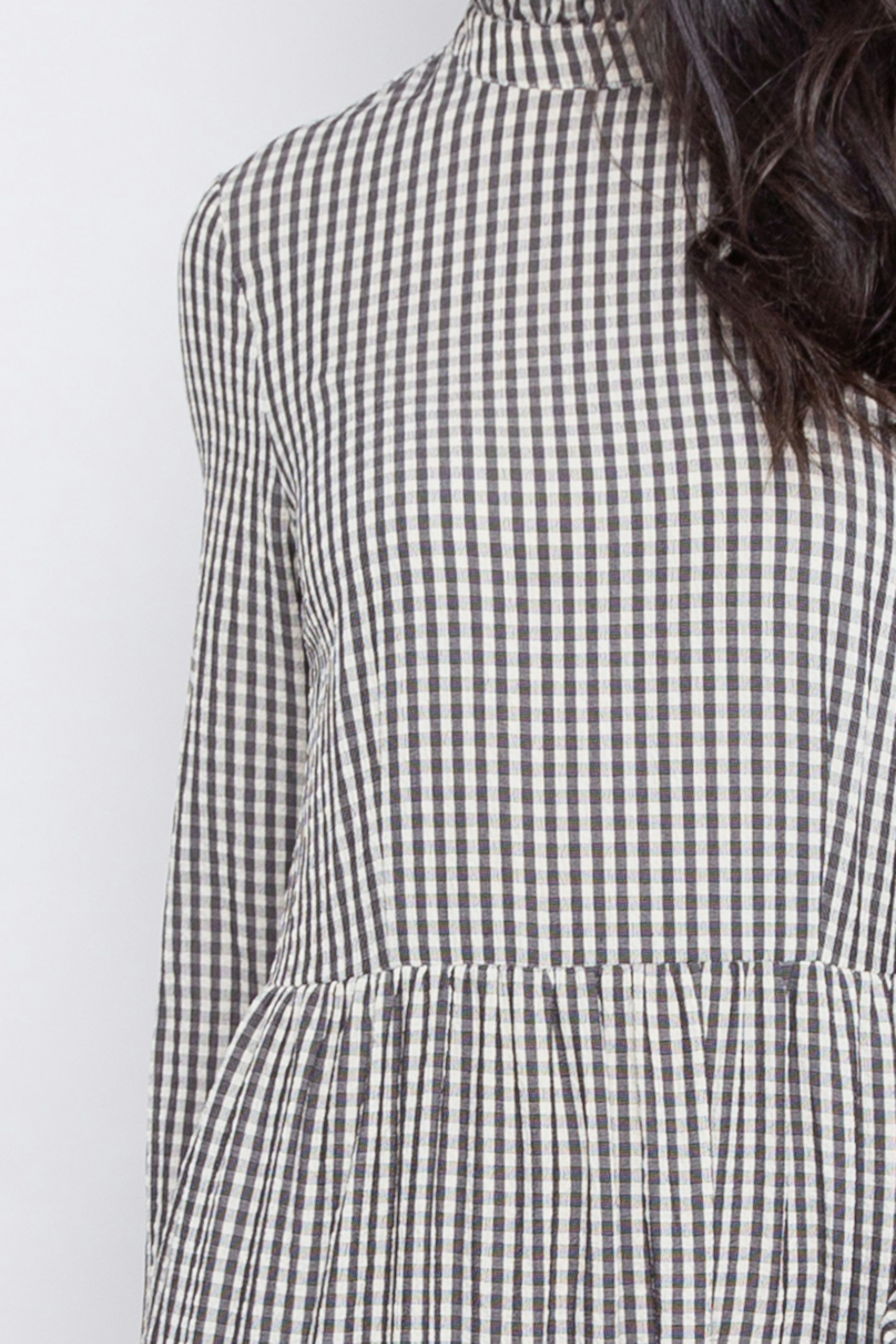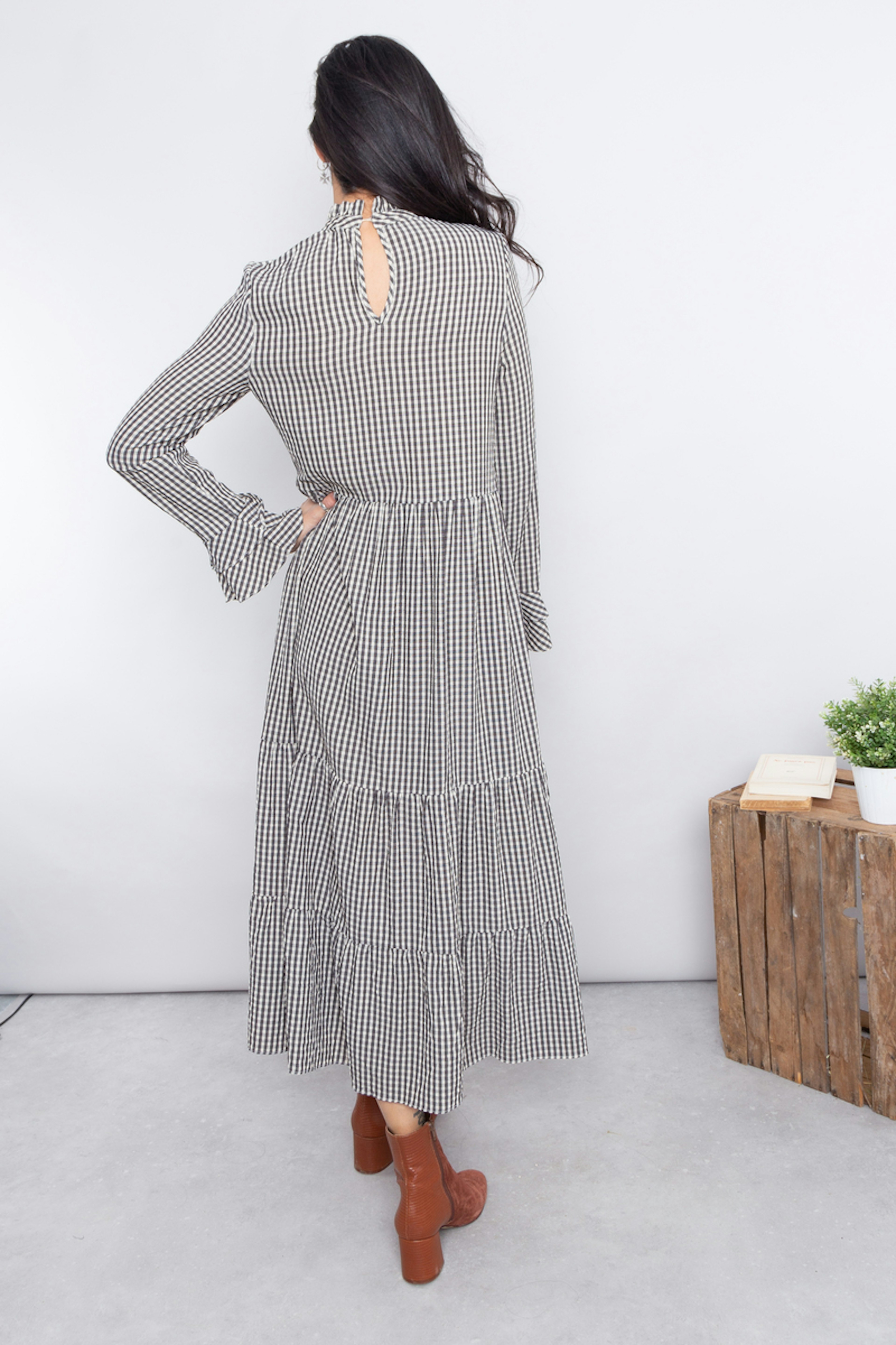 โข Robe longue โข Imprimรฉ vichy noir et blanc โข Manches longues รฉvasรฉes โข Col montant โข Ouverture goutte dans le haut du dos