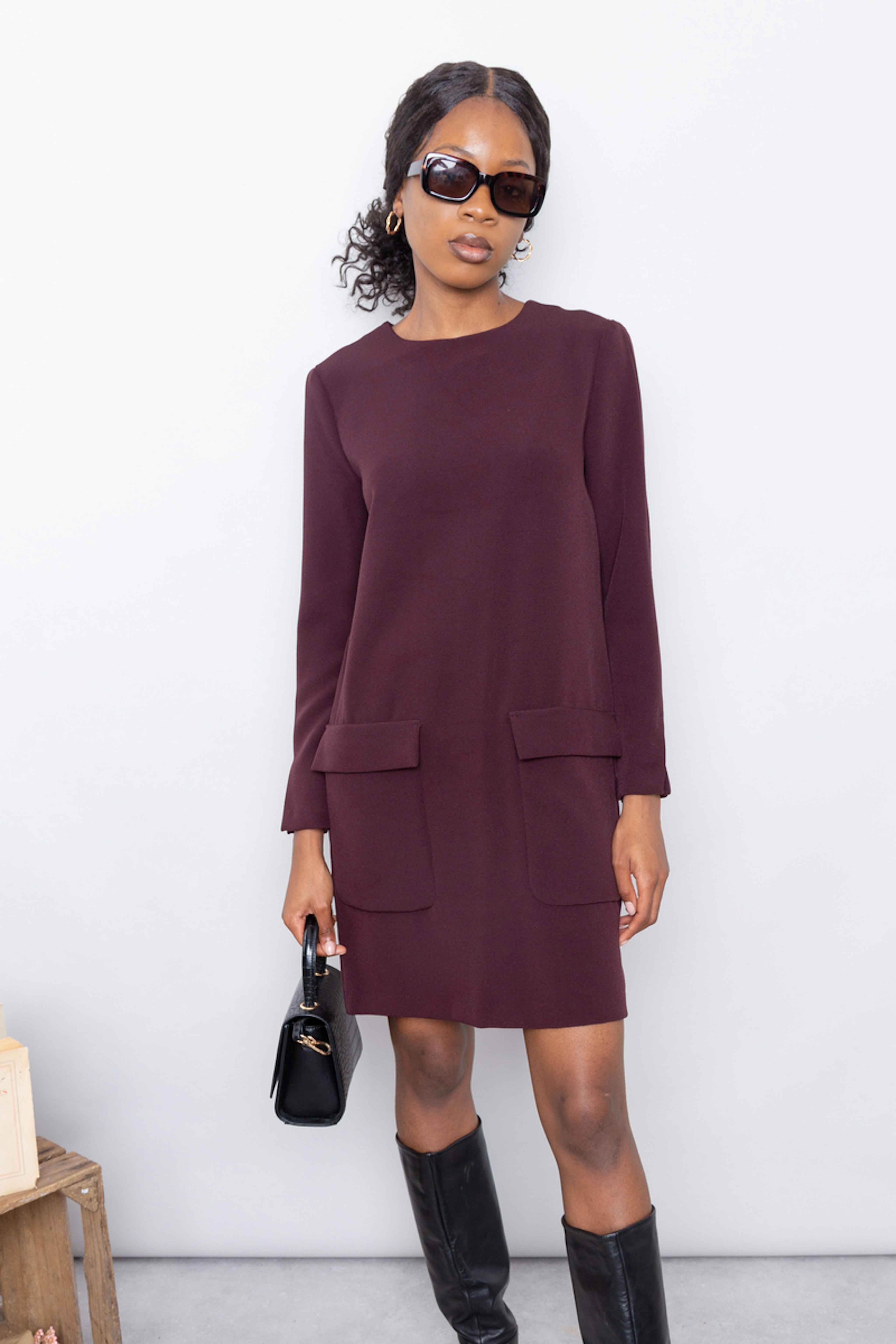 โข Robe bordeaux โข Coupe droite โข Col rond โข Poches plaquรฉes ร rabat sur le devant