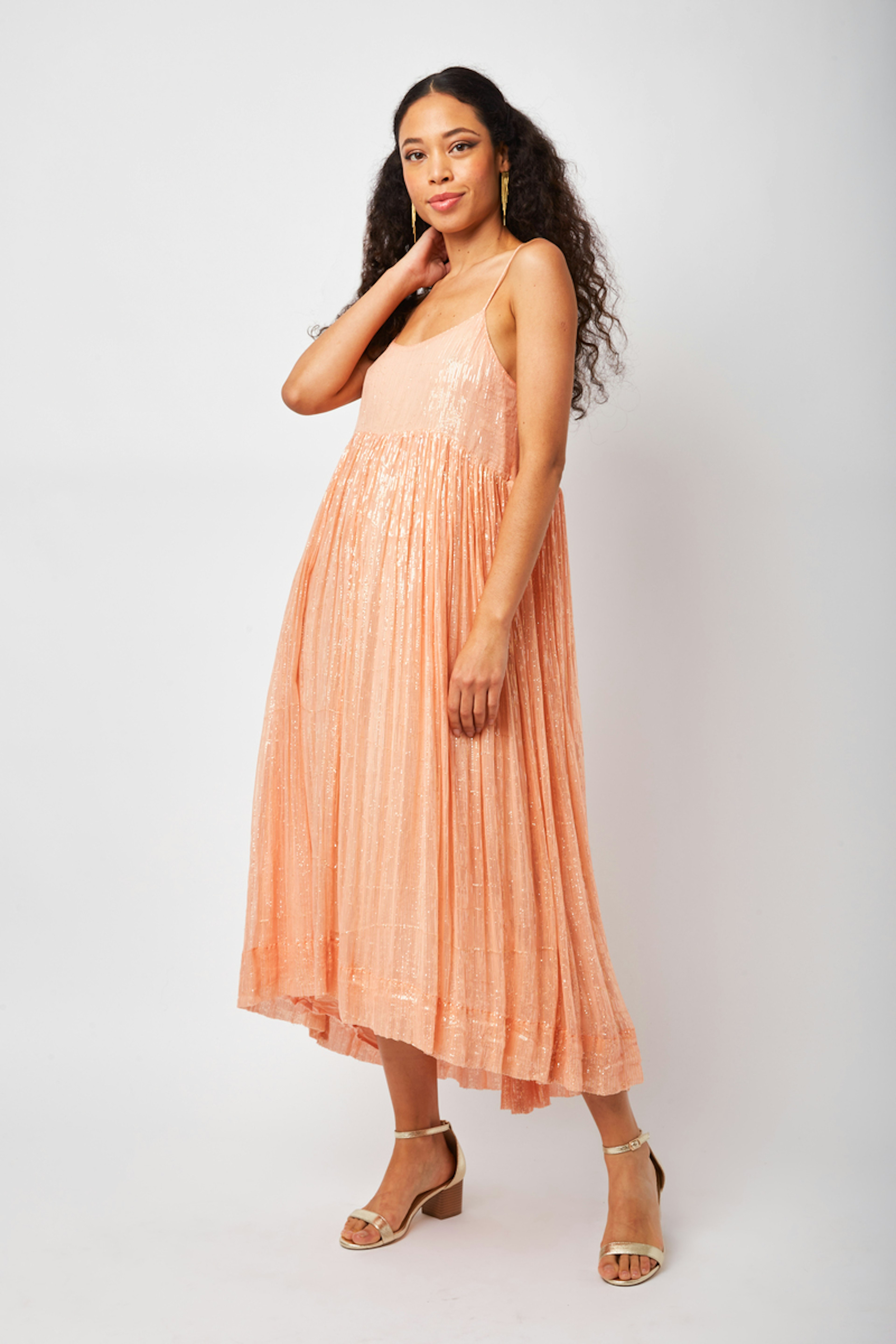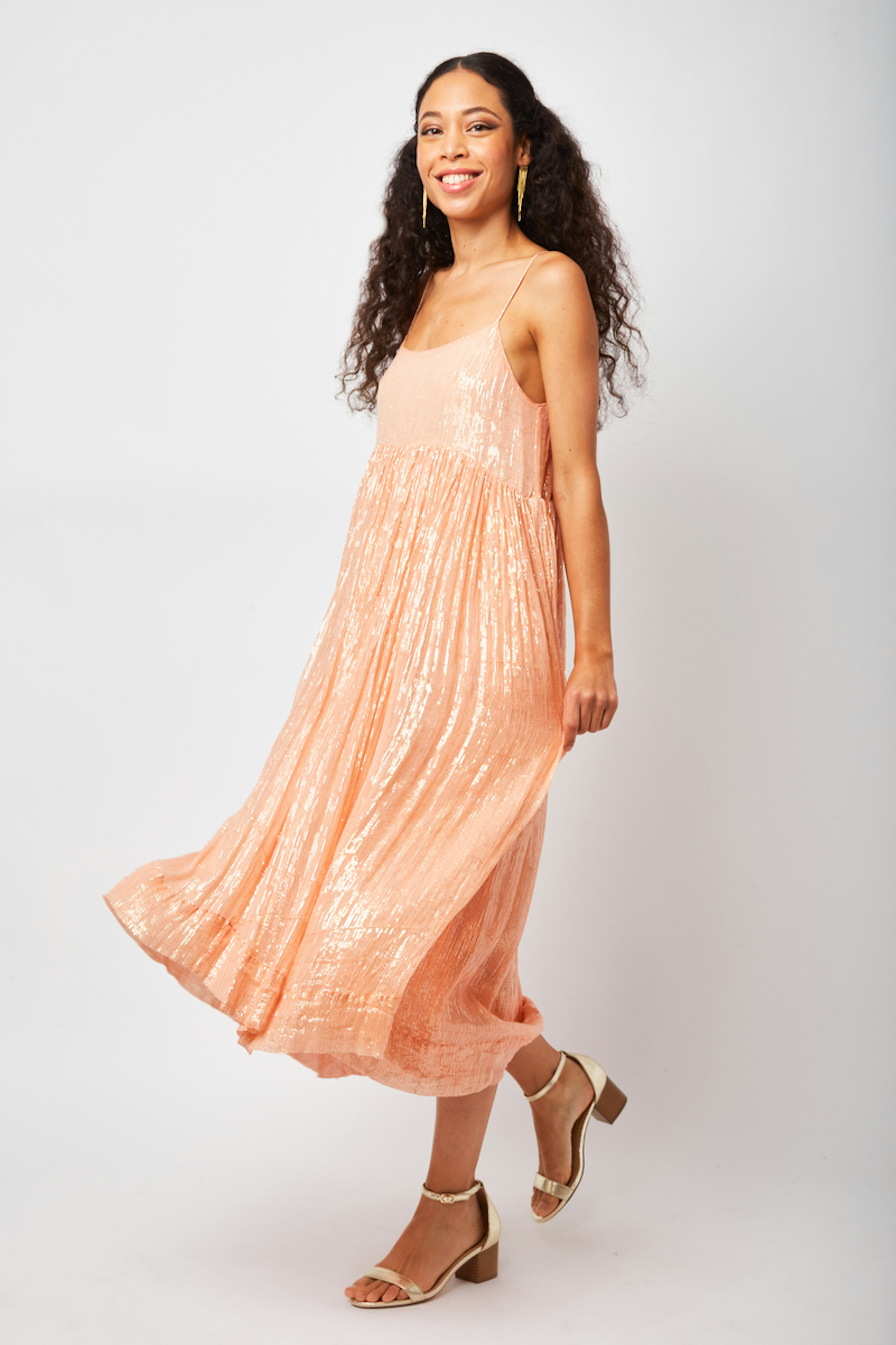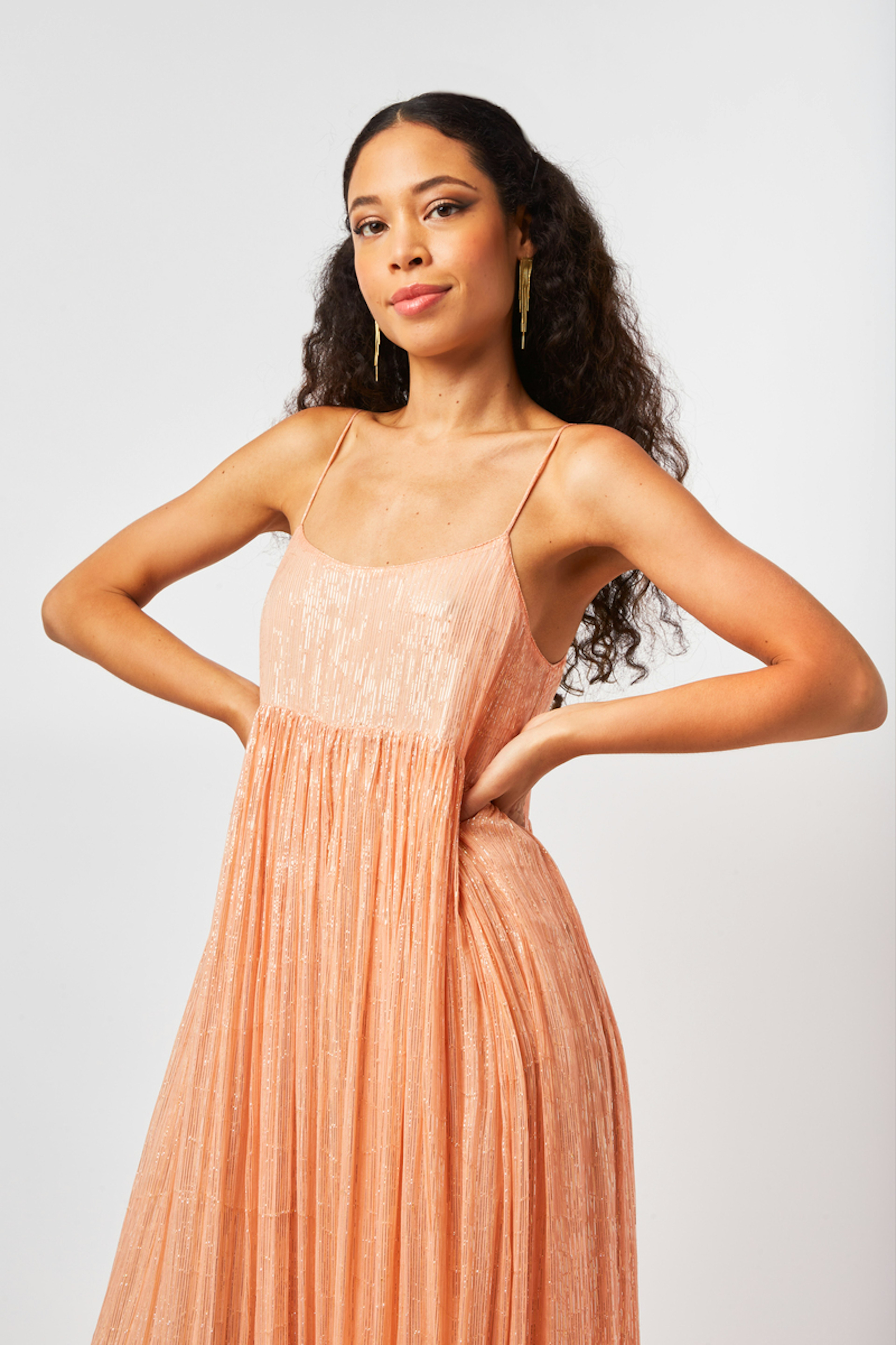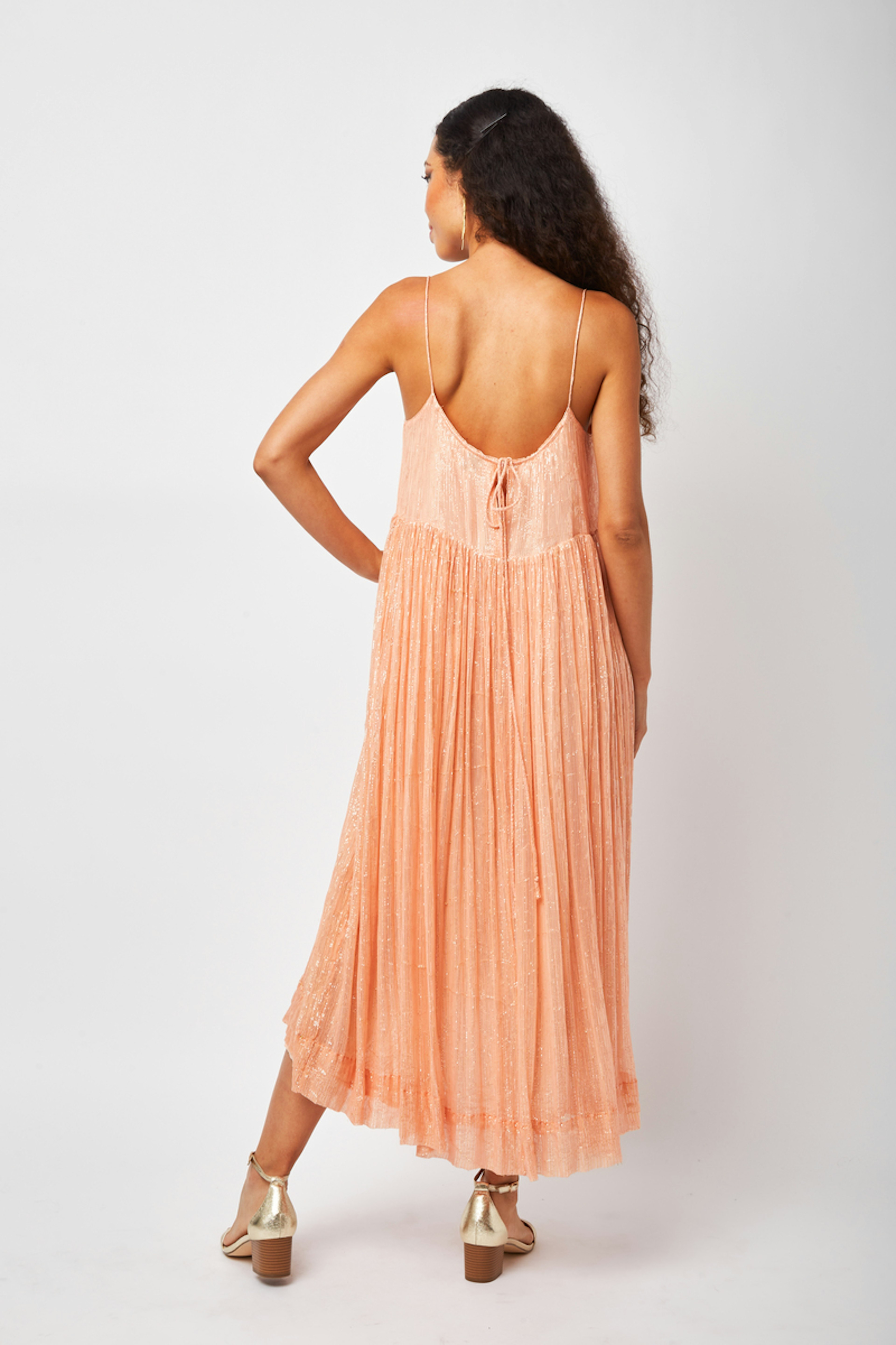 Ajoutez une touche d'รฉclat ร  vos soirรฉes estivales avec cette robe midi scintillante, parfaite pour toute saison. Associez-la ร  des sandales minimalistes pour un look chic et lumineux. โ€ข Robe midi pleine d'รฉclat โ€ข Tissu ornรฉ de fils brillants โ€ข Dos รฉchancrรฉ et nouรฉ discrรจtement โ€ข Voile rose avec lurex โ€ข Jeu de plis
