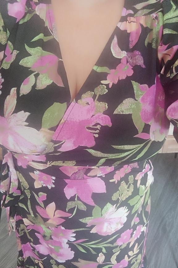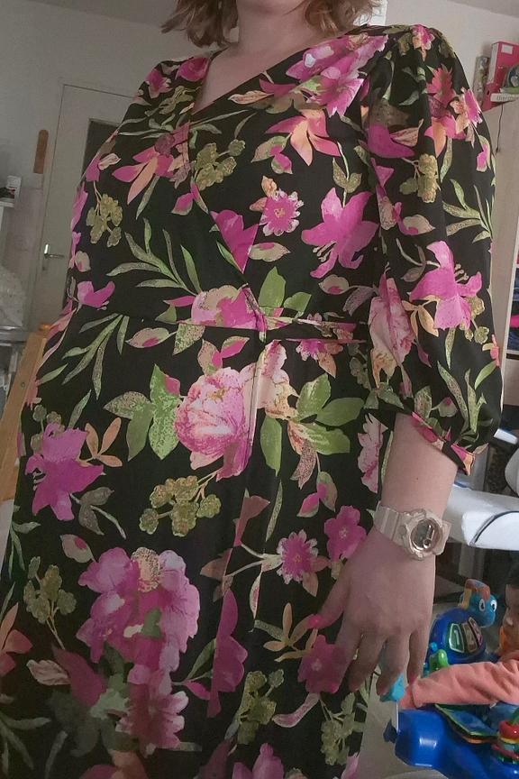 โRobe trรจs fรฉminine, mais statistique, mรชme avec un dessous de robe. Taille grand mais le principe cache coeur fait que cela ne se voit pas tant que รงaโ