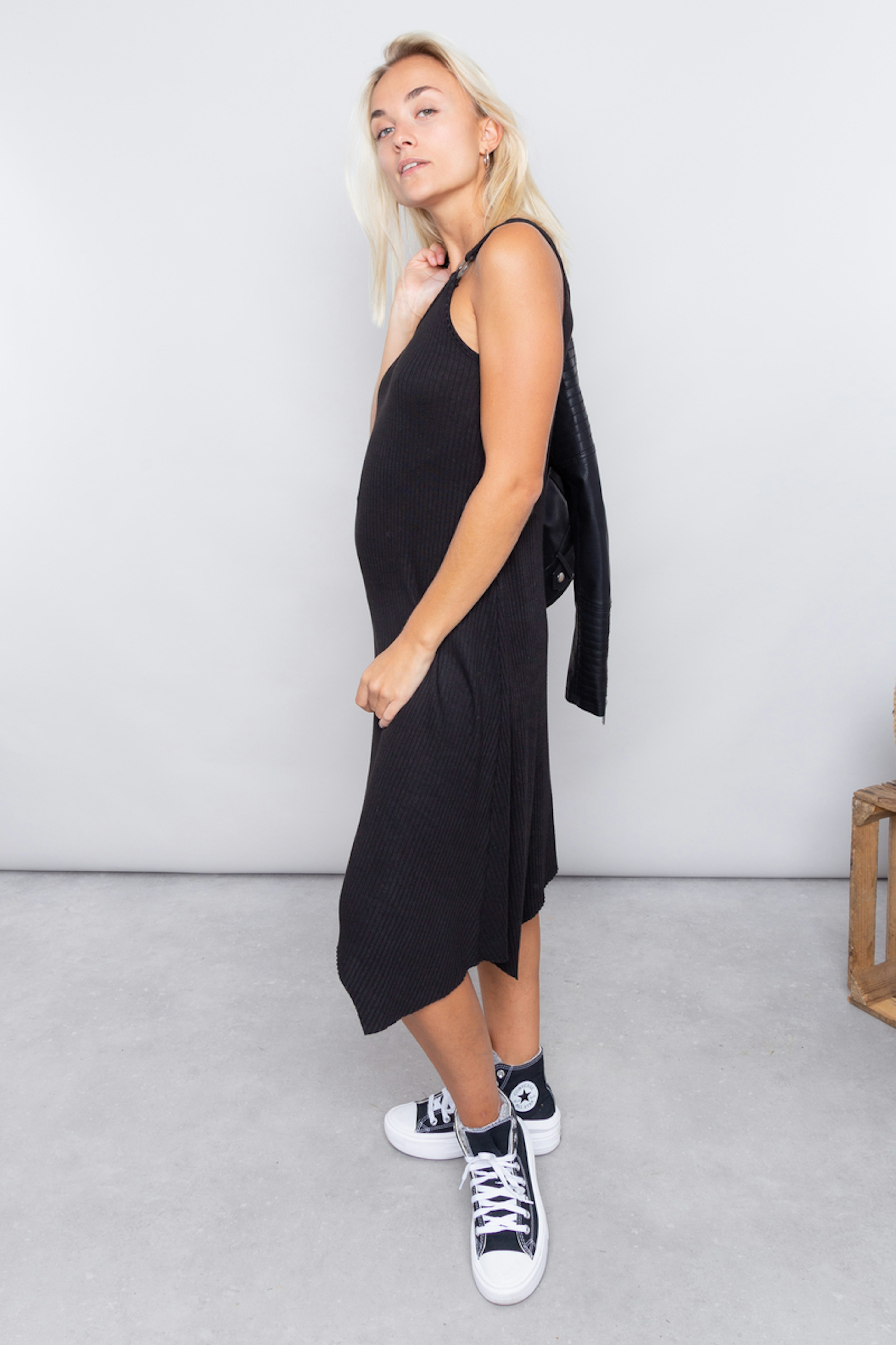 โข Robe en matiรจre petit pull lรฉger noir โข Bretelles avec anneaux โข Coupe asymรฉtrique โข Longueur : en dessous des genoux
