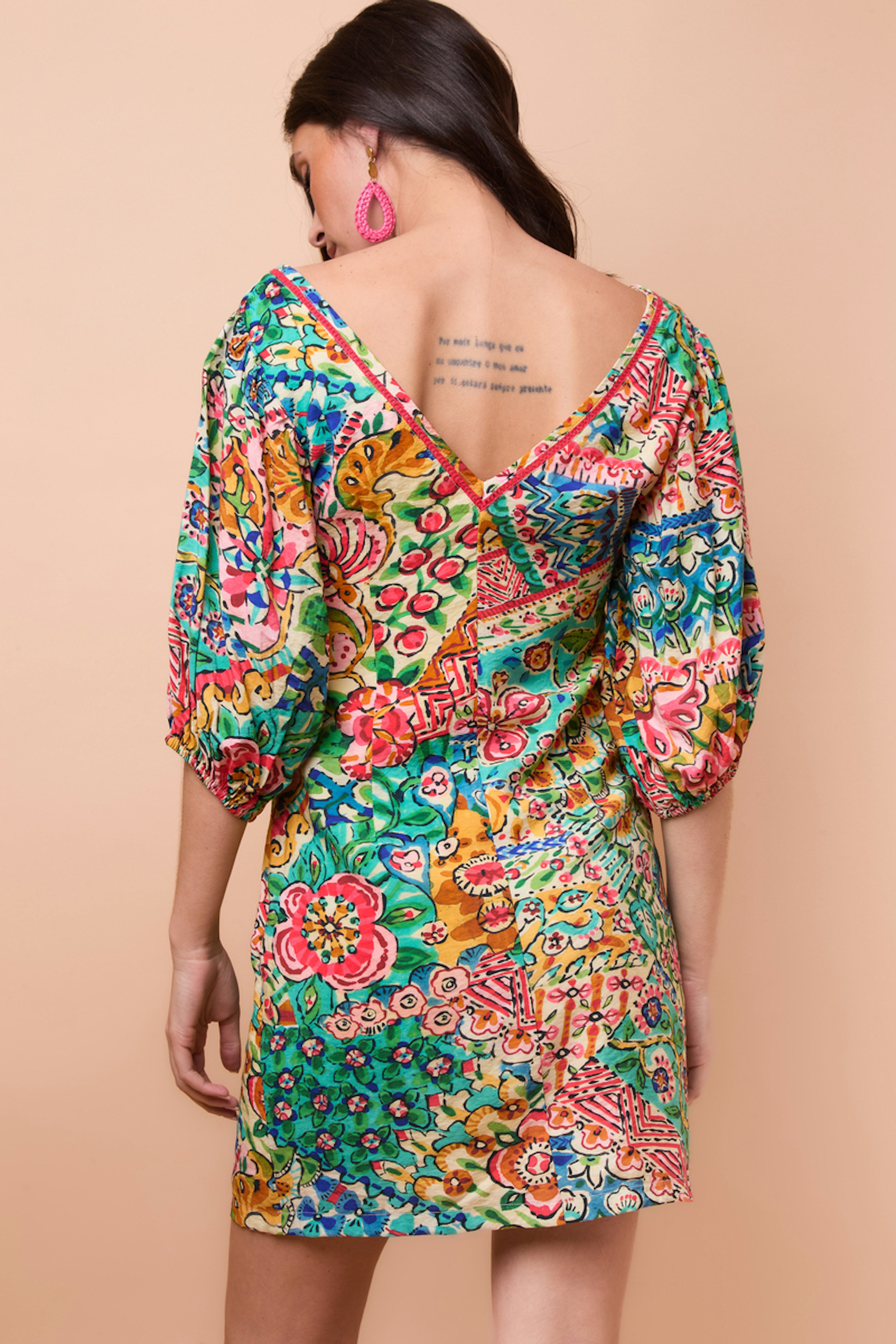 Associez cette robe colorée à des sandales dorées et un chapeau en paille pour une journée estivale parfaite. • Robe courte imprimée • Encolure en V flatteuse • Manches trois-quarts élégantes • Taille ajustée • Motif floral vibrant