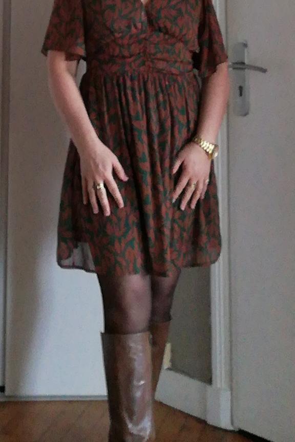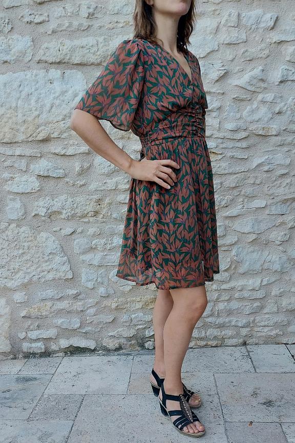 โข Robe courte ร imprimรฉs nature oranges et verts โข Doublรฉe โข Col en V โข Manches 3/4 larges โข Lรฉgรจres รฉpaulettes โข Taille marquรฉe par un empiรจcement โข Tissu fluide