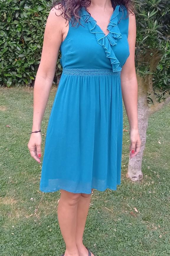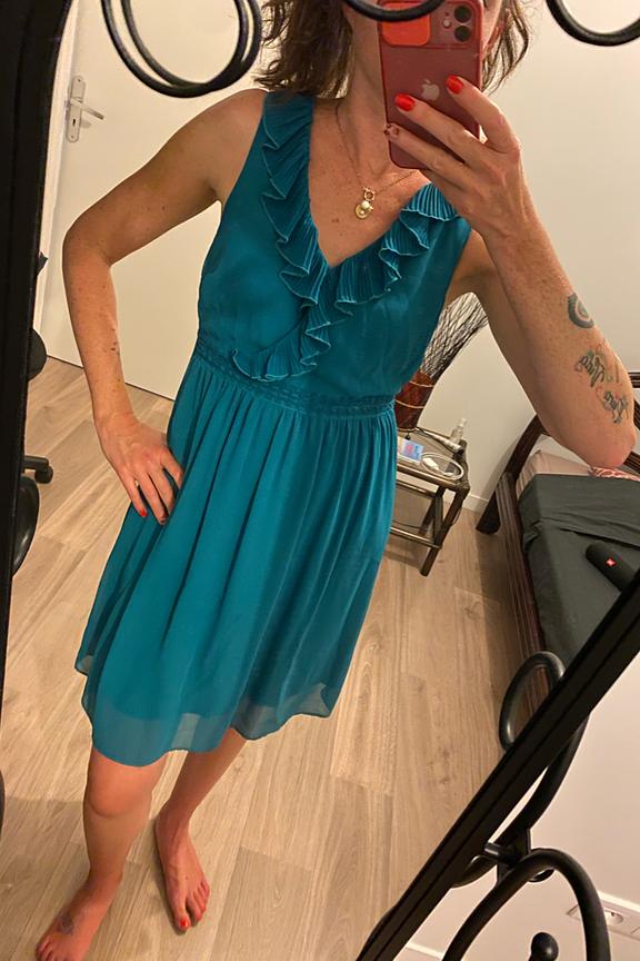 โข Robe sans manches unie verte โข Longueur genou โข Col V volantรฉ โข Ceinture avec dรฉtails de broderies โข Tissu fluide